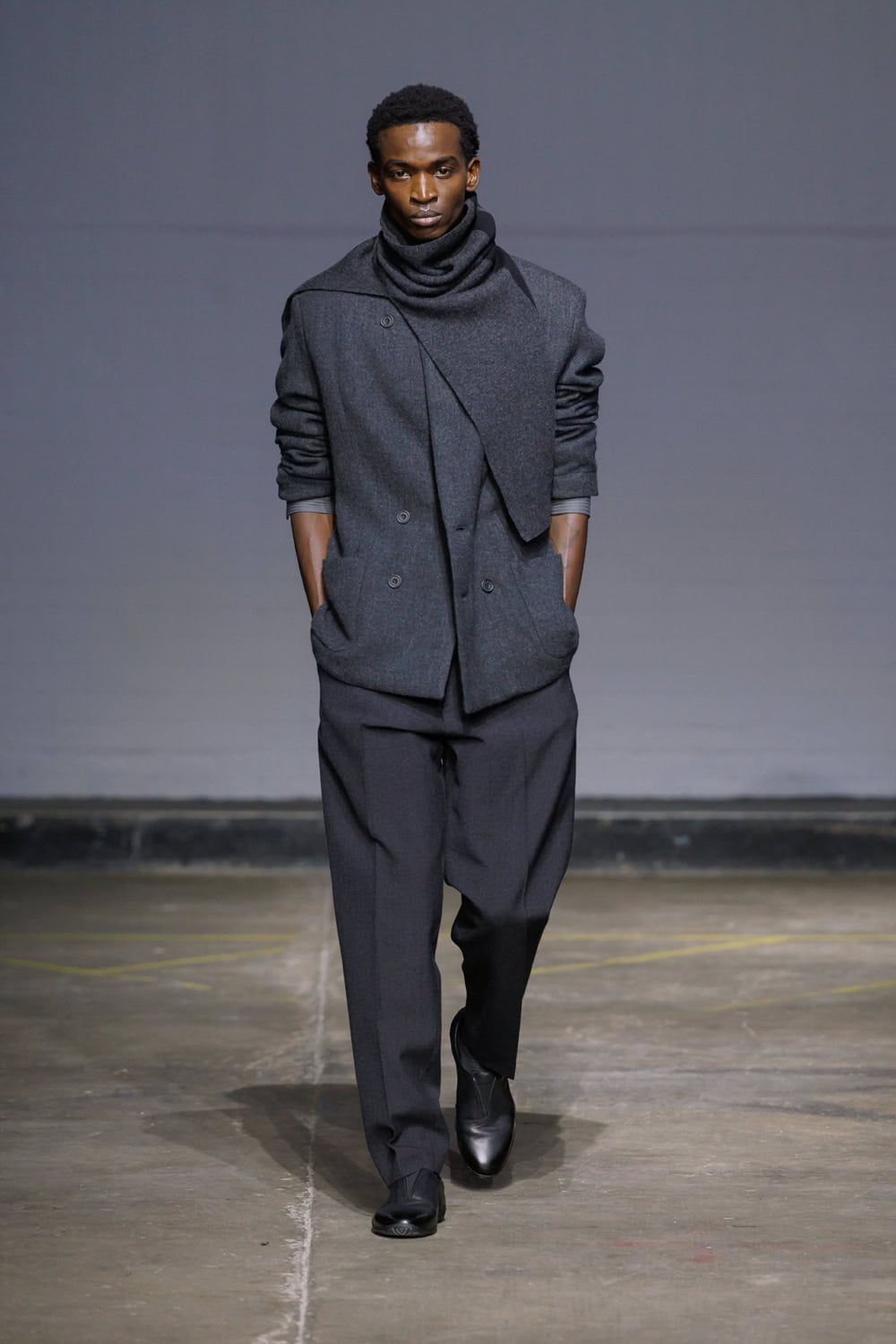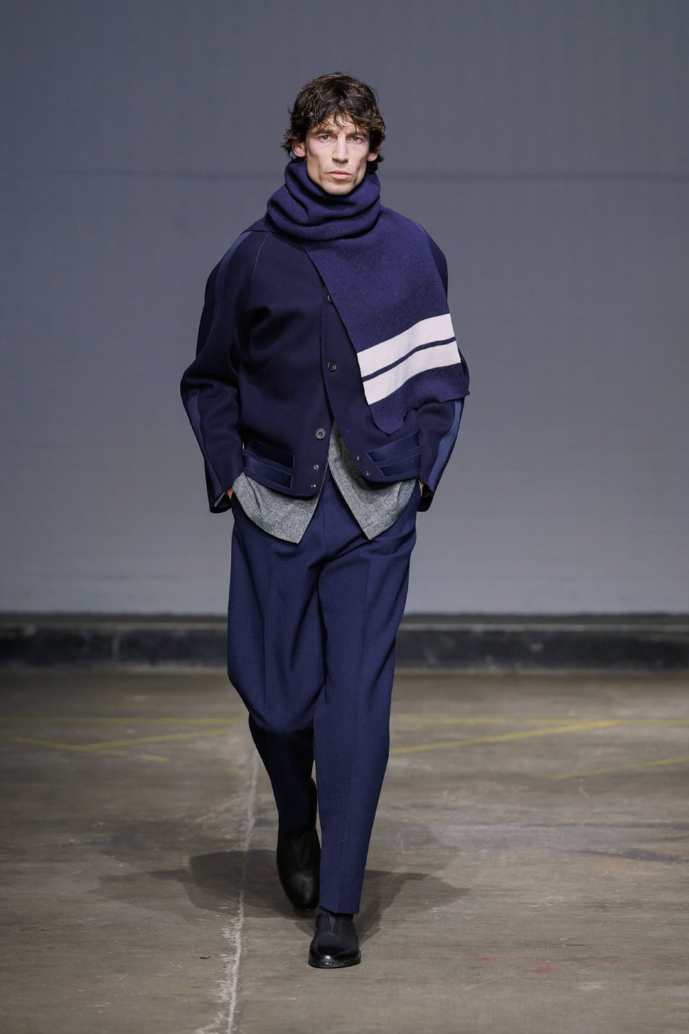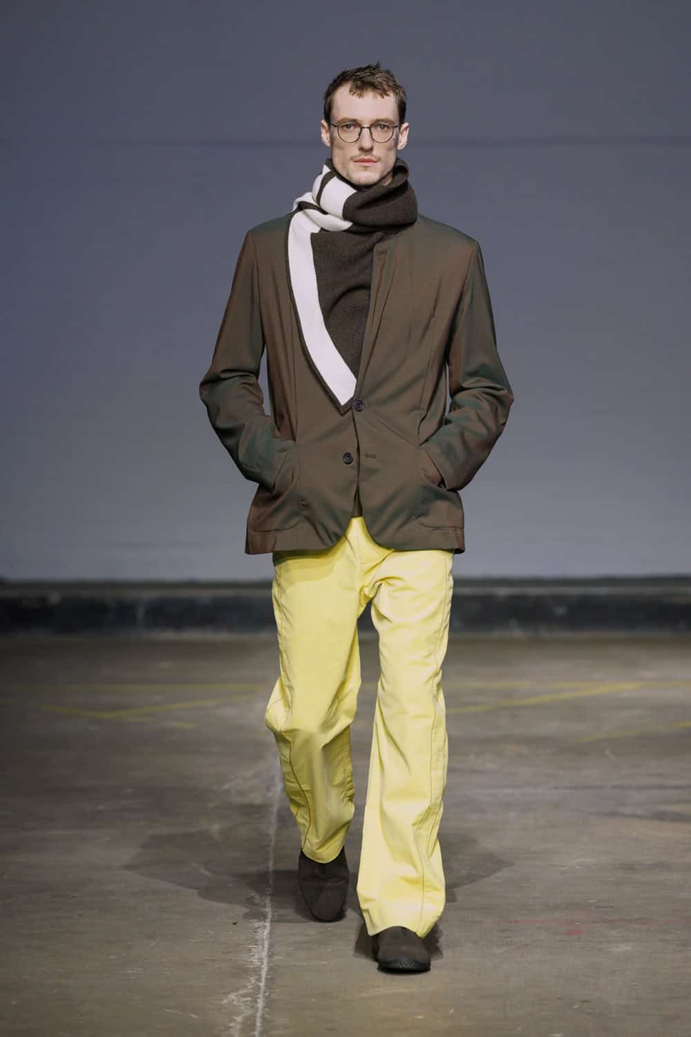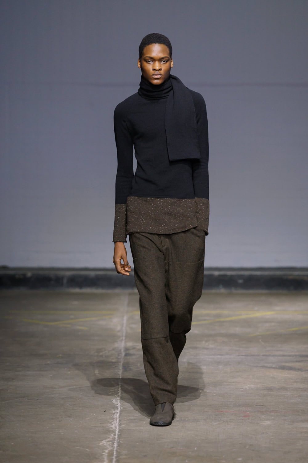 Earlier this month, Luke Derrick made the shortlist to this year’s LVMH Prize. As one of only a handful of menswear designers showing as part of London Fashion Week this season, the CSM alum has found a sweet spot through tweaking classic menswear codes with modern flair. He thinks about the inner city lad, who wants a decent fit, something smart to wear, without committing to a prim and proper suit. His trousers, cut from corduroy and heavy wools, adopt the slouch of a pair of trackies, with sporty piping up the side.
