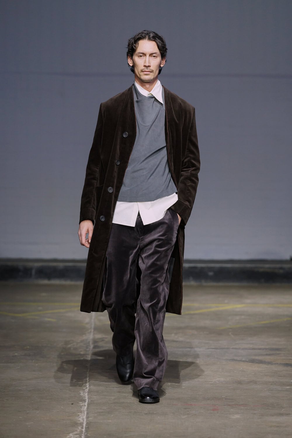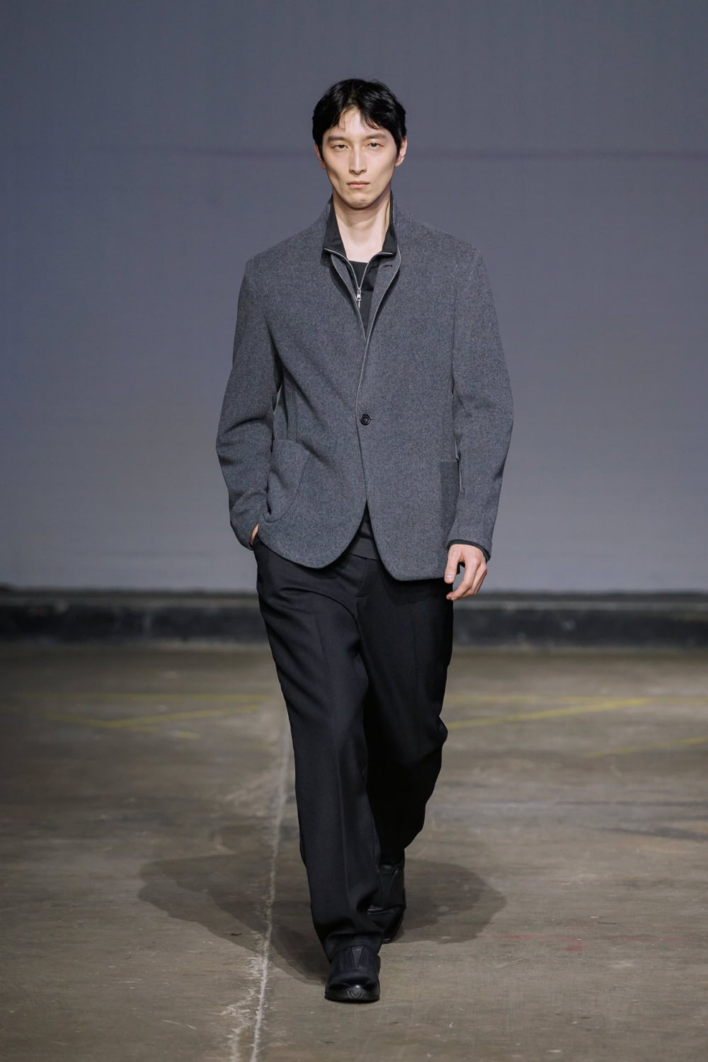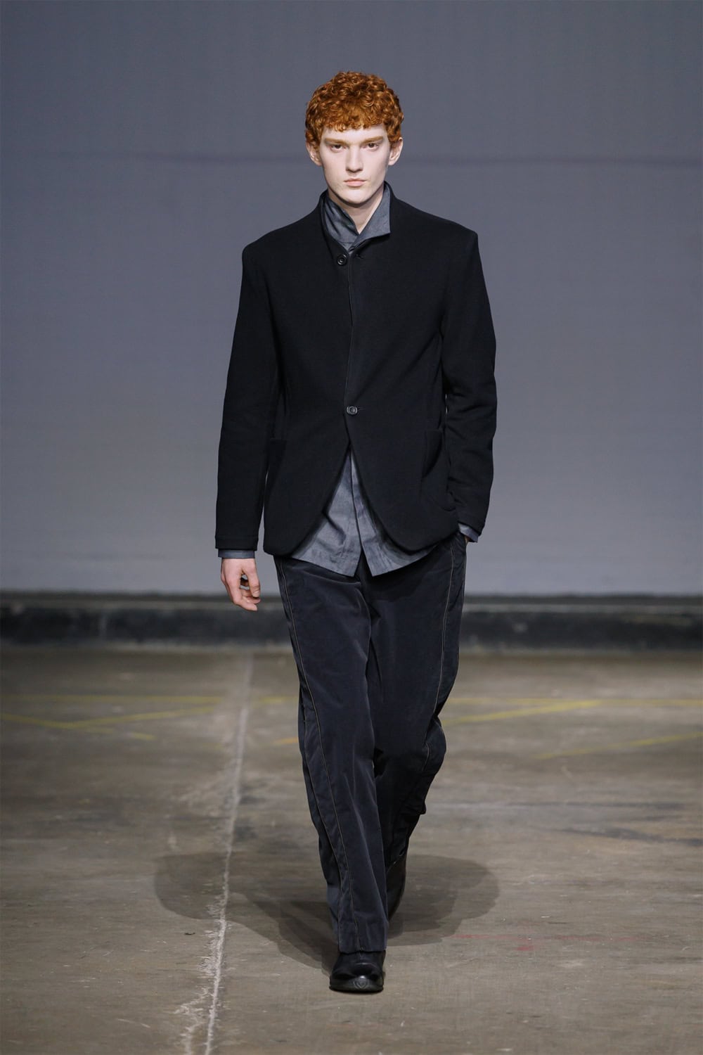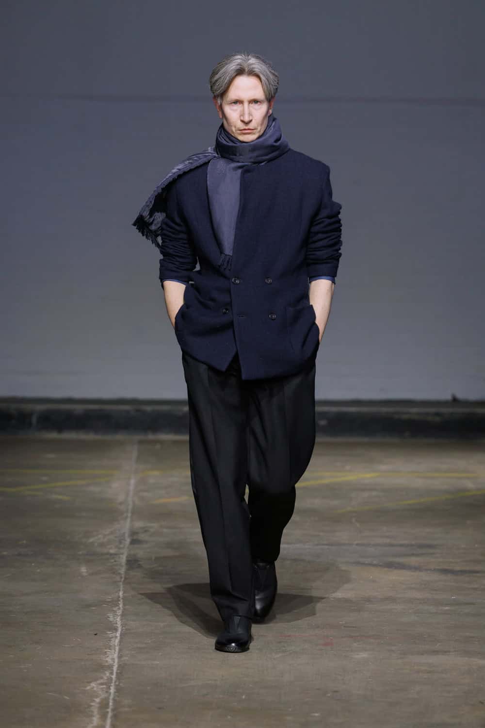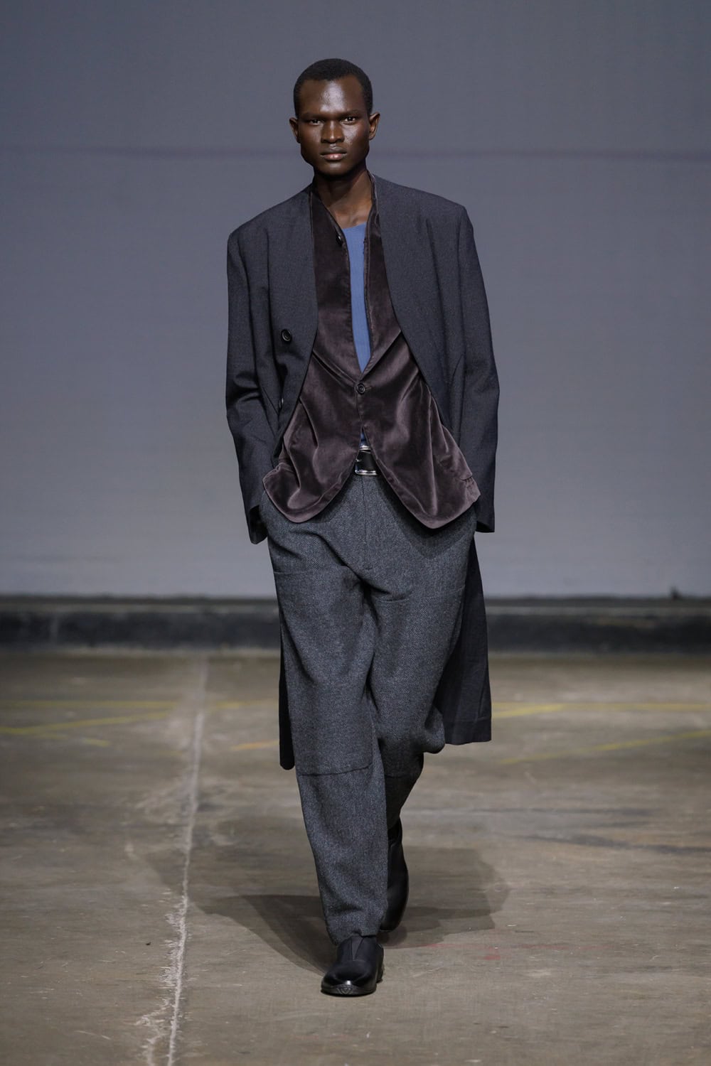 Earlier this month, Luke Derrick made the shortlist to this year’s LVMH Prize. As one of only a handful of menswear designers showing as part of London Fashion Week this season, the CSM alum has found a sweet spot through tweaking classic menswear codes with modern flair. He thinks about the inner city lad, who wants a decent fit, something smart to wear, without committing to a prim and proper suit. His trousers, cut from corduroy and heavy wools, adopt the slouch of a pair of trackies, with sporty piping up the side.