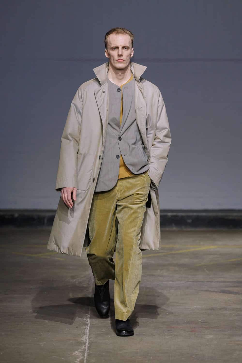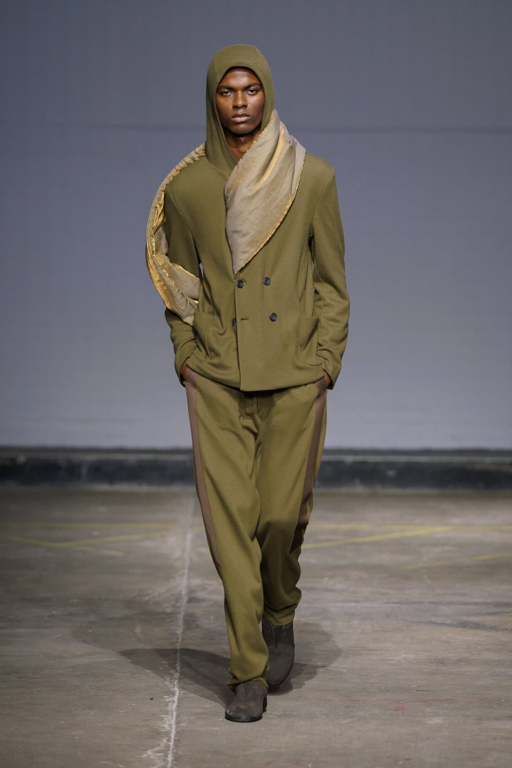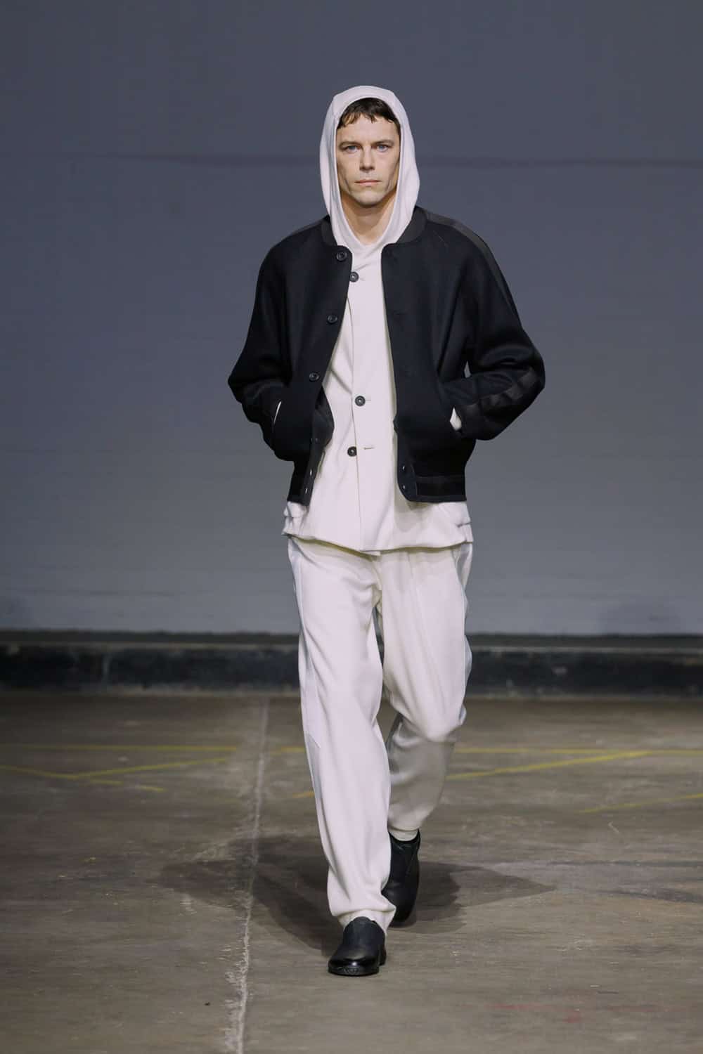 Derrick is looking to dress the people he’s surrounded by day-to-day and reflects a London sensibility when it comes to dressing a look up or down. Like chucking a waterproof under a dinner jacket for the Lime Bike home from the pub, for instance. His clothes are practical without dampening their elegance. Suit jackets in olive and white came with built in hoods, car coats were roomy at the shoulder and shirts were tucked under smock tops to introduce a slightly techy feel to some of the looks. They’re the sort of pieces you could integrate into your daily rotation with ease and could make boozing around Dalston feel like something of an event.