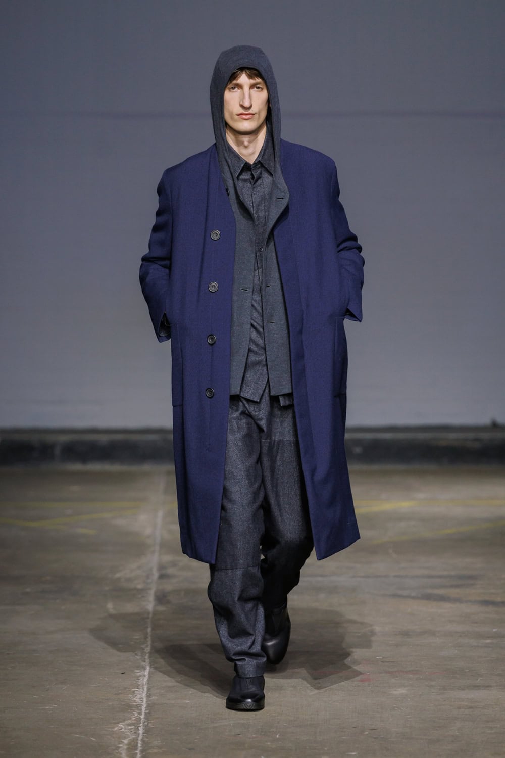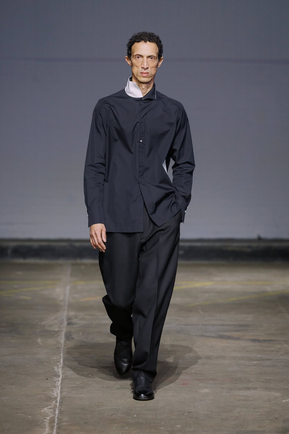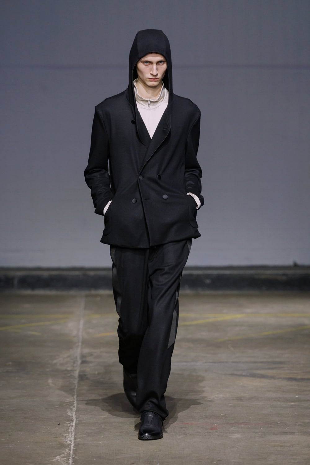 Derrick is looking to dress the people he’s surrounded by day-to-day and reflects a London sensibility when it comes to dressing a look up or down. Like chucking a waterproof under a dinner jacket for the Lime Bike home from the pub, for instance. His clothes are practical without dampening their elegance. Suit jackets in olive and white came with built in hoods, car coats were roomy at the shoulder and shirts were tucked under smock tops to introduce a slightly techy feel to some of the looks. They’re the sort of pieces you could integrate into your daily rotation with ease and could make boozing around Dalston feel like something of an event.