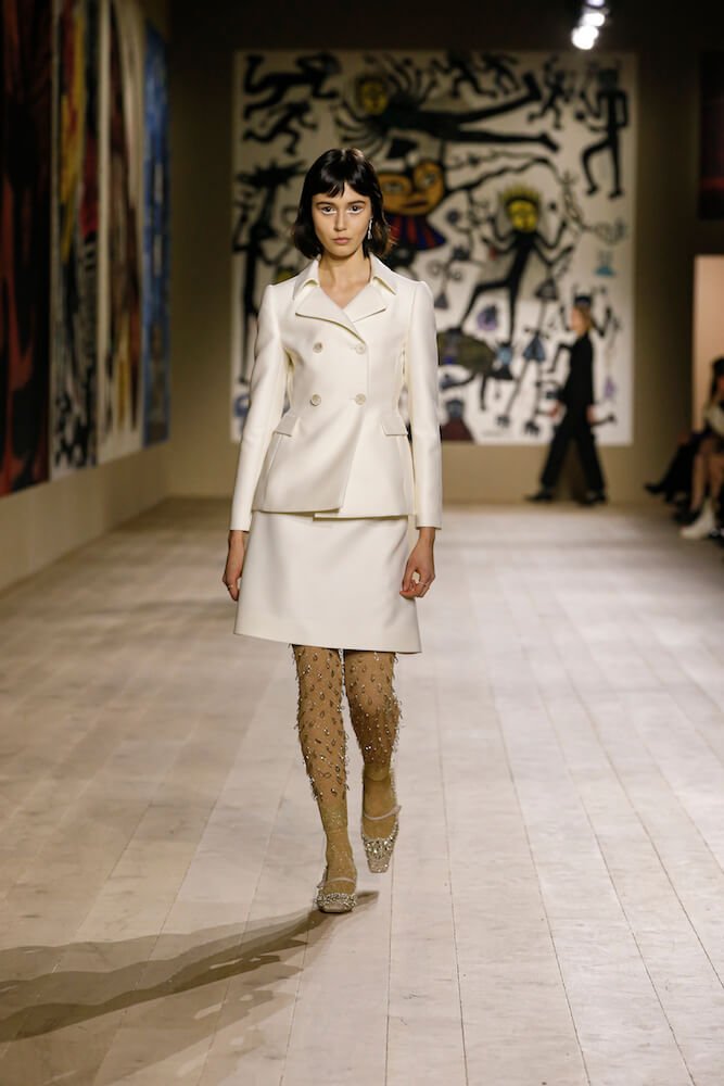 Maria Grazia Chiuri did not disappoint at yesterday’s Dior couture show, which was shown at the Musee Rodin in Paris under a stunning art show by artists Madhi and Manu Parekh. You hear a lot about the craft that is involved in a specific dress or a jacket when it comes to couture. In Dior’s case, it packed a punch from the get-go, starting with a bodysuit in a geometric stitch embroidery with crystals and leggings that would elevate any exercise class.