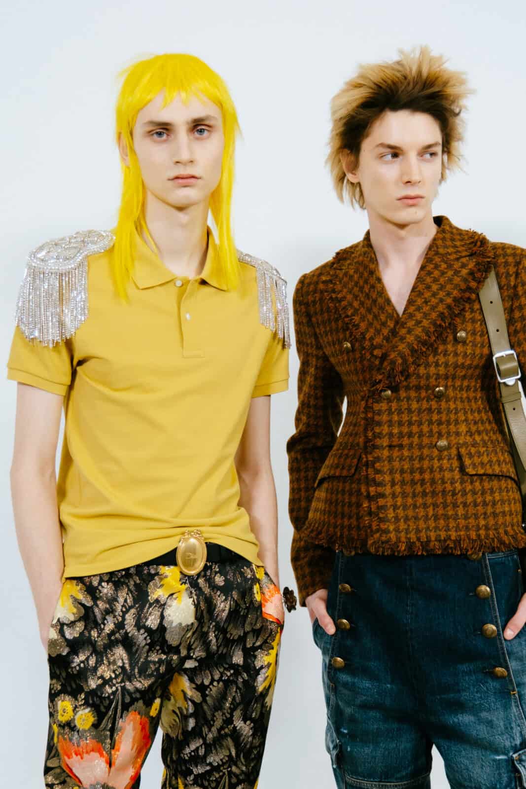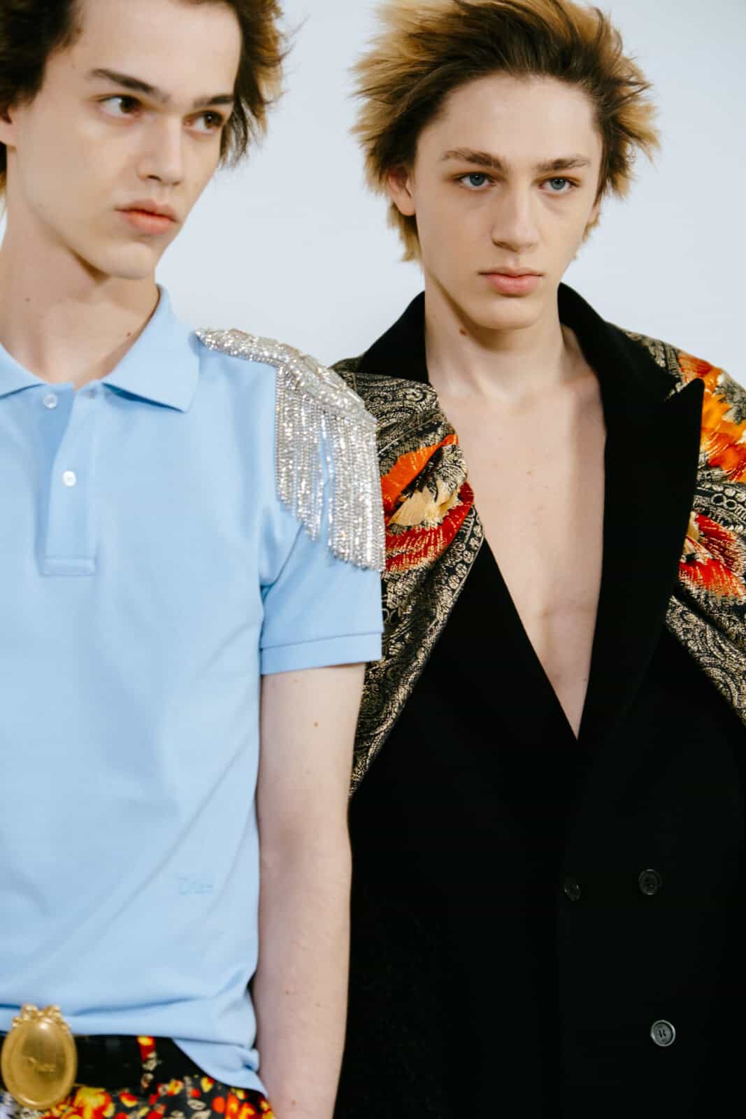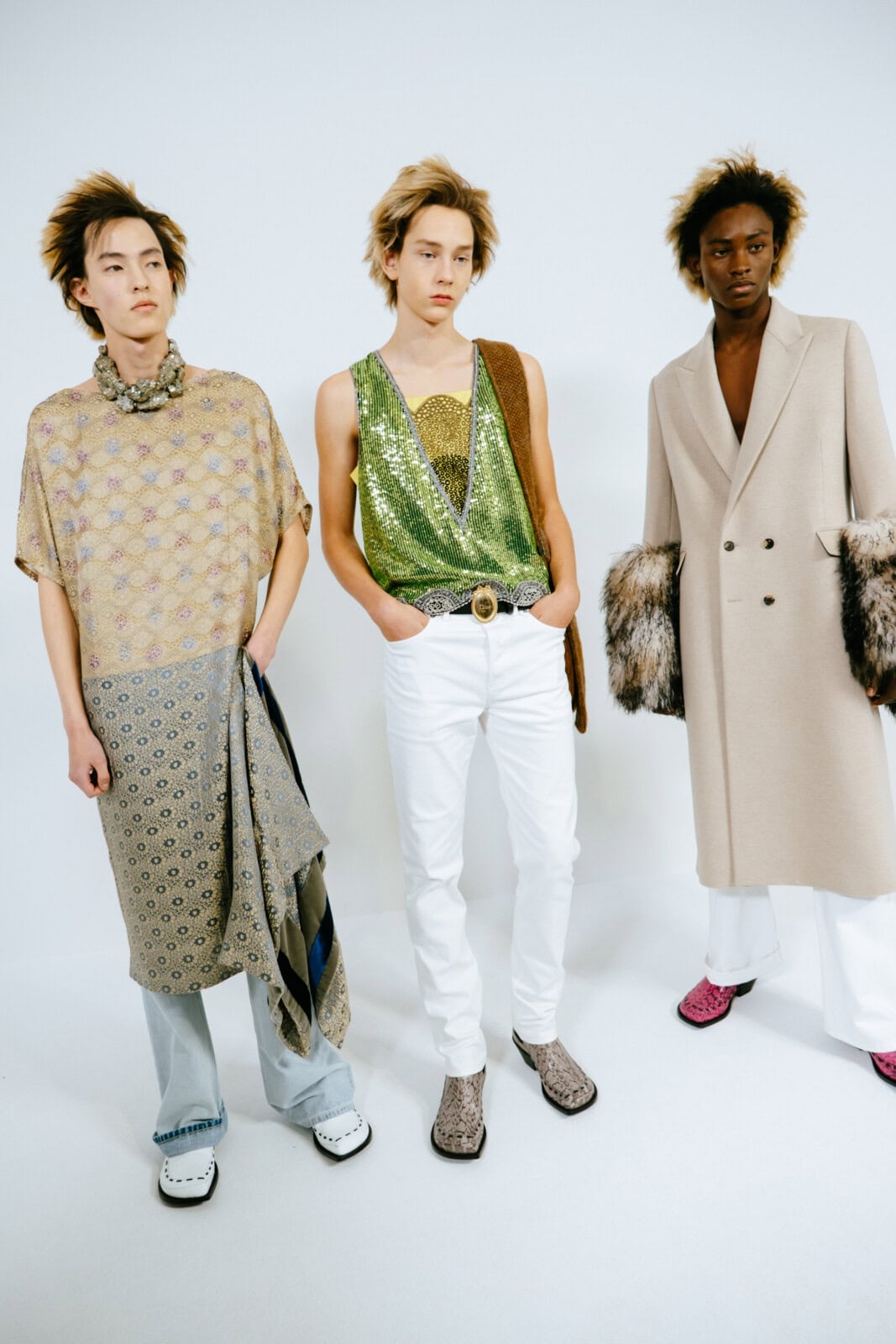Punkish in attitude (and we’re not just talking about the hair, spiked like it’d been zapped by electricity), the first models out wore drainpipe jeans, rocker boots and camisole-style vests frosted in purple and green sequins. They looked like if Ziggy Stardust and His Spiders From Mars had been teleported to today and were out causing mayhem on the streets of Paris.