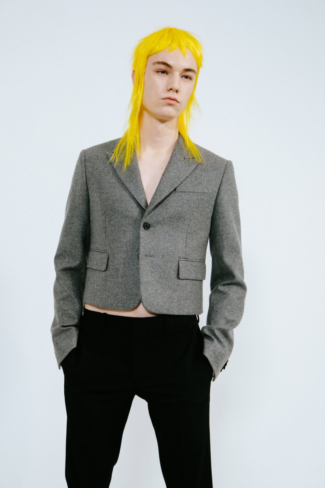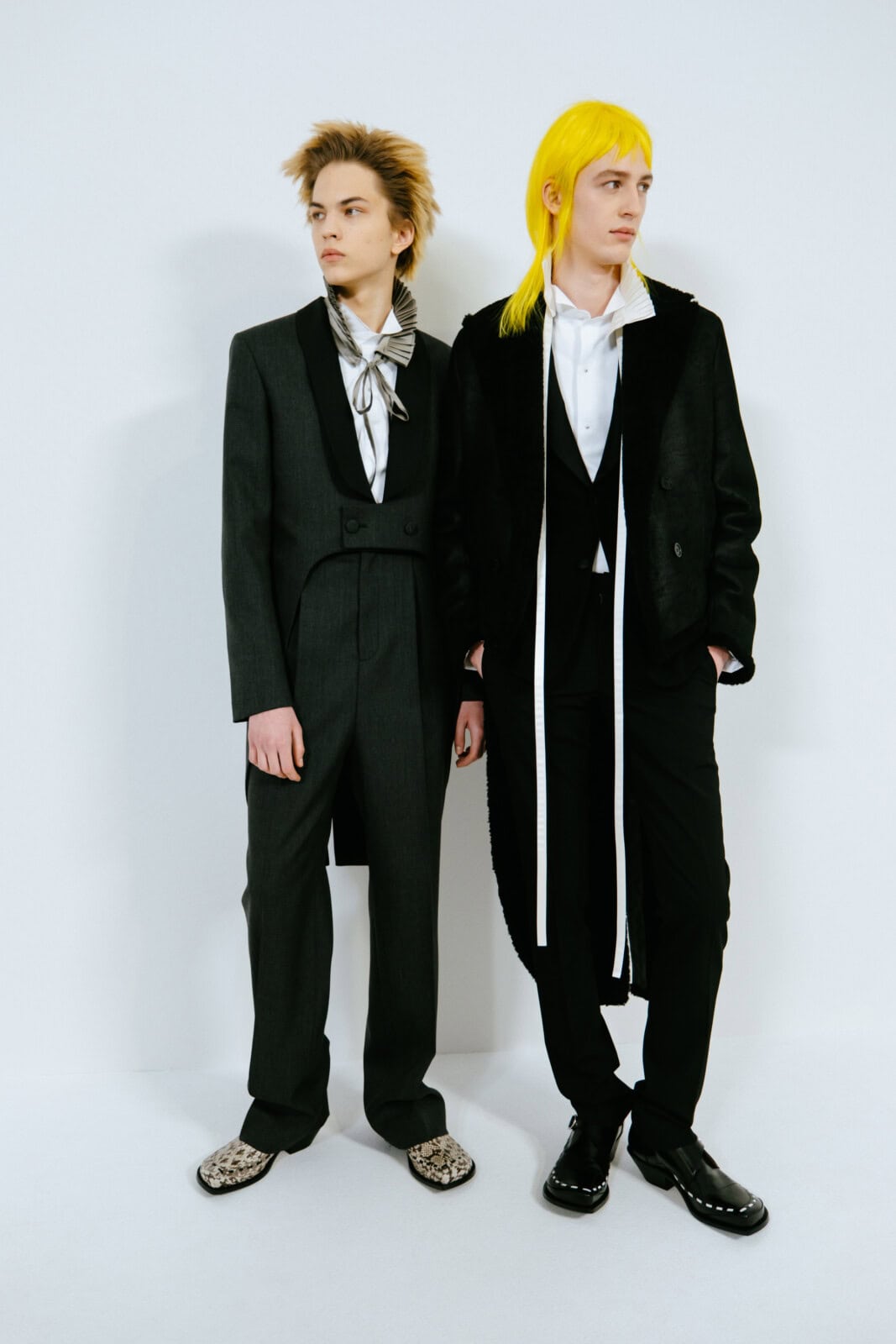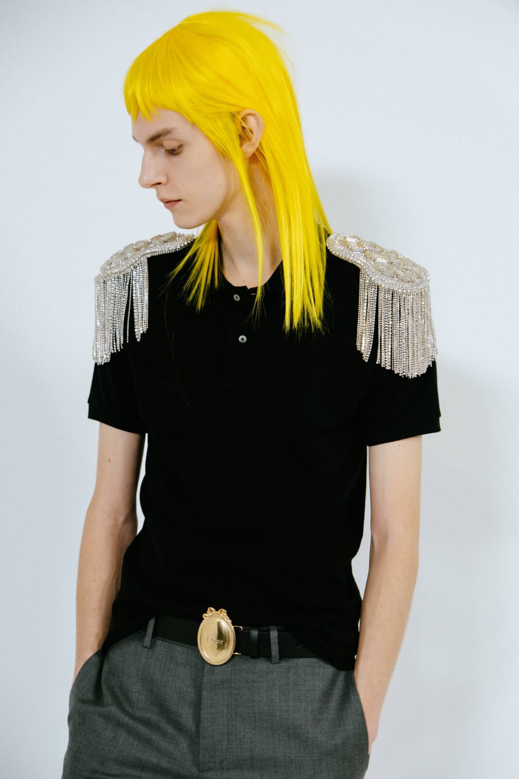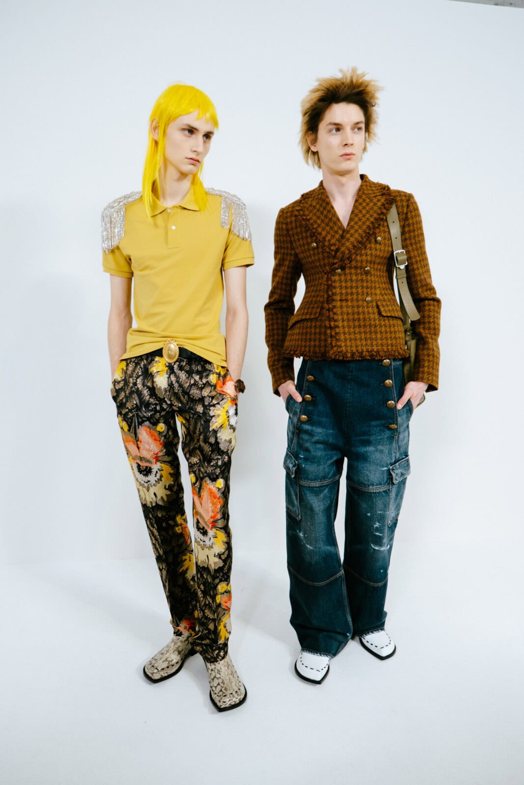 Punkish in attitude (and we’re not just talking about the hair, spiked like it’d been zapped by electricity), the first models out wore drainpipe jeans, rocker boots and camisole-style vests frosted in purple and green sequins. They looked like if Ziggy Stardust and His Spiders From Mars had been teleported to today and were out causing mayhem on the streets of Paris.