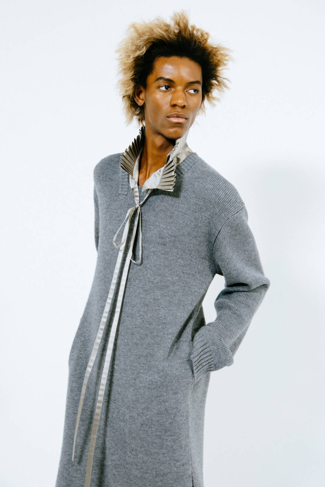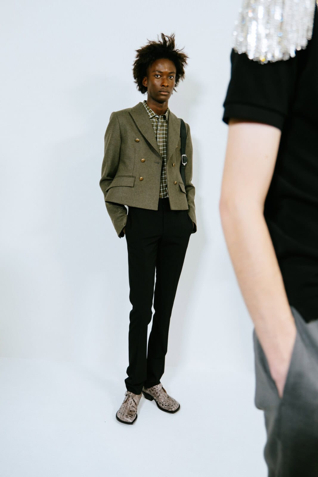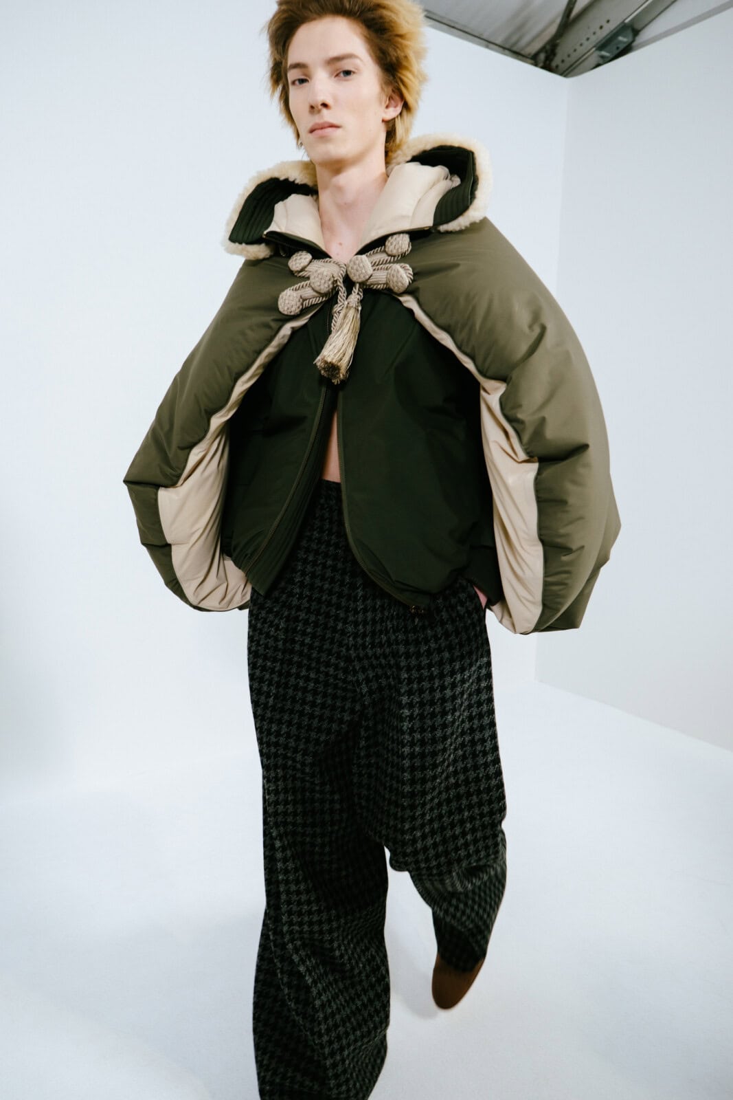 Throughout, Anderson pushed hallmarks of the man’s wardrobe with a wink and a nudge. Shirts came with shiny, embroidered epaulettes. Overcoats had monstrous furry cuffs. Messenger bags looked as if they were crafted from torn-up carpets. The designer’s exploration of dressing up saw him play with proportions. Many of the coats were bulbous and cocooning, including swollen bomber jackets that migrated into swirling, brocade capes. In contrast, tailoring was shrunken tight to the body and cut from Donegal tweeds.
