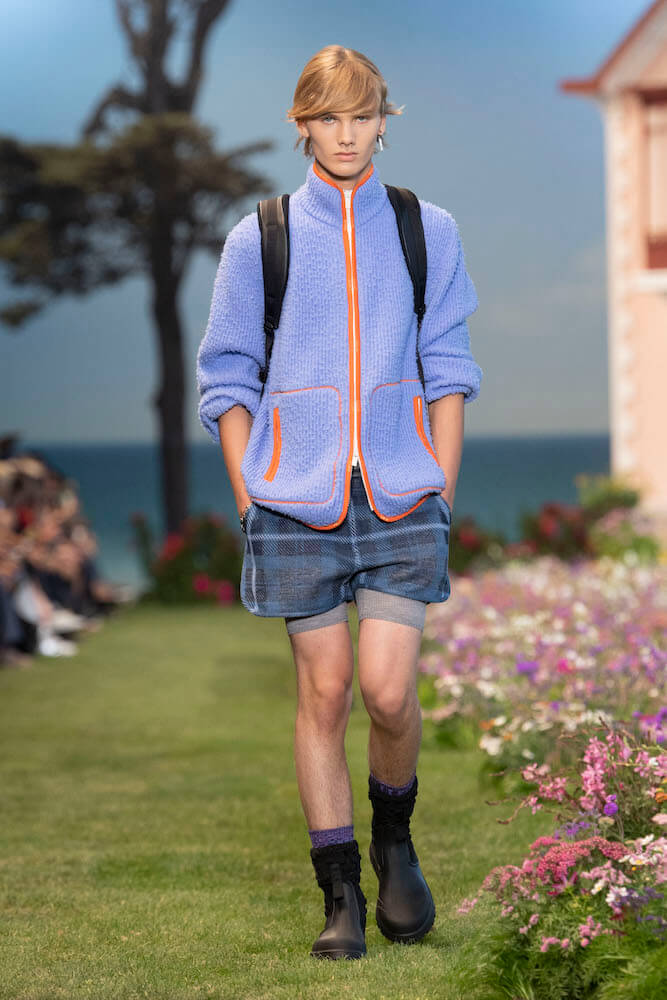 In a romantic palette of rose pinks, dusty blues and cream, Jones transported Grant’s artworks to couture-level knits, paired alongside wide-cut trousers, boyish shorts, and summer hats designed by Stephen Jones. Signature Kim Jones tailoring met elevated activewear in an attractive cocktail of contrasting styles which felt slick and modern. Like sharp-shouldered suit jackets paired with woolly socks and climbing shoes. Or ankle-length wellies and plaid anoraks which felt elegant and equipped for an expedition, all at once.