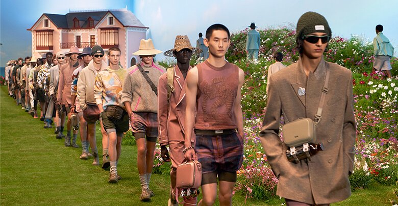 Kim Jones brought a taste of the English countryside to Paris yesterday afternoon. Green fingered, like Monsieur Dior himself, this season Jones built his own mini oasis which blended the blooming landscapes of Granville, where Dior was born, and Charleston in Sussex – with two houses dotted either side of the set.