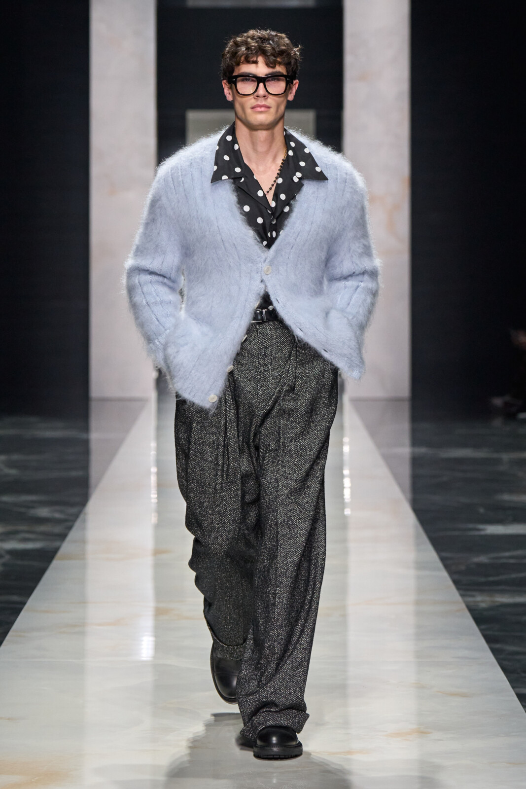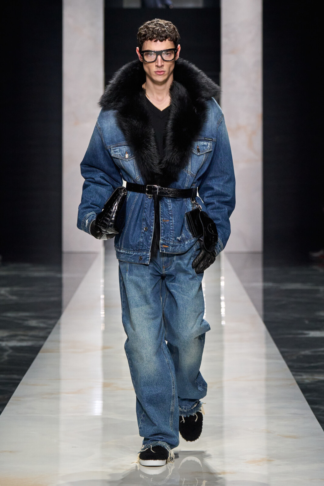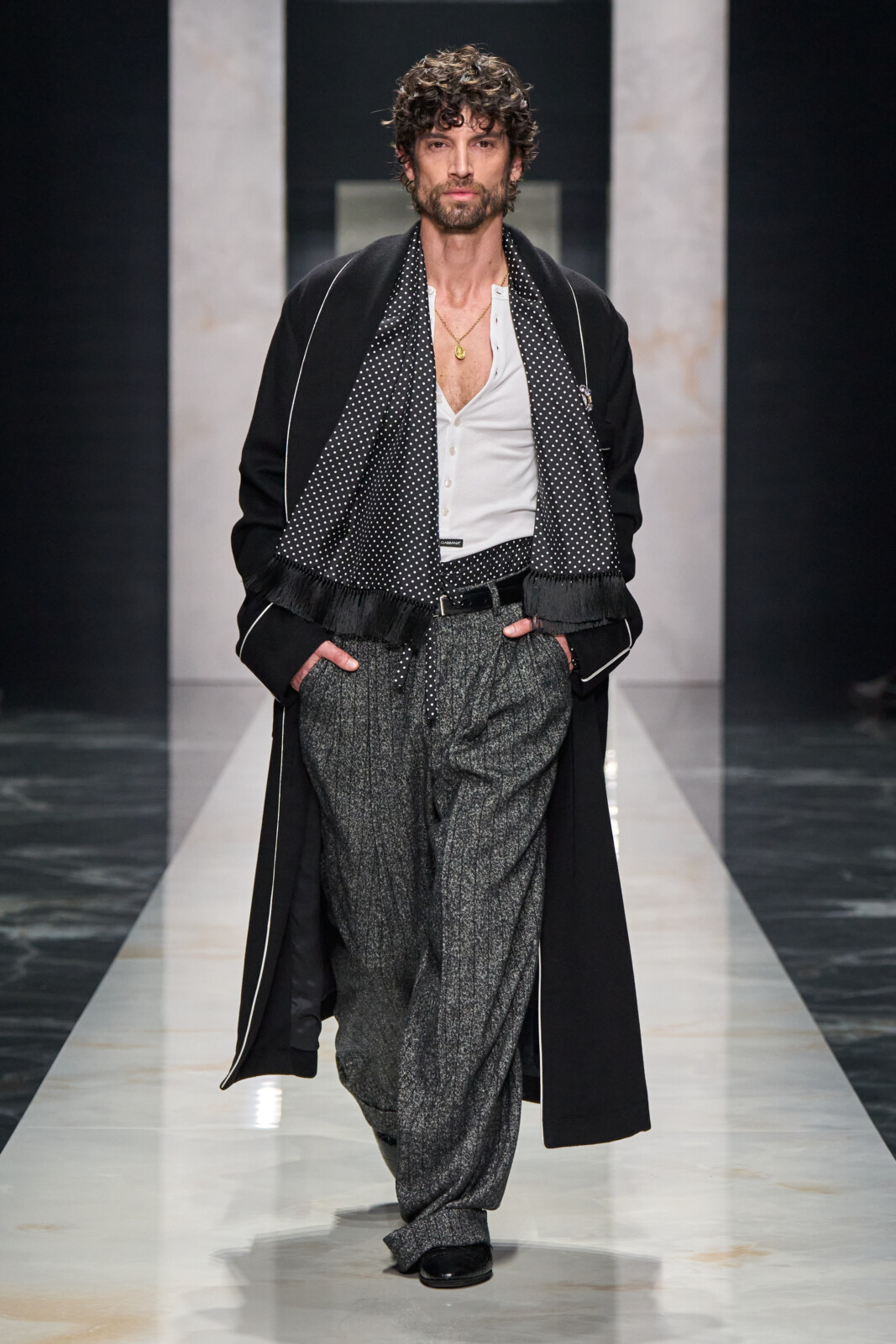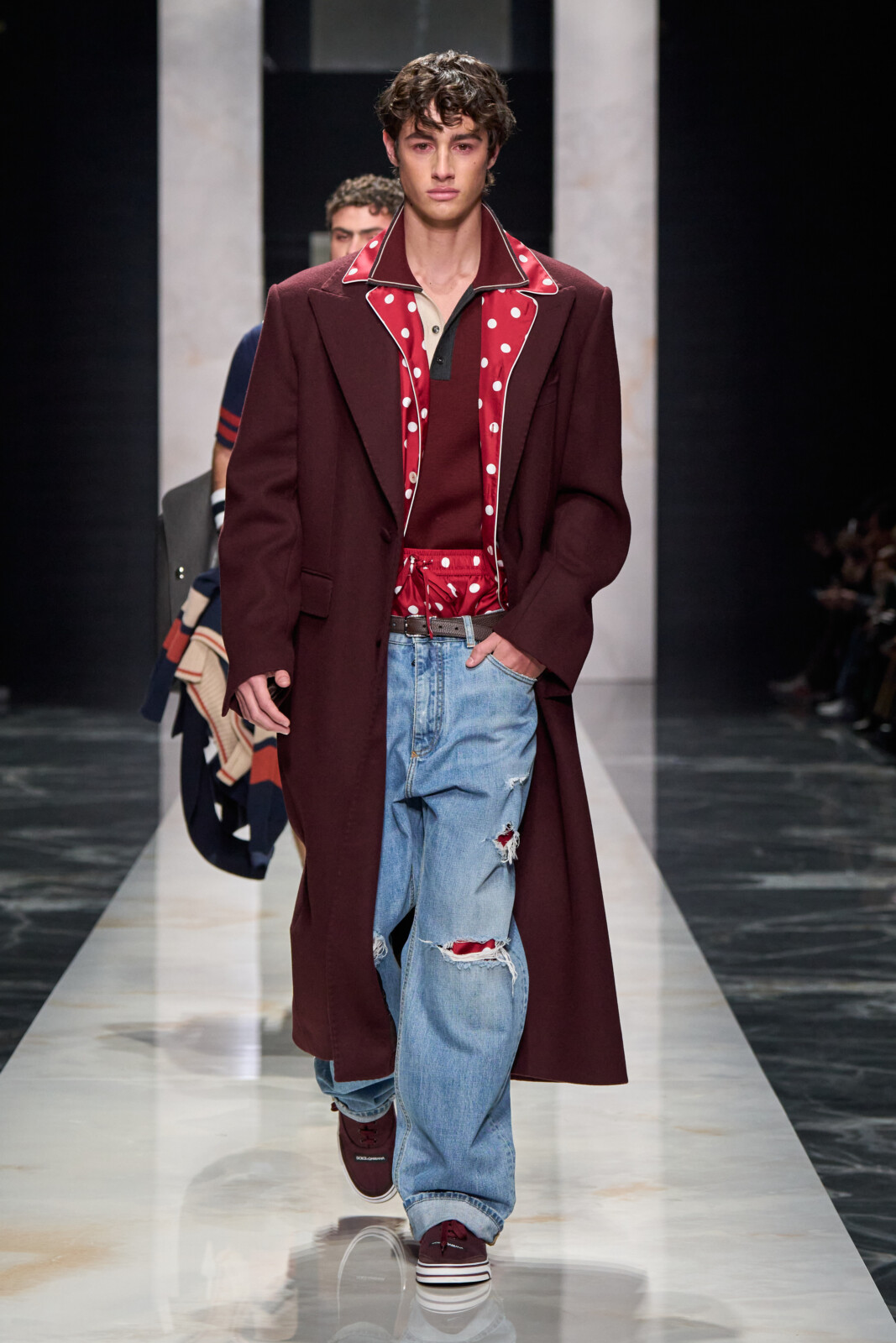 Throughout, the designers toured through sartorial staples which were Dolce-fied. Woollen suiting with wide shoulders walked alongside polka dotted shirts worn under leather jackets and pinstriped tuxedos with wide lapels. Outerwear was particularly strong, from oversized faux furs and shaggy shearlings to gentlemanly robes. Moving into a sportier territory, there were vintage looking footy kits and varsity jerseys paired with shredded jeans and trackies. Closing things out with a black tie procession, it shaped up to be a collection that could dress you for all occasions.