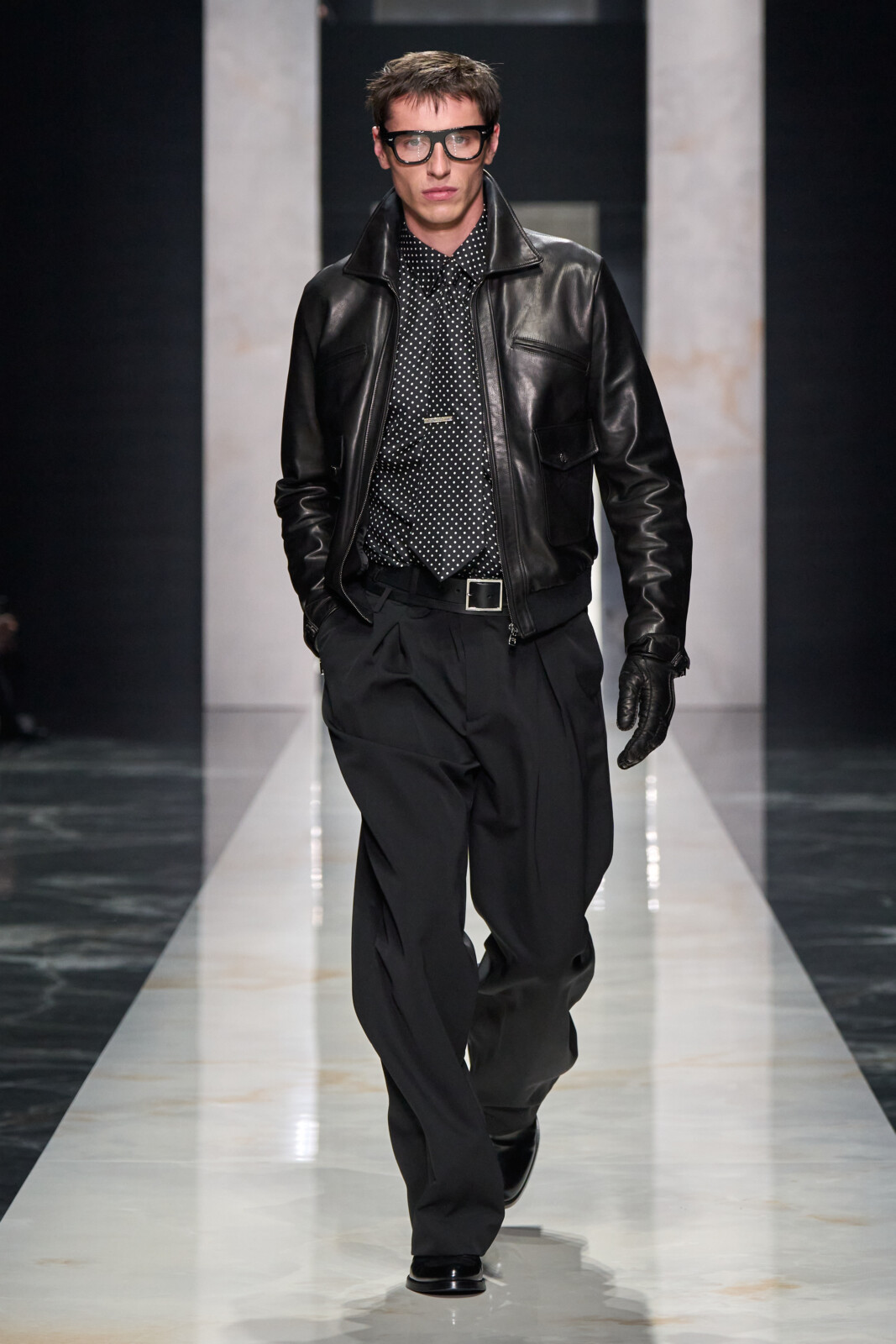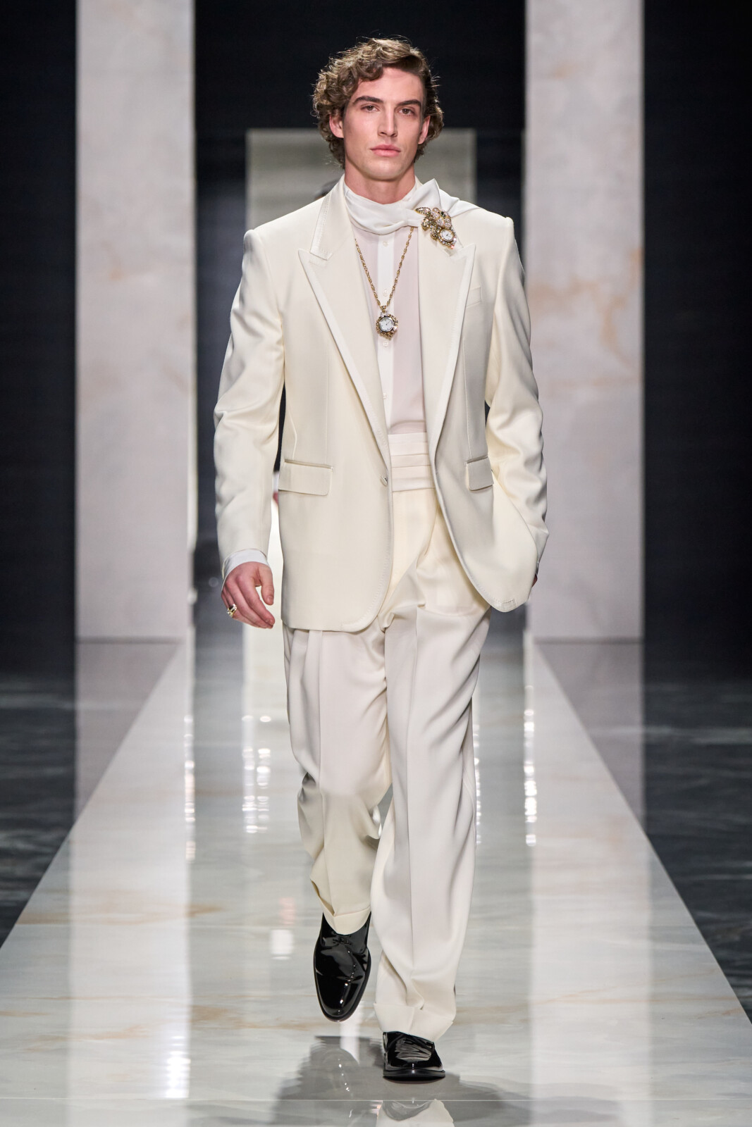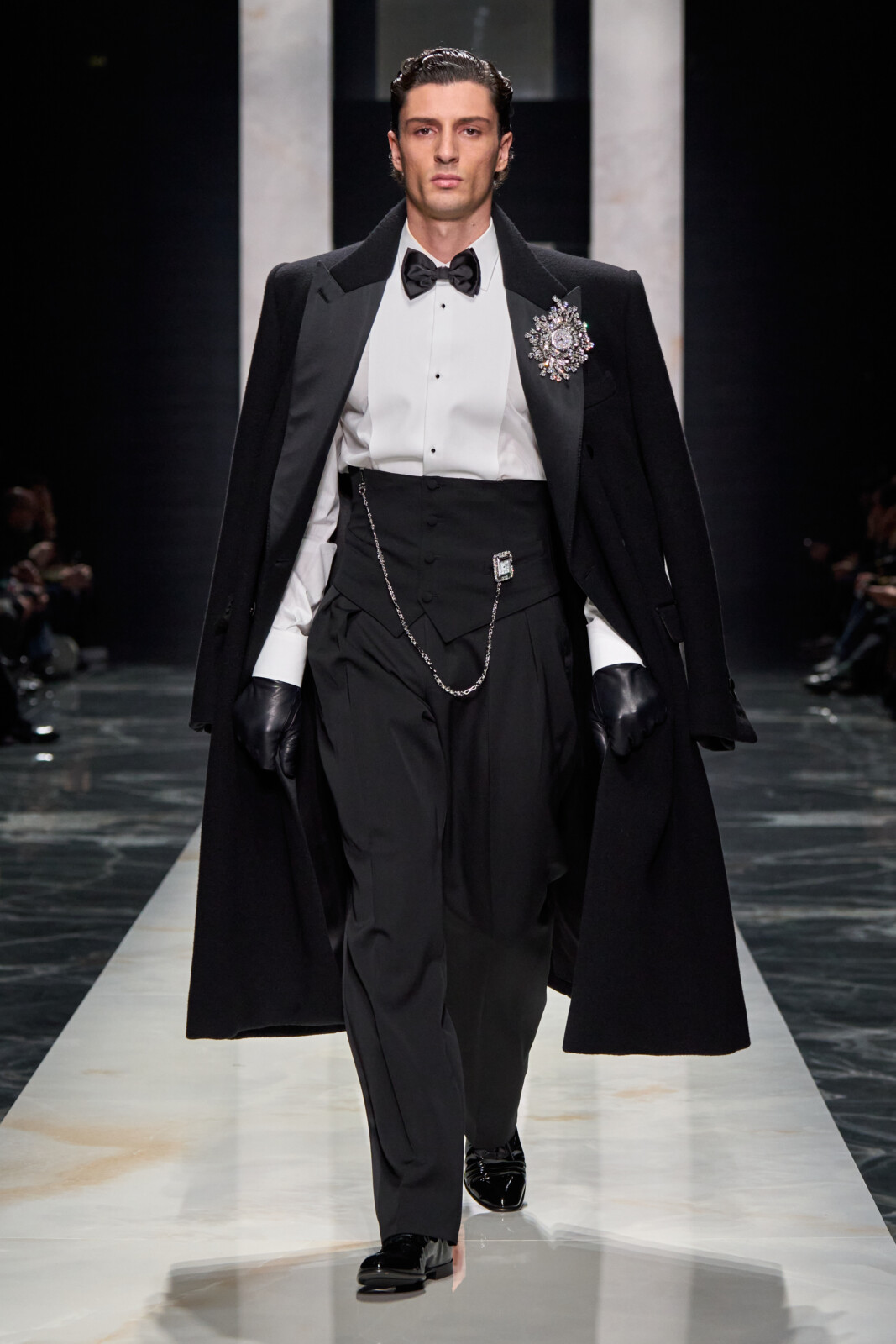 Throughout, the designers toured through sartorial staples which were Dolce-fied. Woollen suiting with wide shoulders walked alongside polka dotted shirts worn under leather jackets and pinstriped tuxedos with wide lapels. Outerwear was particularly strong, from oversized faux furs and shaggy shearlings to gentlemanly robes. Moving into a sportier territory, there were vintage looking footy kits and varsity jerseys paired with shredded jeans and trackies. Closing things out with a black tie procession, it shaped up to be a collection that could dress you for all occasions.