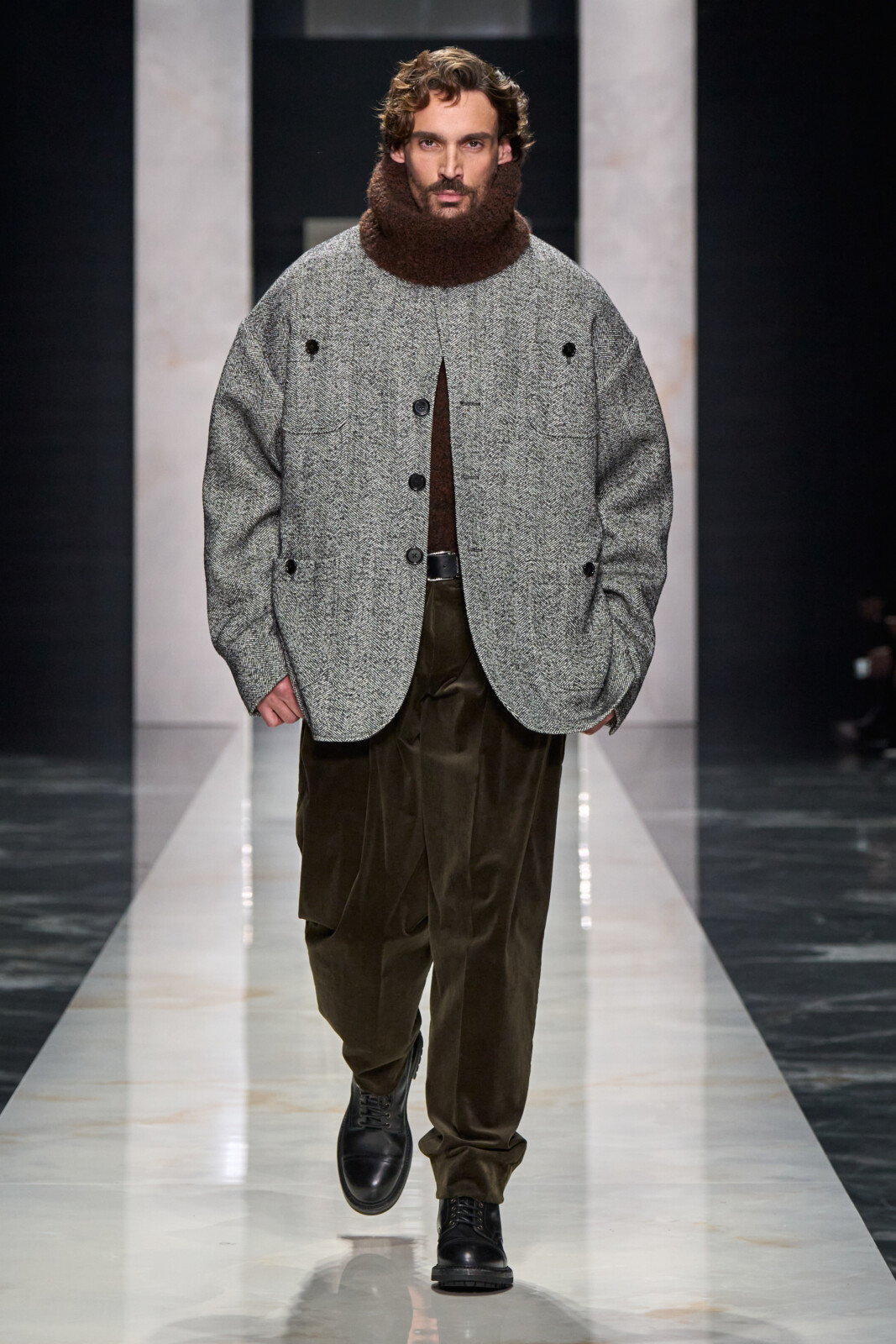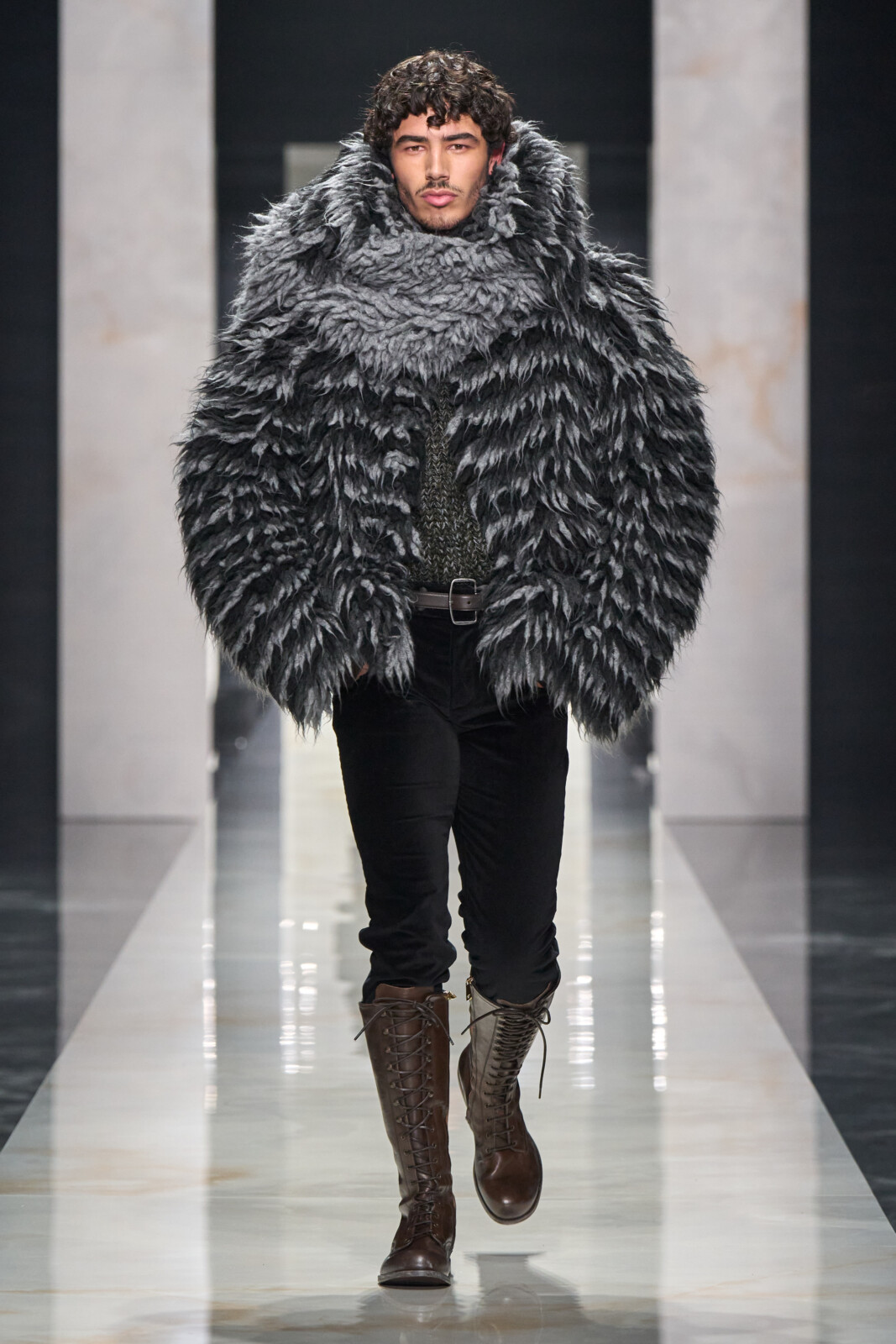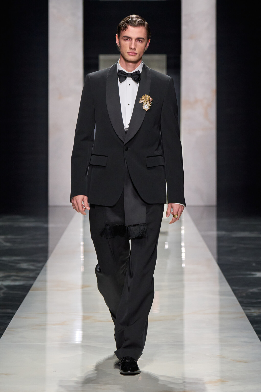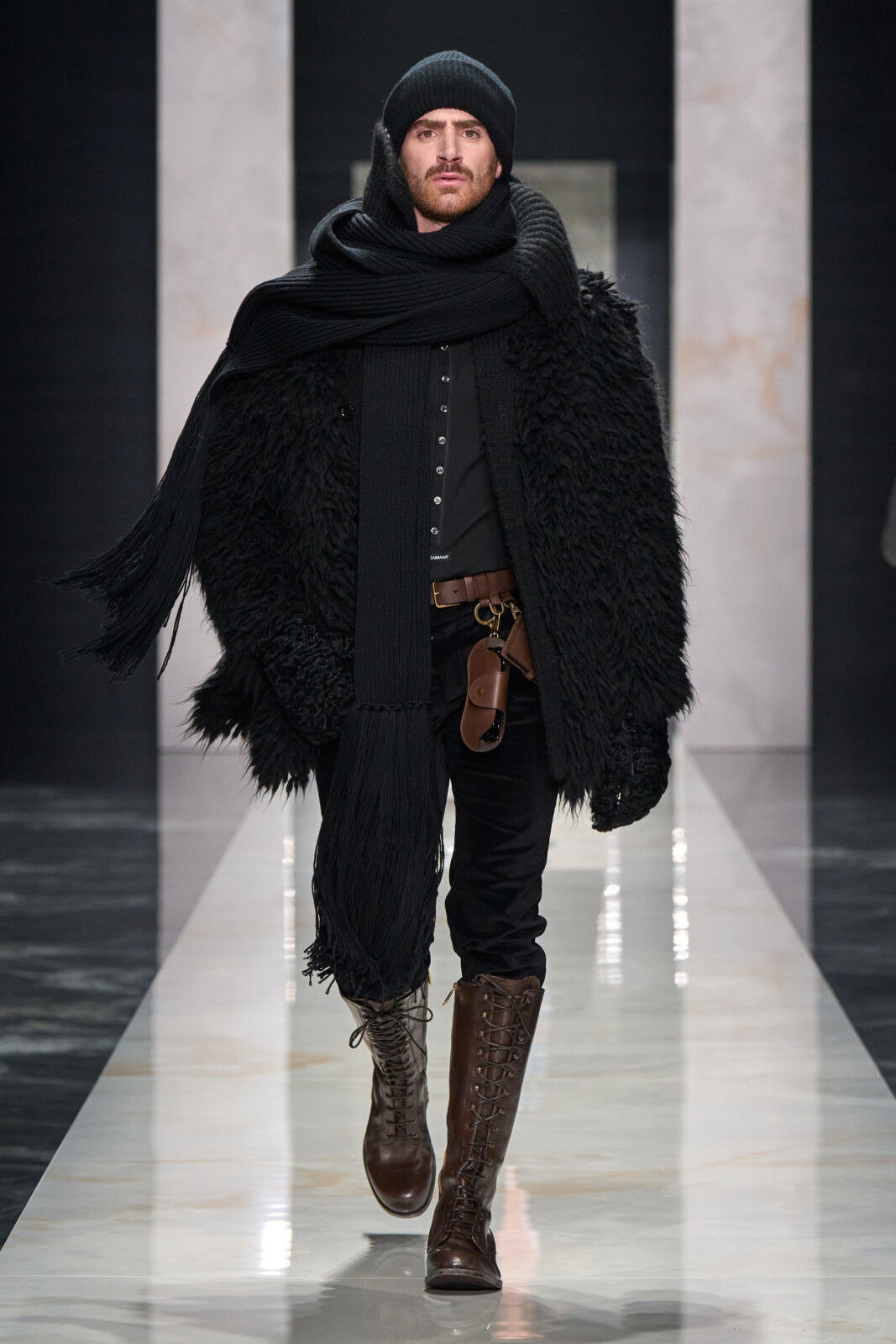 Throughout, the designers toured through sartorial staples which were Dolce-fied. Woollen suiting with wide shoulders walked alongside polka dotted shirts worn under leather jackets and pinstriped tuxedos with wide lapels. Outerwear was particularly strong, from oversized faux furs and shaggy shearlings to gentlemanly robes. Moving into a sportier territory, there were vintage looking footy kits and varsity jerseys paired with shredded jeans and trackies. Closing things out with a black tie procession, it shaped up to be a collection that could dress you for all occasions.