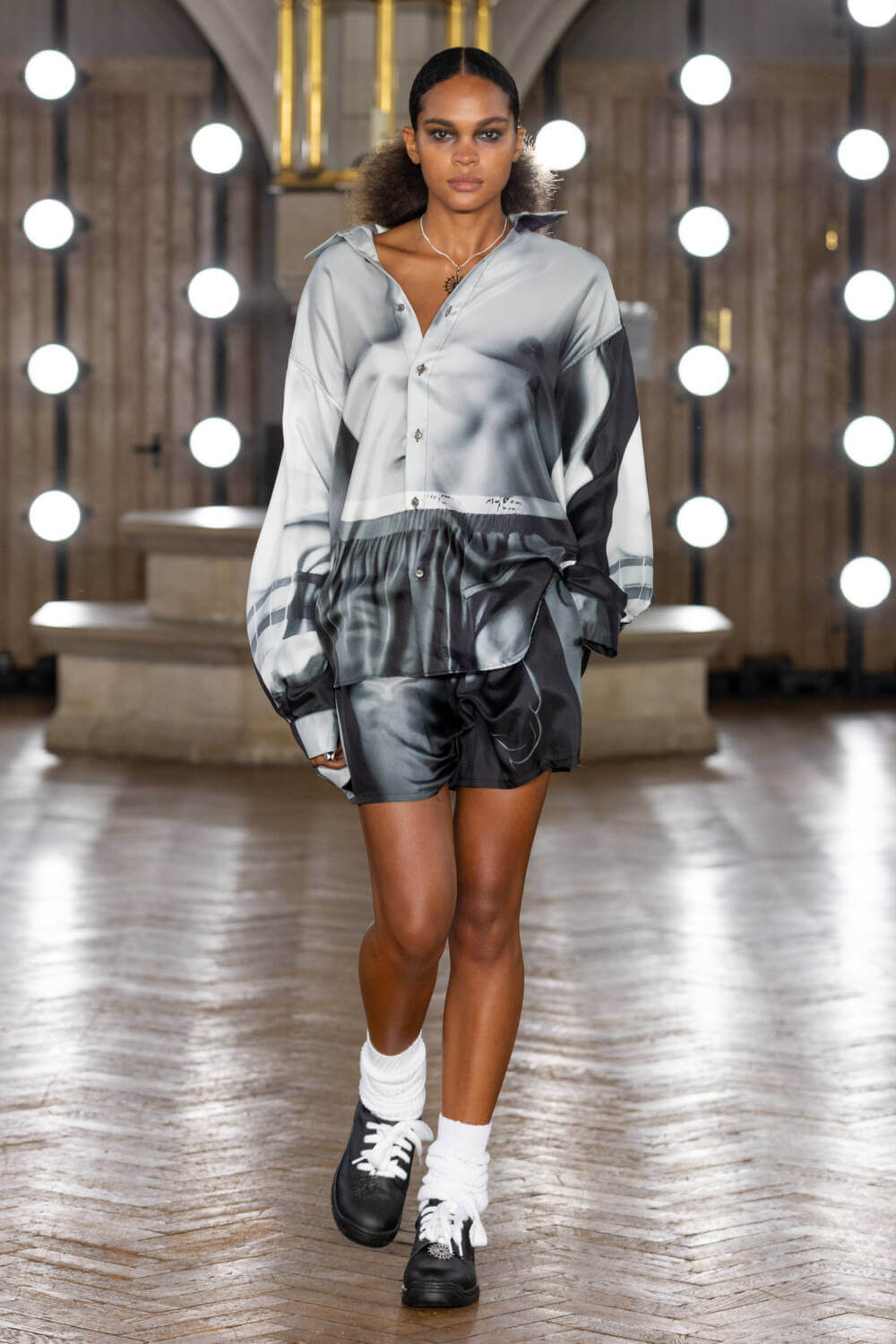 Under the decadent vaulted ceiling inside the hallowed halls of London’s St Cyprian’s Church, illusory geometric motifs lead the charge. Looking like capricious harlequins, Crutchley’s quintessentially queer-goth models donned rough and tumble materials split with vertical stripes and oversized argyle. Slouchy cardigans, football kits and managerial coats were paired with chunky black stompers with fat contrast laces – reminiscent of early noughties skate shoes – and snow white leg warmers. Techy intarsia knits laced with ivy leaf and baroque graphics; sports uniforms evolved from mediaeval livery.