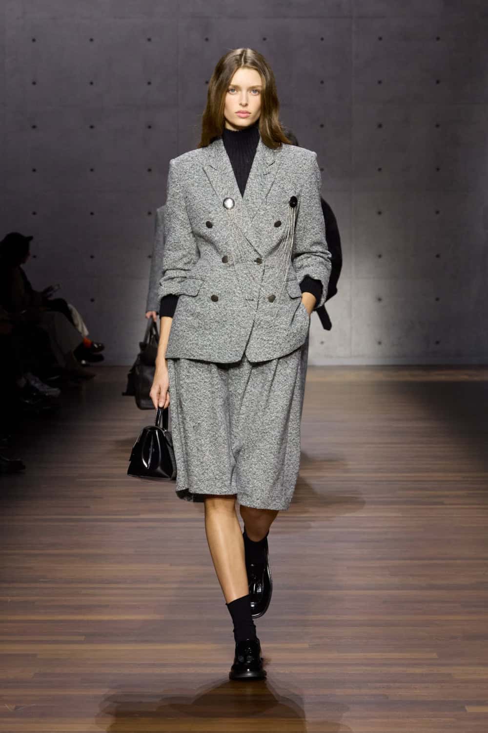 House staples anchored the offering: trench coats, enveloping overcoats, softly structured suits and long cardigans layered over generous shirts and cropped trousers. Pleated Bermuda shorts and elevated denim introduced a younger energy, while tactile fabrics – tweed, chenille, wool-linen blends and worn-effect leather – added depth. Rendered in a palette of beige, greige and brown, punctuated by flashes of Armani blue and red, the collection balanced continuity with quiet progression.