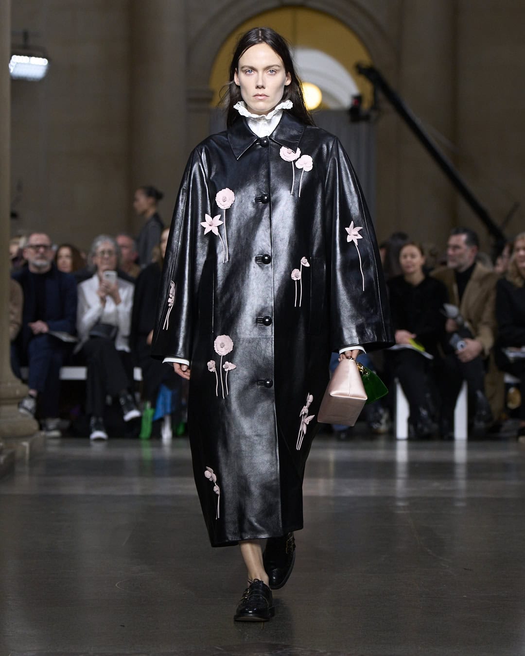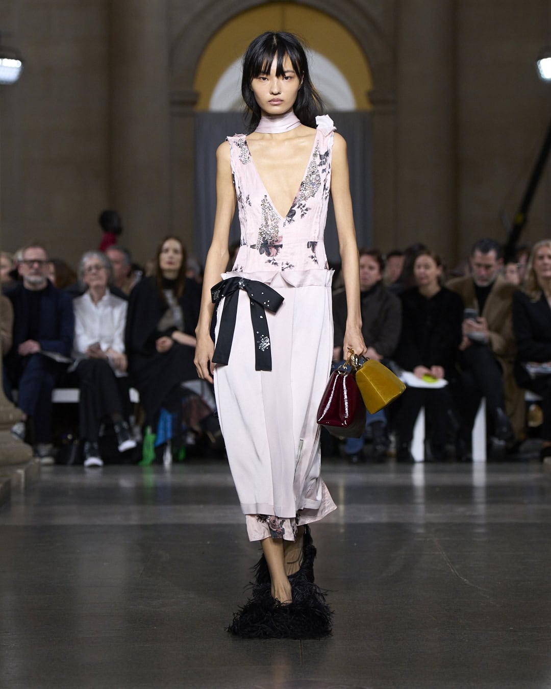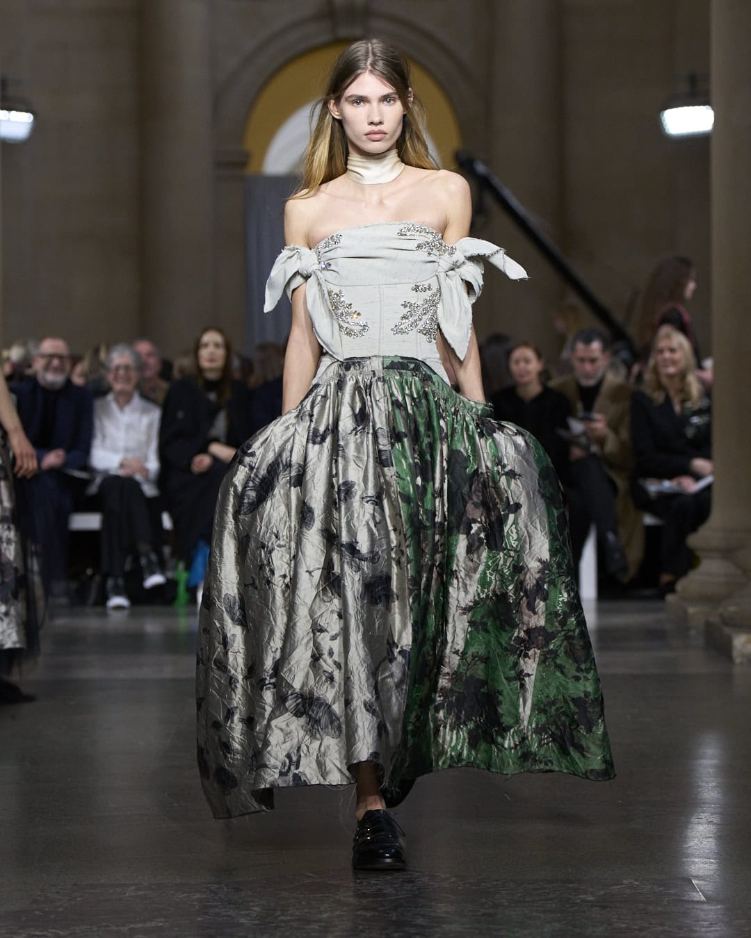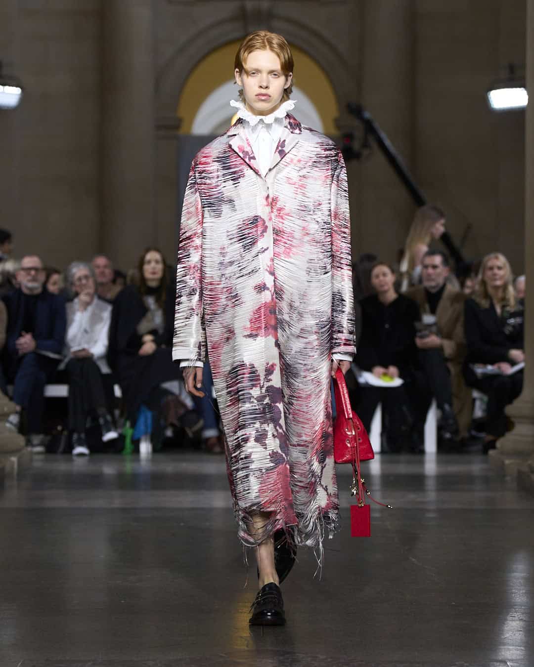 Celebrating 20 years in business, Erdem is a beacon of independent success in London. He has survived and thrived. For this anniversary collection, he imagined what would happen if the many exceptional women who have inspired his collections over the decades were in conversation (everyone from Maria Callas and Radcliffe Hall to Margot Fonteyn, the Duchess of Devonshire and Virginia Woolf). Erdem envisaged a cross pollination of his past concepts and ideas. This 20th anniversary collection was not a retrospective, he insisted. Instead it was a remix of favourite fabrics, silhouettes and details – recognisably Erdem, but also new. So the top half of an 2018 evening dress was hacked off and put with jeans for 2026 – a styling idea that originally came from his graduate collection. The top half of a floral jacquard car coat was collaged with the bottom half of a silk dressing gown. Several dresses were made from artfully patchworked fragments of different fabrics and design details as Erdem sampled freely from his own extensive archive. Monochrome tweed fabric from past collections was shredded and tuned into feather-like dresses, swatches of intense embroidery were repurposed into dazzling patchwork gowns. A moody AW09 print was transformed into a puff-ball mini dress with a high, Elizabethan ruff collar, worthy of Orlando. There were plenty of swoonsomely pretty pieces, from the rose-print, full-skirted drop waist ball skirts (which came with handy pockets) to ribbon embellished party dresses, tailoring veiled on delicate lace and a spectacular shredded silk car coat. Add a ‘feather duster’ slipper and step out, Erdem-style.
