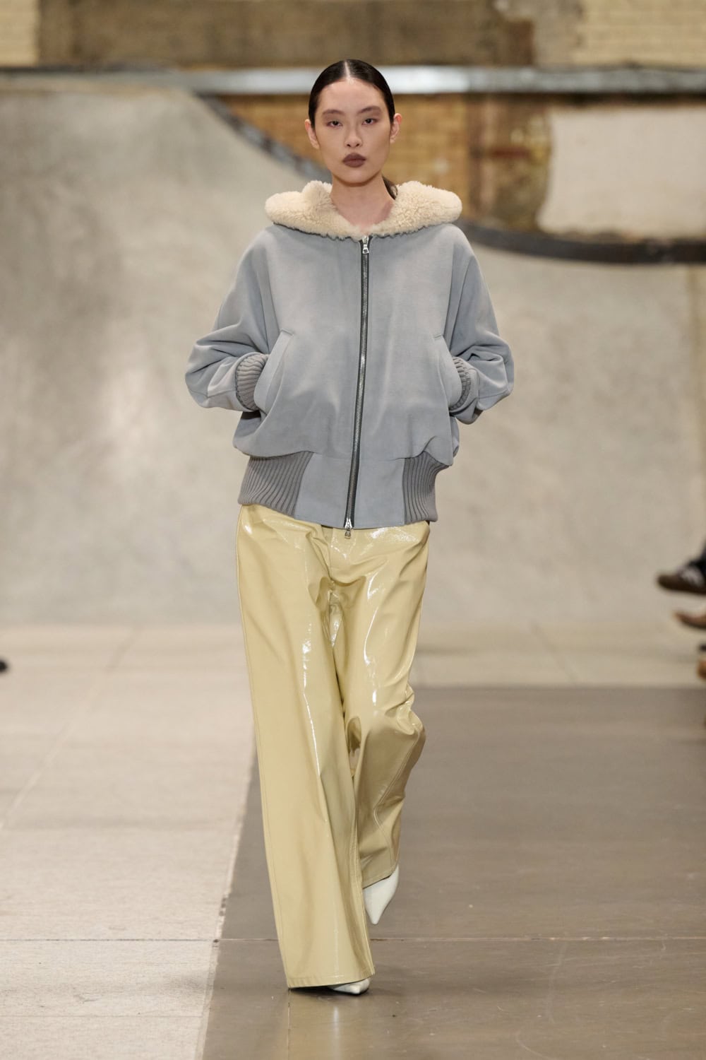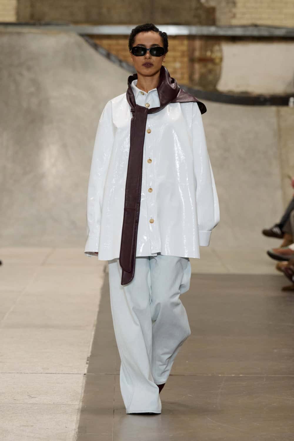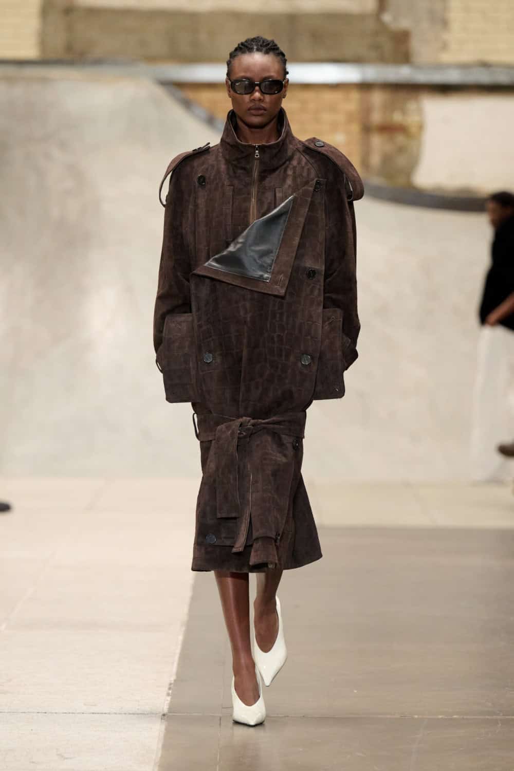 Joining the line-up this season was Traiceline Pratt, a CSM alum behind the brand Goyagoma. His collection was led by a sophisticated design hand that felt already super luxurious. Highlights included a drop-waist trench coat with wide shoulders, in a faded mock-croc print. Elsewhere, a camo parka came with an exaggerated faux fur collar and slacks and oversized T-shirts were cut from glossy  leatherette. These will undoubtedly be big hits with buyers. Get ready to see Pratt soar.