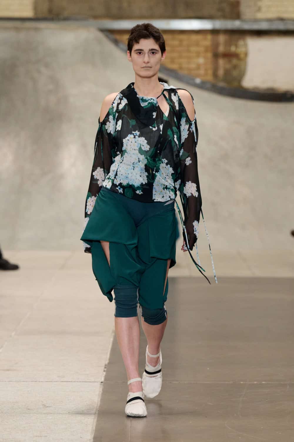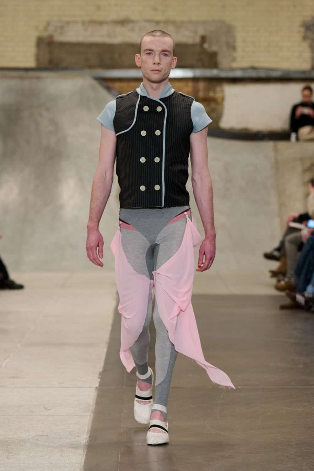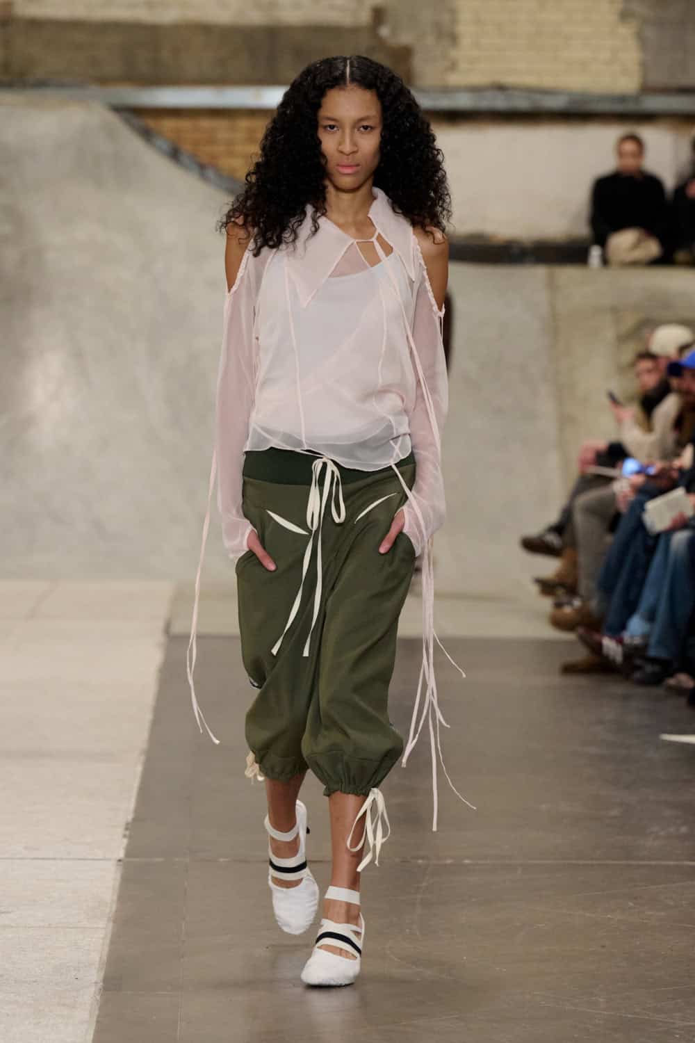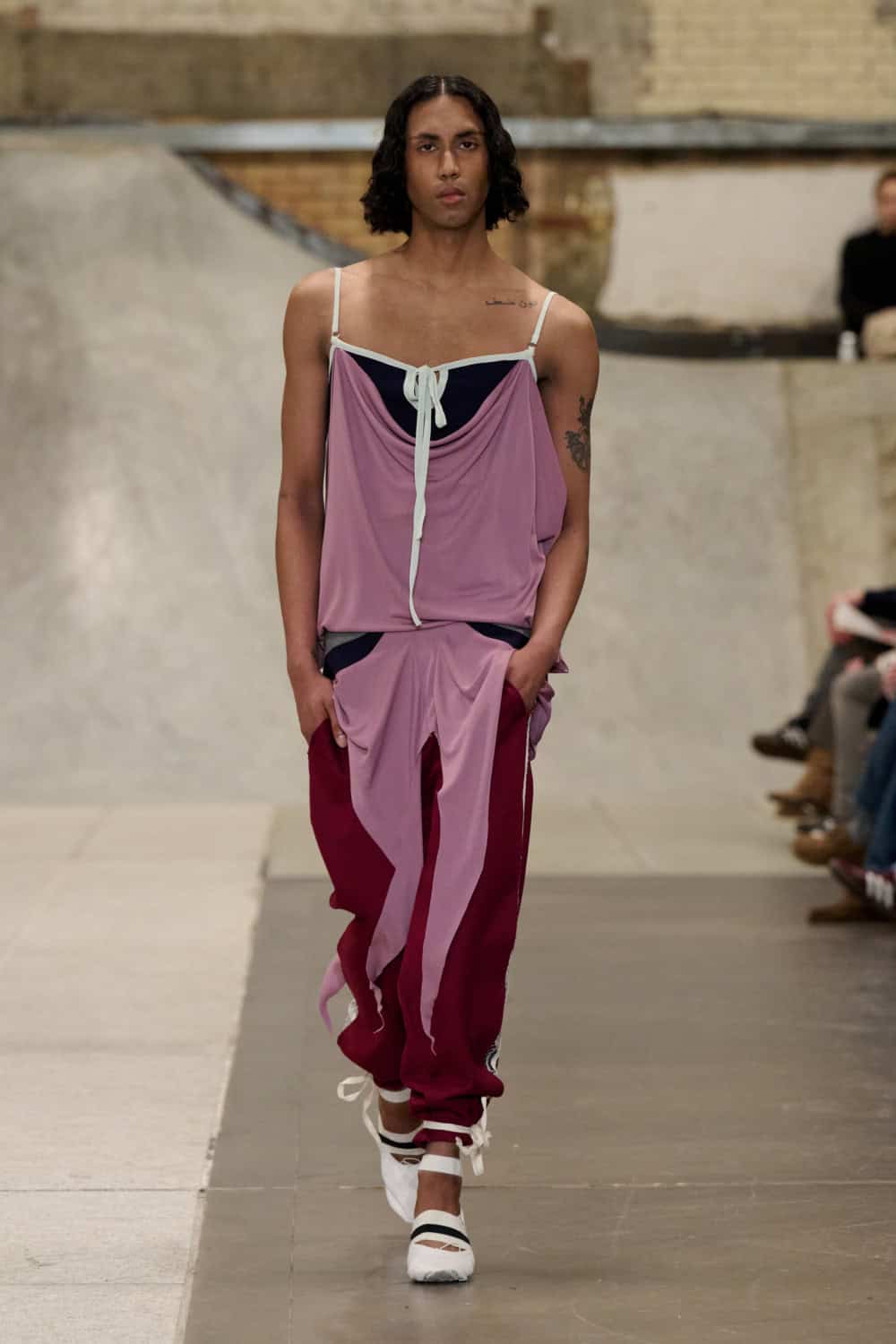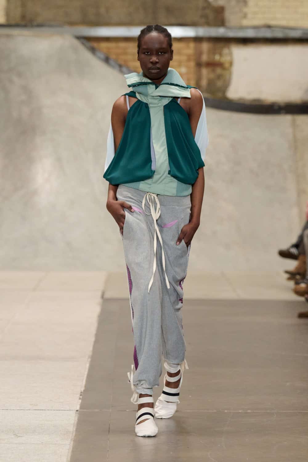 The Fashion East lot jumped on the Bakerloo line down to Elephant and Castle for their show Friday afternoon. Lulu Kennedy’s talent incubator took over Manor Place, an old swimming baths that has been converted into a community space by Palace and Nike that can transform from a skate park into a footy pitch that emerges from the floor. We weren’t here for a game of five-or-side, though, we wanted wow-factor fashion and the three designers part of this season’s cohort certainly delivered.