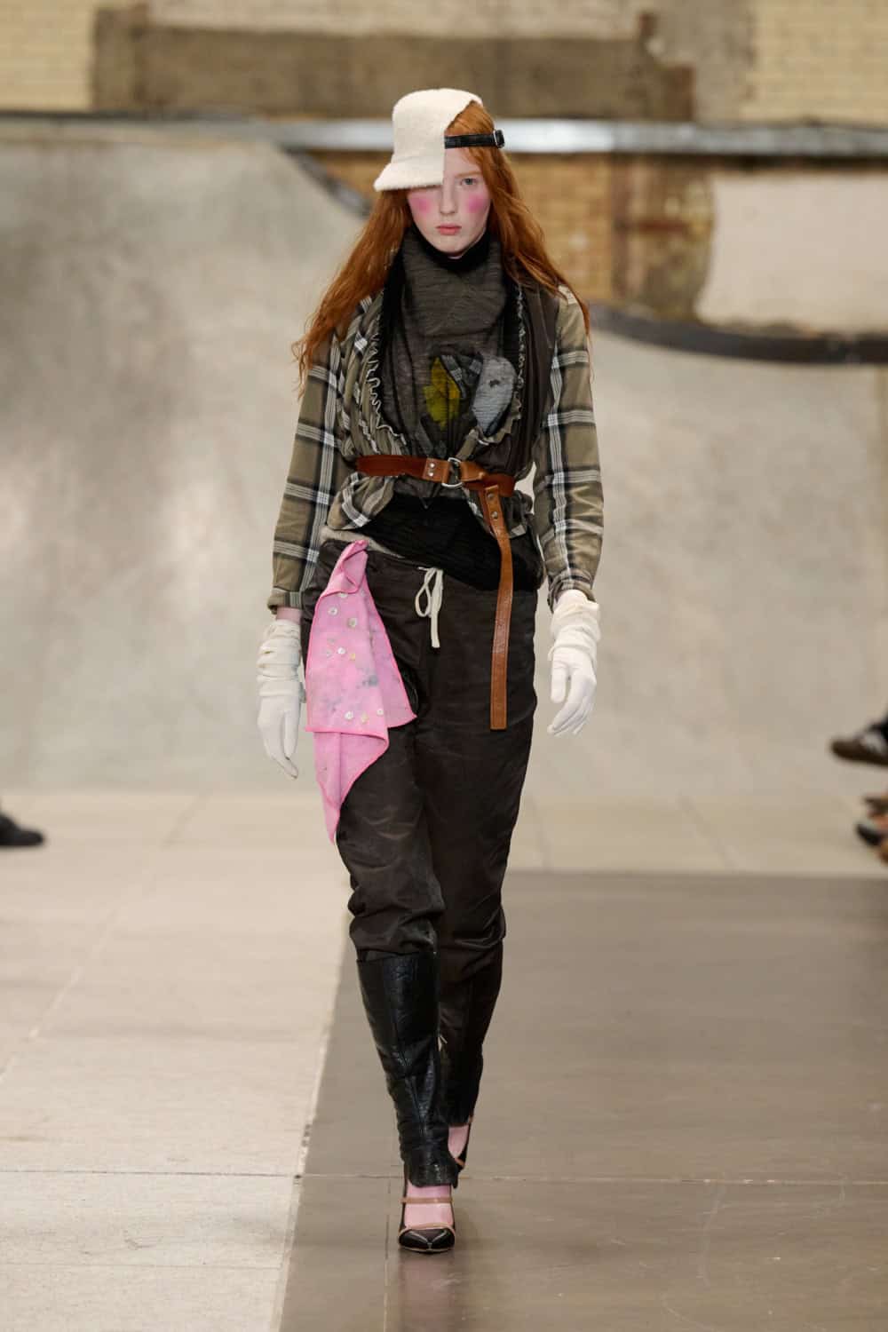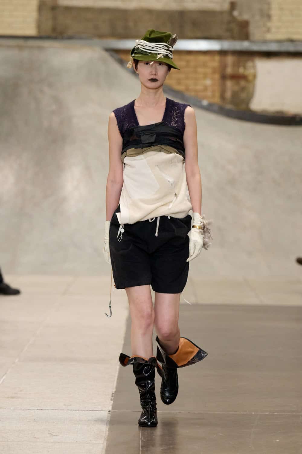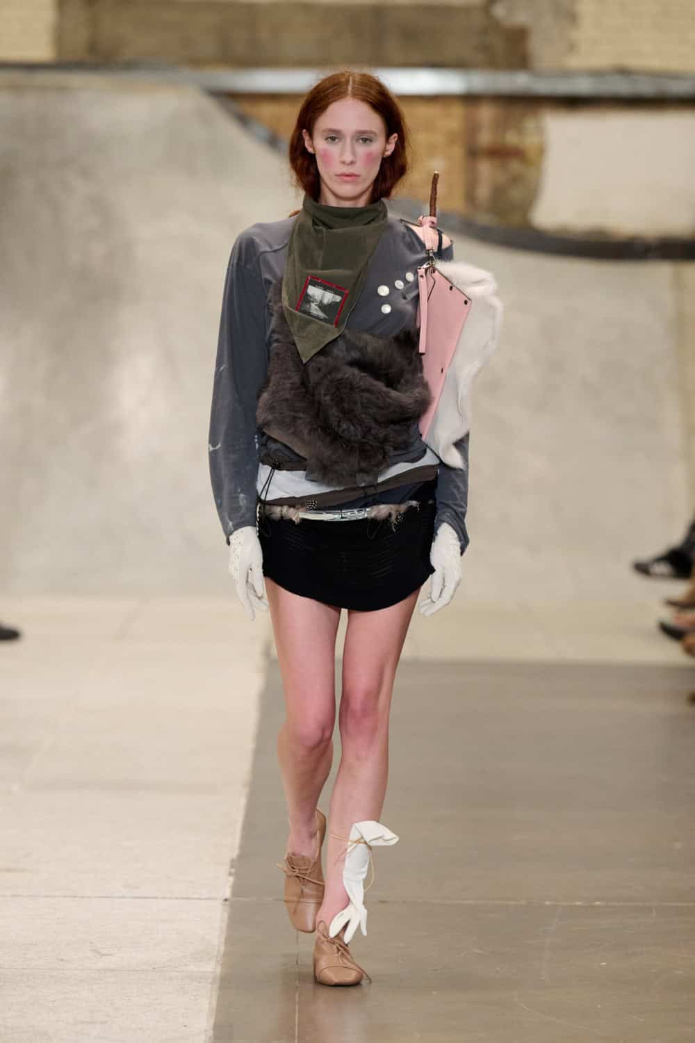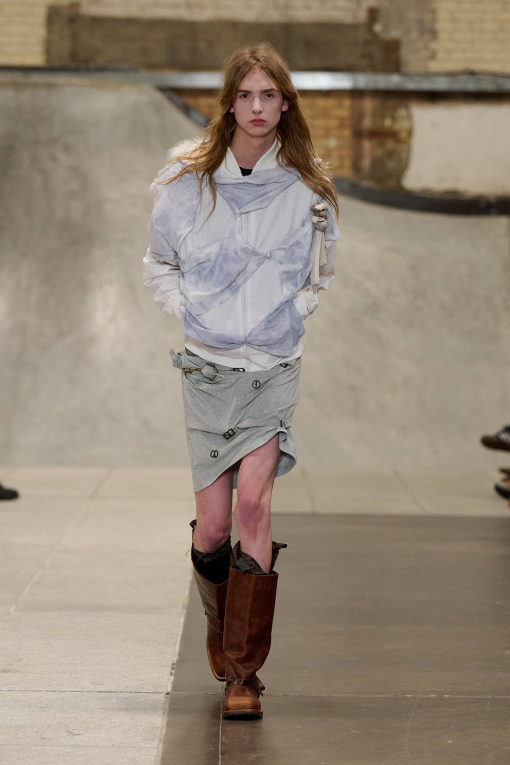 Also collaging ideas was returning designer Louis Mayhew, whose whirlwind designs mix deadstock garments and unwanted tat into brilliantly chaotic ensembles. Looks were bandaged with mesh, chopped up shirts, shaggy patches of fake fur, tea towels and even old underpants. It’s like diving head first into your wardrobe and coming out dressed in a rather fab concoction. Nothing else in London looks like this.