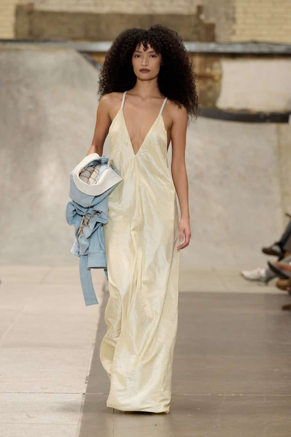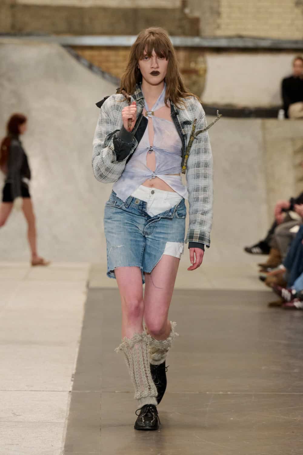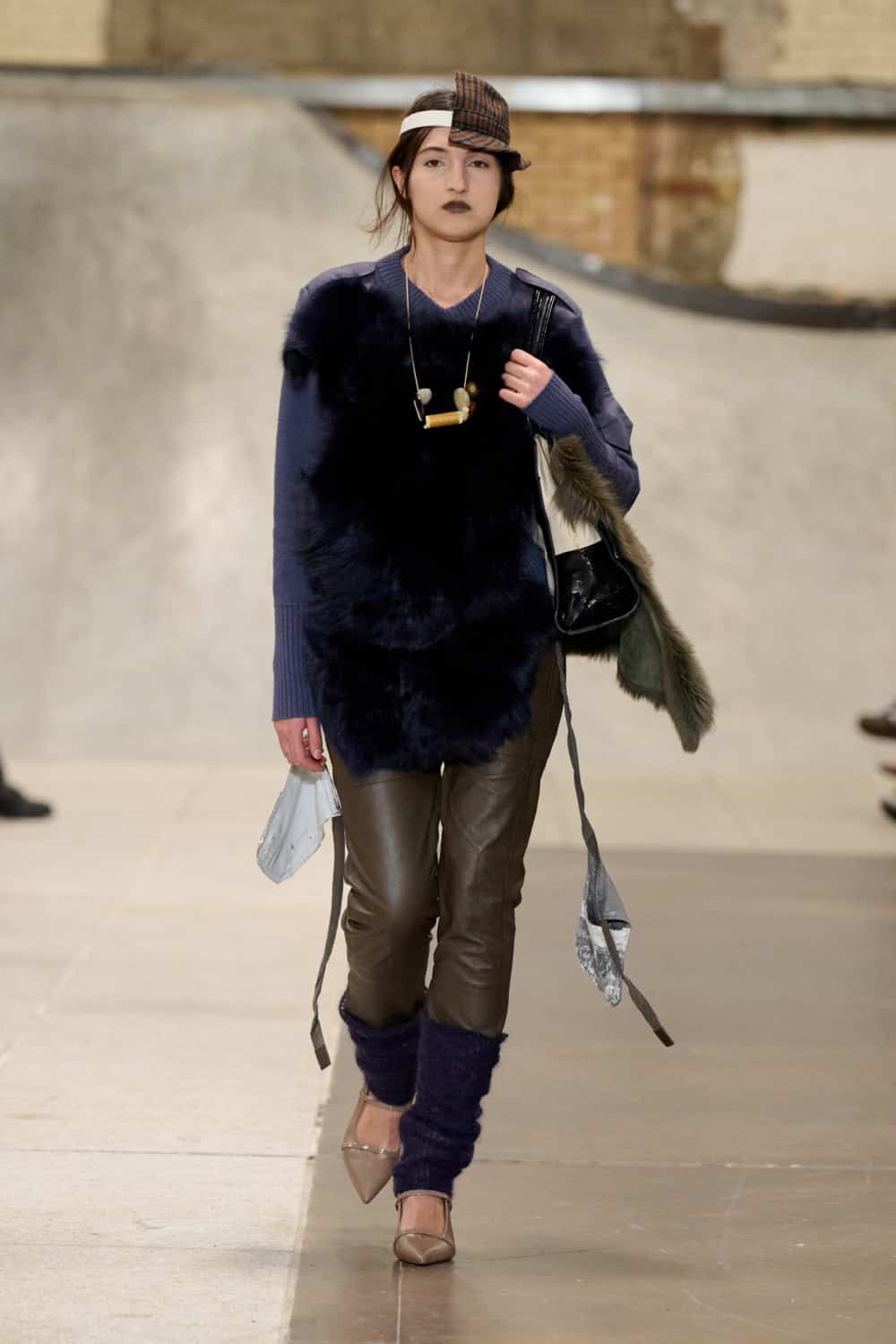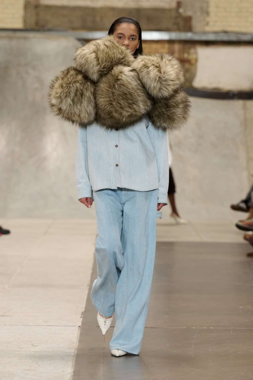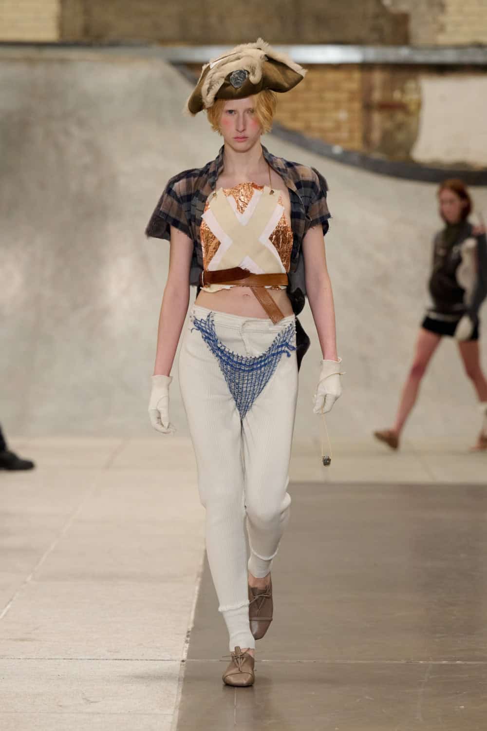 Also collaging ideas was returning designer Louis Mayhew, whose whirlwind designs mix deadstock garments and unwanted tat into brilliantly chaotic ensembles. Looks were bandaged with mesh, chopped up shirts, shaggy patches of fake fur, tea towels and even old underpants. It’s like diving head first into your wardrobe and coming out dressed in a rather fab concoction. Nothing else in London looks like this.