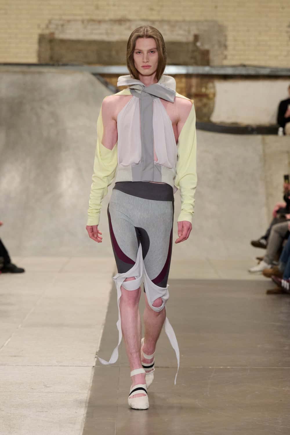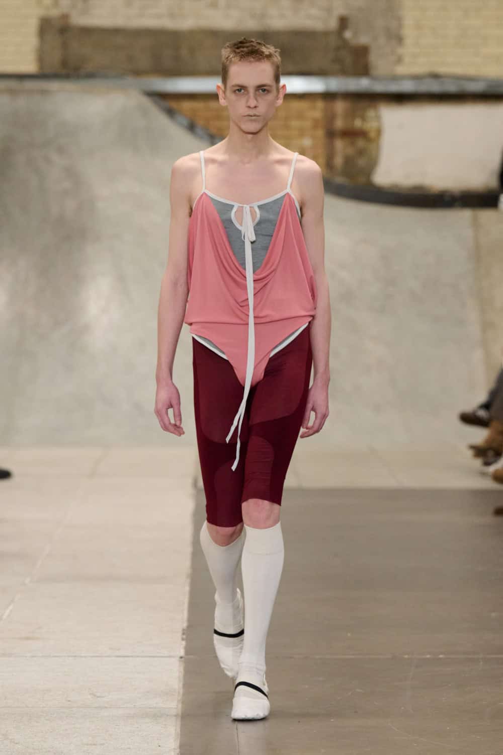 First up was Jacek Gleba, who continued to expand on his Vaslav Nijinsky-inspired  body-con designs. His models came clacking in heeled ballet pumps, dressed in delicate leotards and pastel-hued jersey separates that clung close to the body. Gleba cleverly merges under garments with dance wear which he layers with wispy fabrics to create the sort of clothes that look really superb in movement.