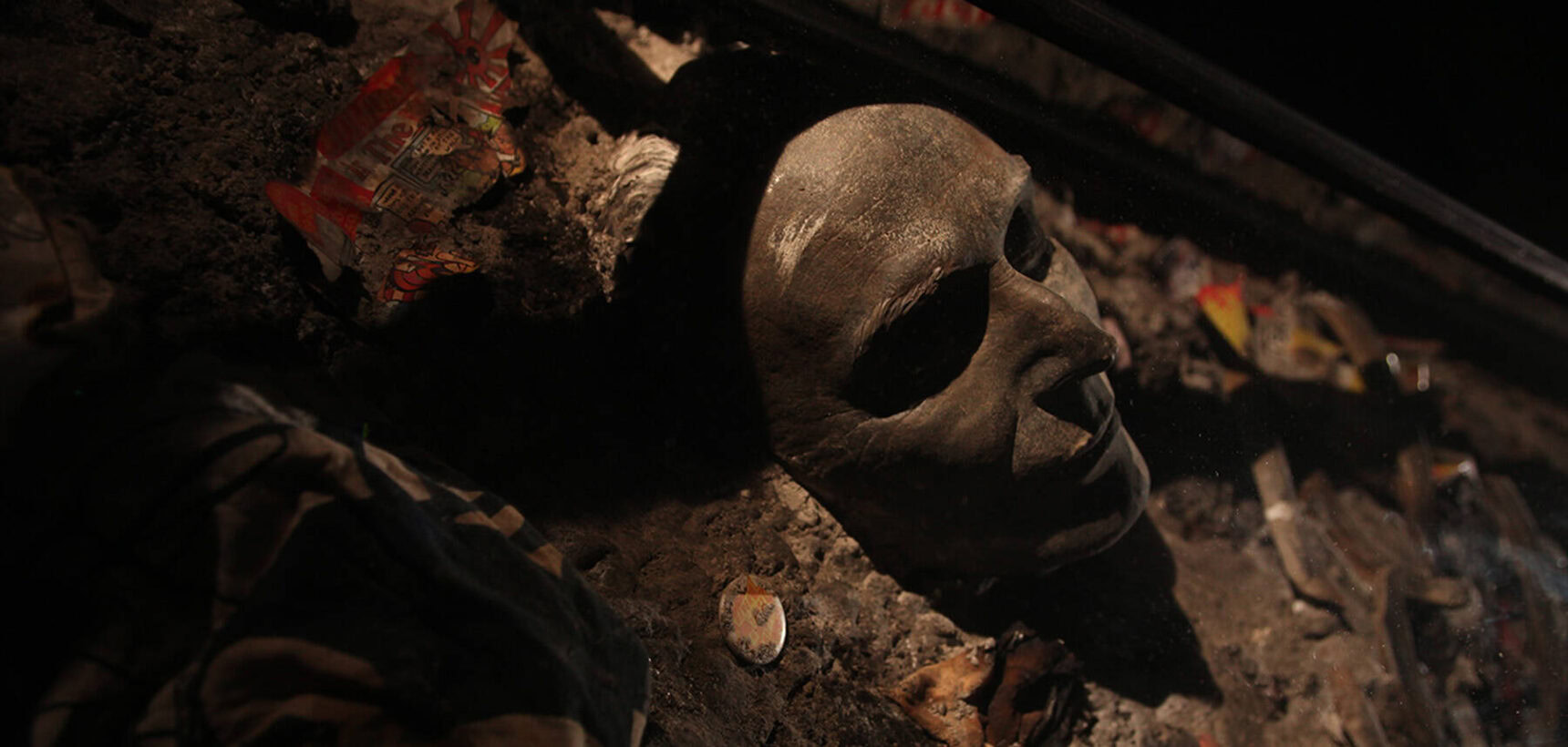 In solidarity with these artists, Joe Corré, son of Dame Vivienne Westwood and Malcolm McLaren, is showcasing a glass coffin with his father’s death mask and the ashes of six million pounds worth of punk memorabilia that he burned to condemn the commodification of counterculture and climate inaction in 2016. The instillation, Burn Punk (Ash from Chaos), is featured alongside the original footage and audio from Corré’s 2016 protest, marking the latest episode in his long history of political activism.