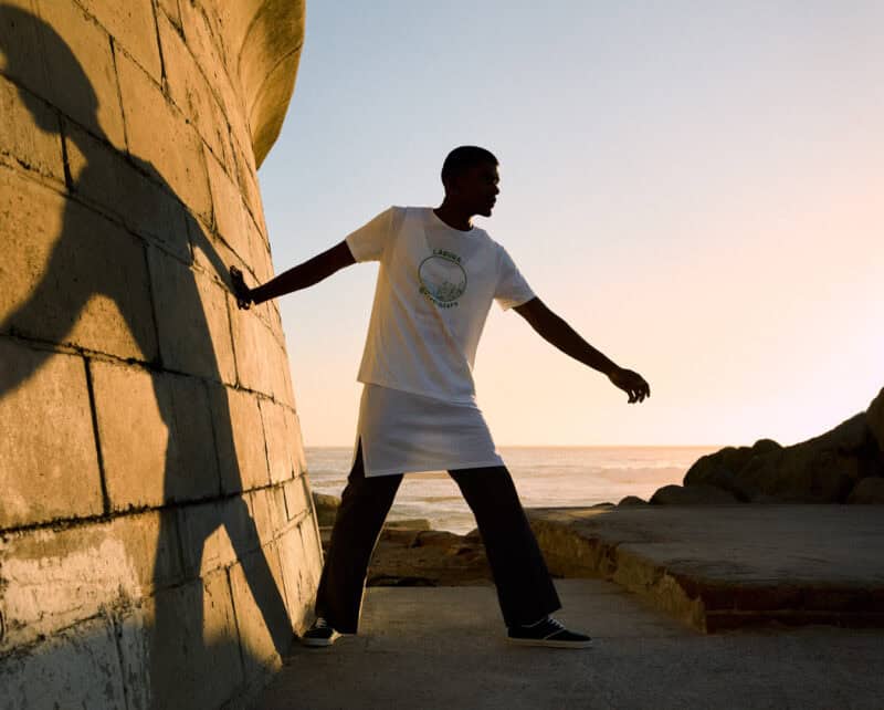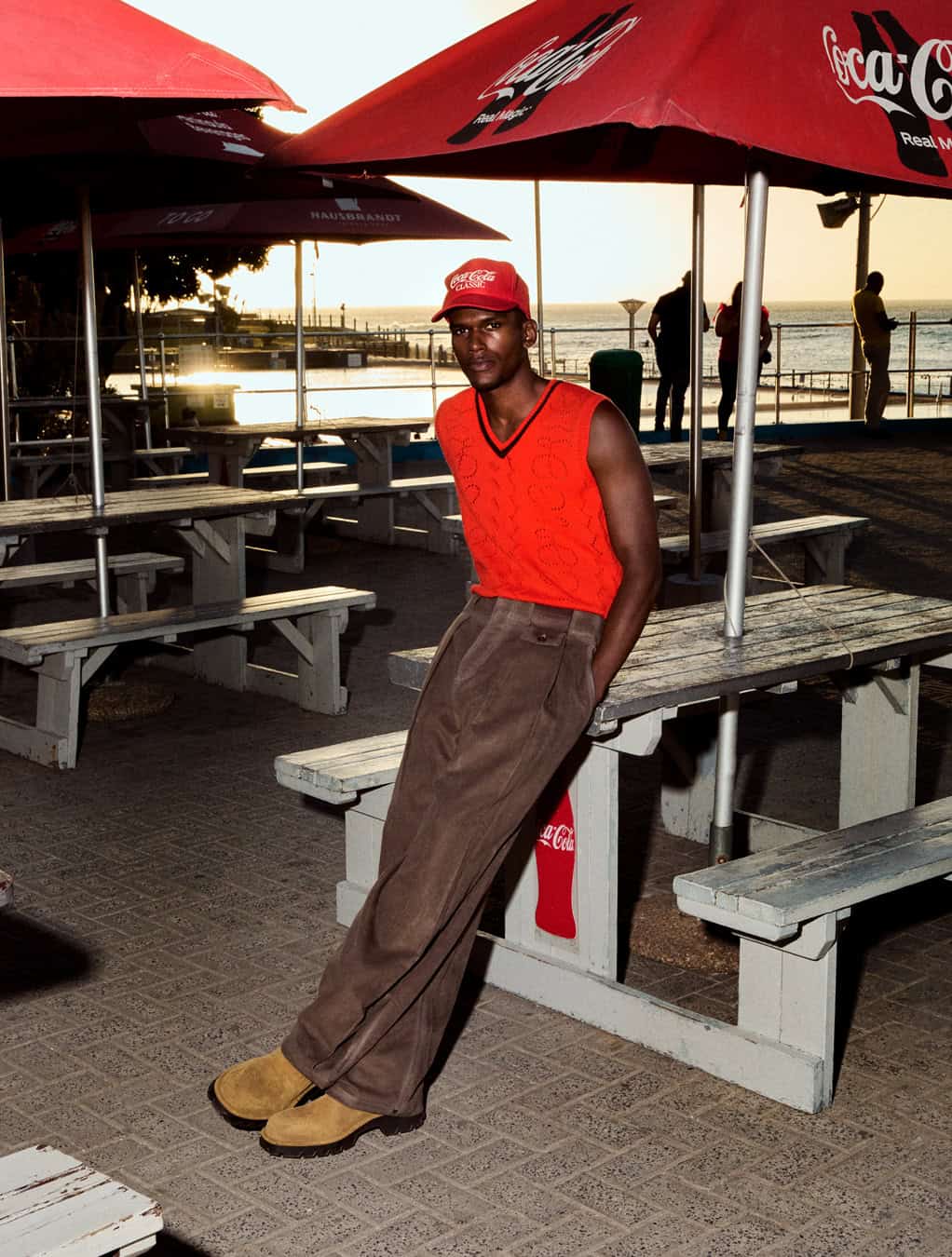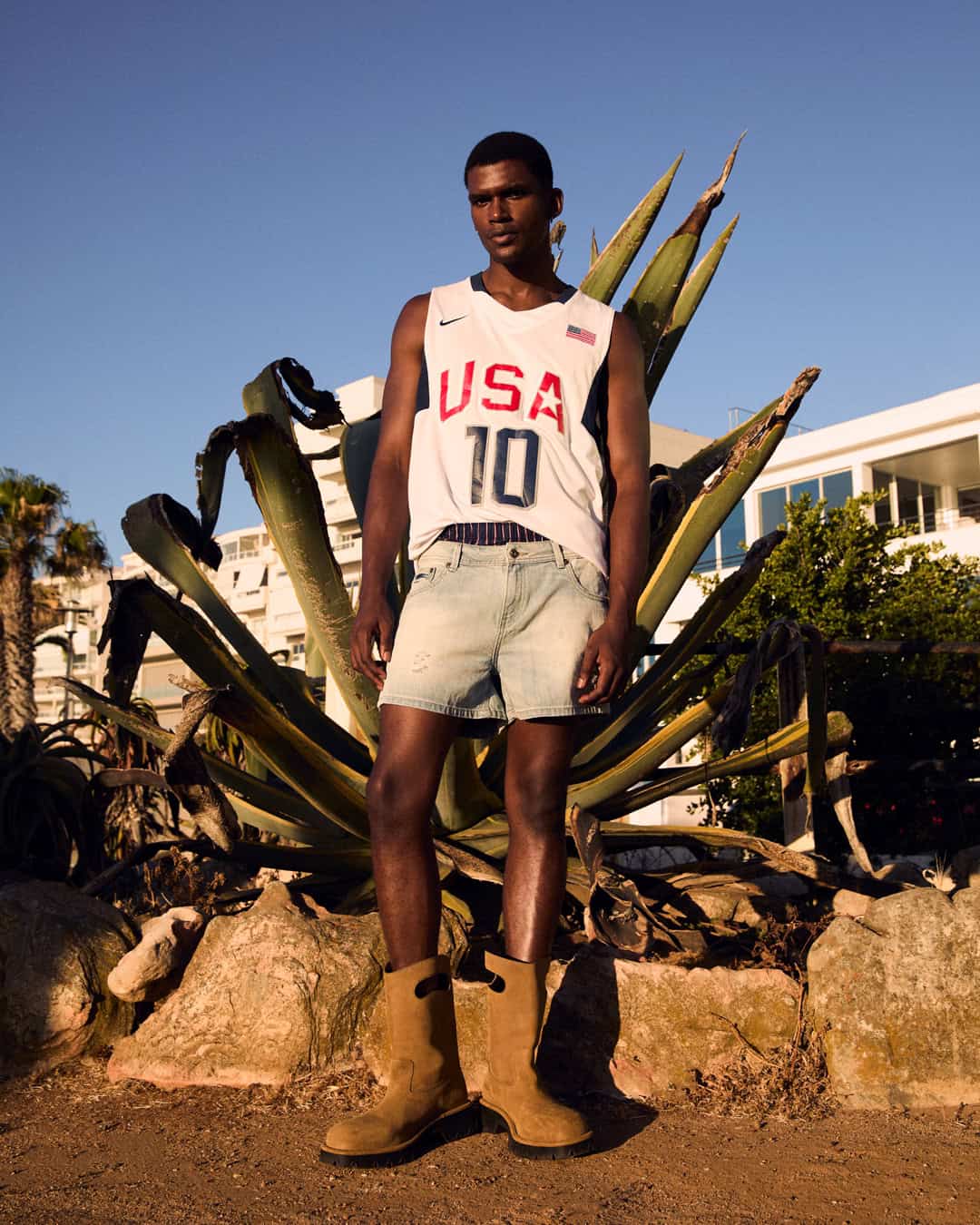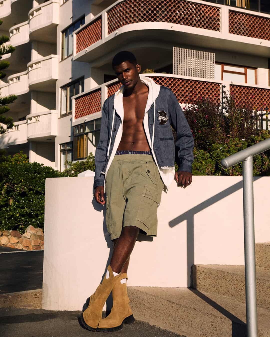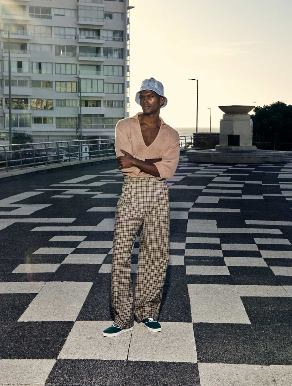 from left: top and trousers by ZEGNA, shoes by PRADA and top by NIKE, shorts by GUESS