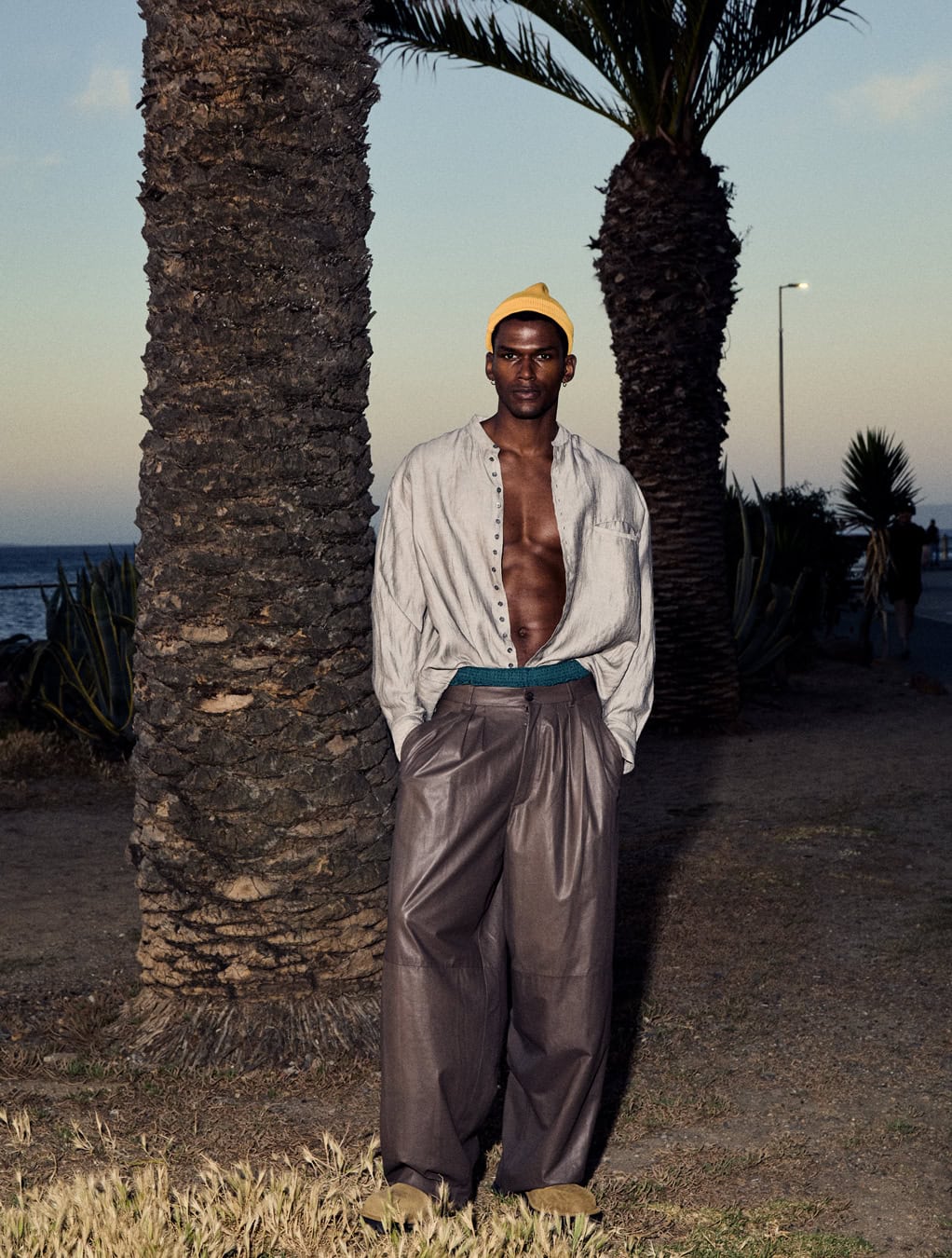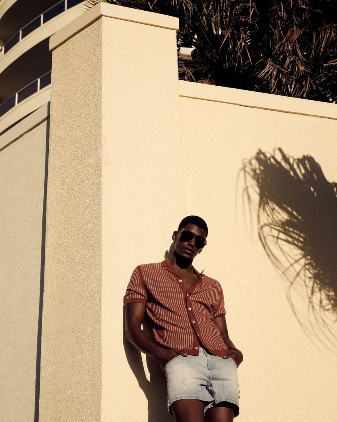 from left: shirt by PIACENZA 1733, shorts by GUESS, sunglasses by GUCCI and top and trousers by LOEWE