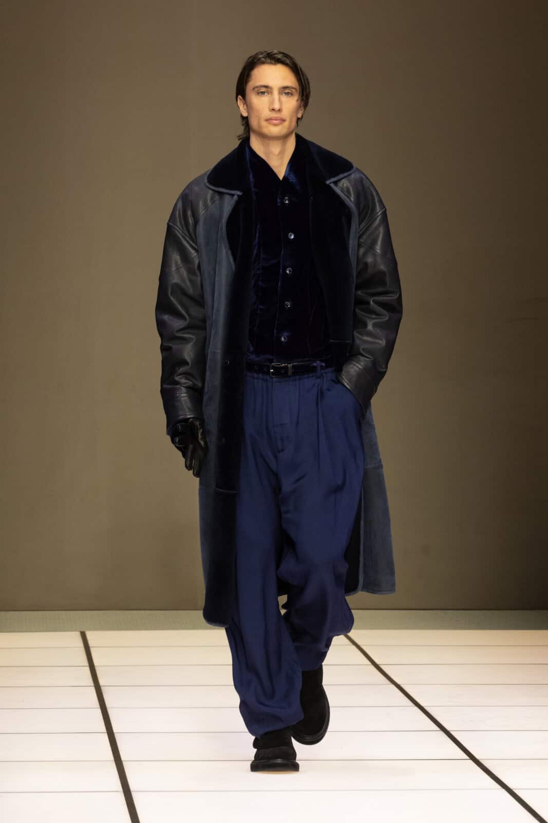 In doing so, Dell’Orco doubled down on the codes that have shaped the brand to become one of this biggest fashion titans in the world. There was louche suiting, cut from silky velvets and handsome checks in muted shades but also emeralds and delightful aubergines. Suited and booted business attire became casual when worn beneath slouchy bombers in chocolate leathers. Outwear was a standout, whether it was aviator jackets or roomy, woollen overcoats that cocooned the wearer.