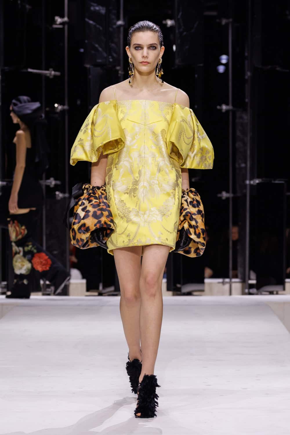 With that groundwork laid, it was time to expand the vocabulary to reflect the diversity of the women she dresses. “This one was more personal,” said Burton. Alongside precision-cut velvet gowns, spliced to the hip, she introduced a new flamboyance, with animal print, ‘20s deco party dresses inspired by an Erté drawing. Some pieces were worn with little sleevelets or mittens in matching fabrics. That detail came from a happy accident. “I was slicing sleeves off, and it just fell down,” she said. She liked the look and kept it.