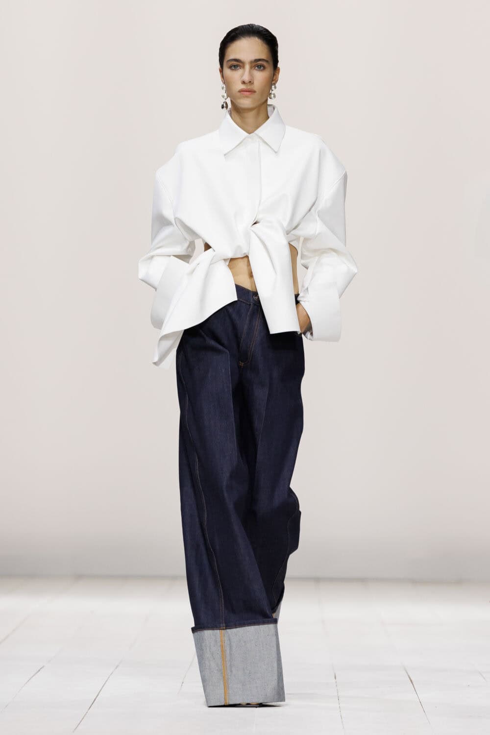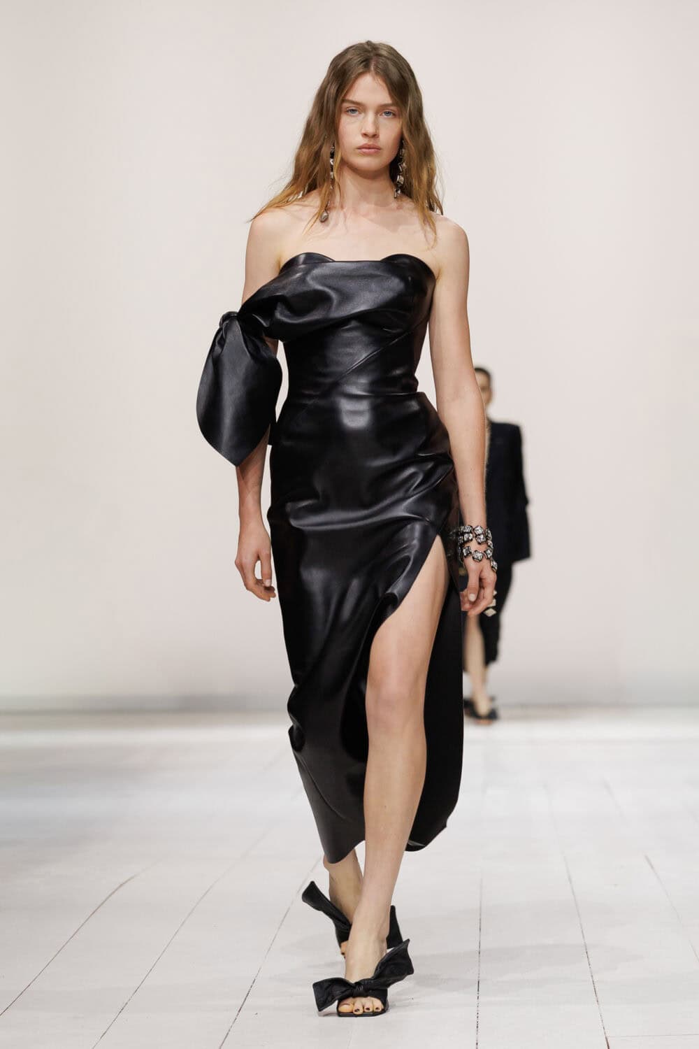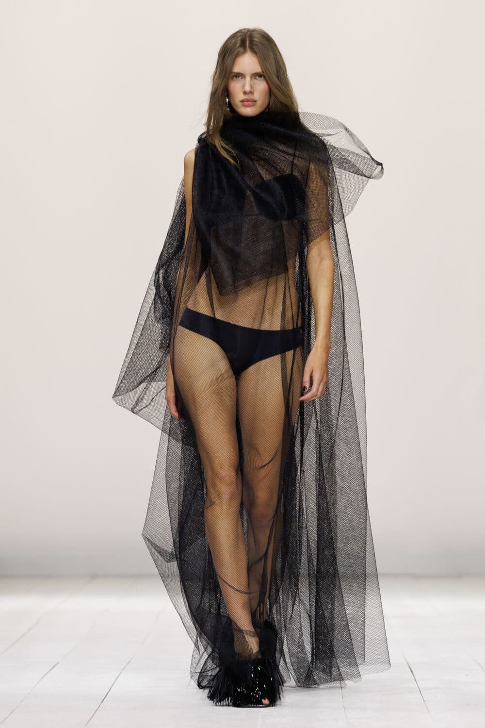 The body is the star and there was plenty of skin on show. One mini dress, made from strands of large crystals was akin to wearing nothing but a necklace. The mesh pieces which went viral last season are back a red maxi version came with an architectural mesh ruff around the shoulders or festooned with frills.