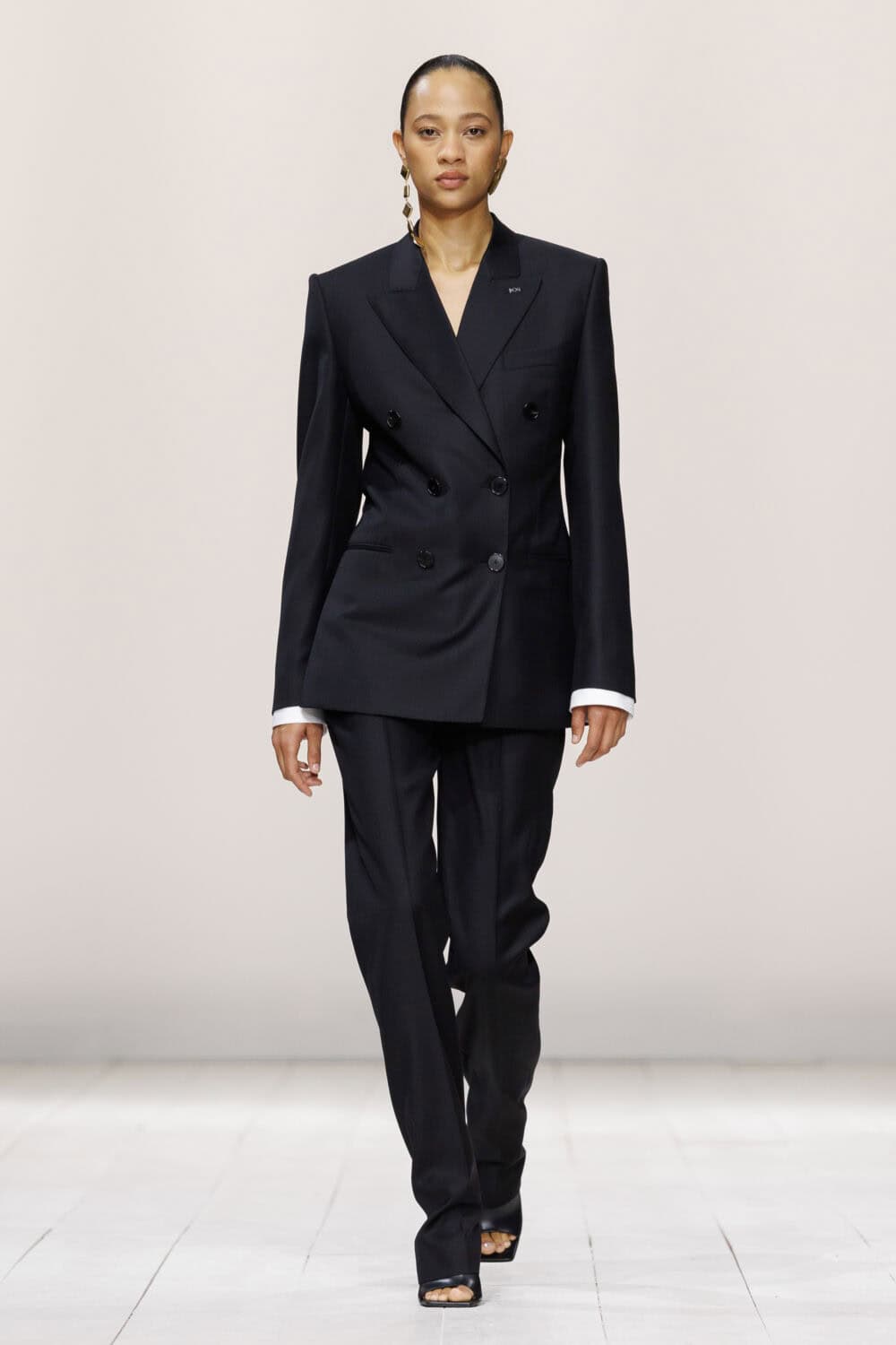 Her clothes thrill with that emotional intelligence. Her masterful skill as a tailor allow her to reveal and conceal. Jackets were cut away behind to reveal the small of the back, or cropped to frame the waist, the clavicle was beautifully framed by lapels cascading from the shoulder of little coat dresses and jackets – with just a hint of lingerie strap. “I like the idea of like, intimacy and eroticism,” she explained, “that if you slice the back of a jacket and just tip it forward, it gives you this kind of very sort of important collar, but then you reveals the skin at the back of your neck. So there was a sort of sense of how much skin you show, how much do you not show a sense of intimacy, a sense of beauty.”