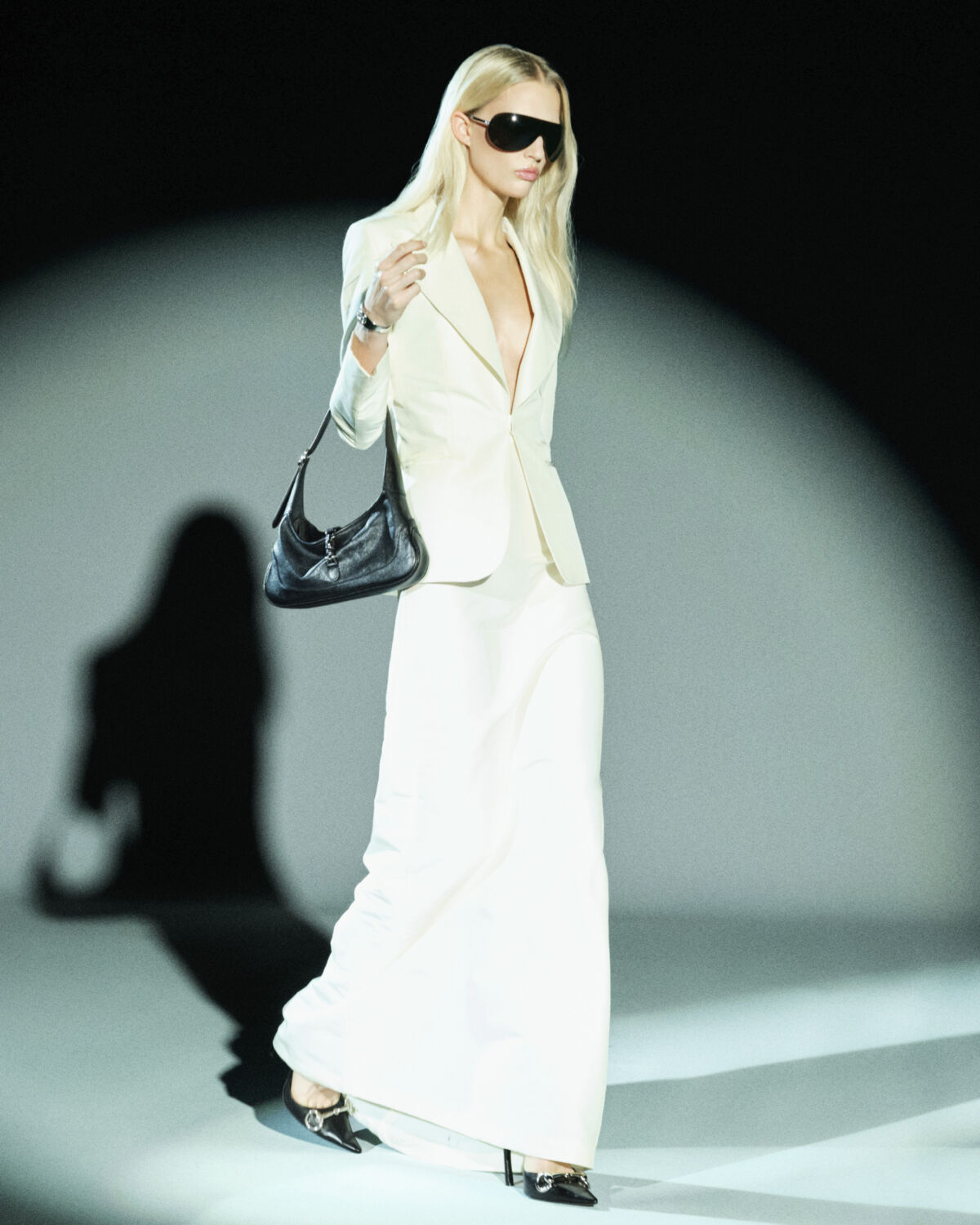 Demna’s research into ‘70s and ‘90s Gucci shows up in racer jackets with a web stripe, sliced Double G belt buckles, leather and suede looks and equestrian-print silk sets. Footwear stays streamlined, from Valigeria-influenced ballerinas to seamless-heel stilettos and ultra-light loafers dotted with spikes.
