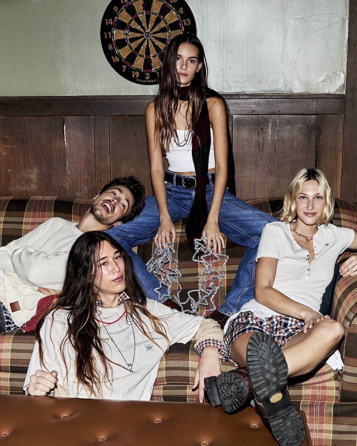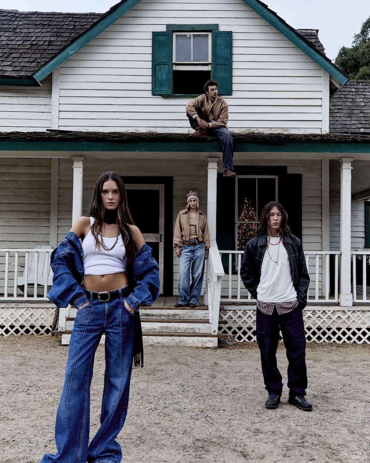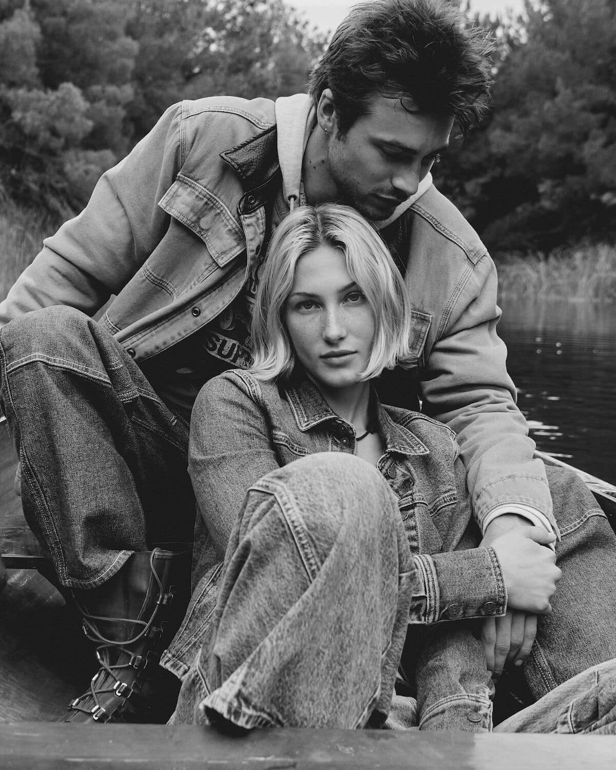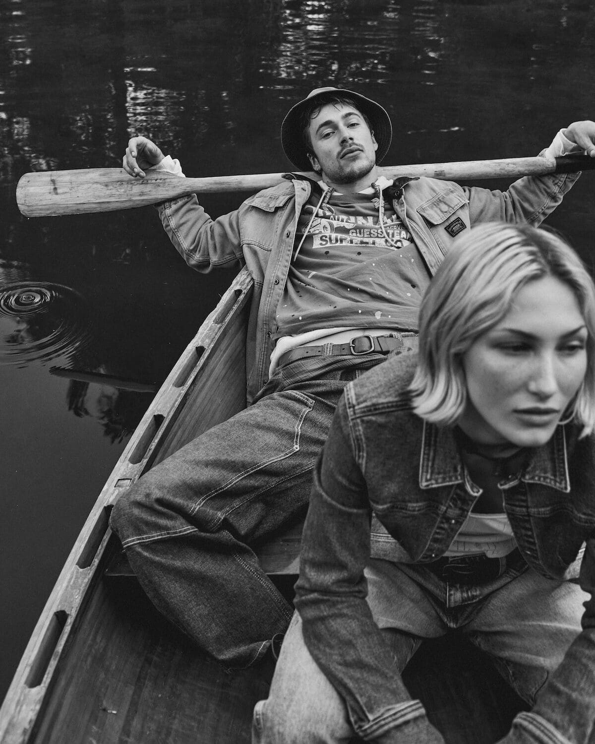 Bundle up in Guess Jeans everyday essentials this festive season, where holiday warmth gets a modern, slightly mischievous twist. Think guitars propped beside a riot of tartan-wrapped presents, knitwear that slouches just so and denim softened by the glow of a too-big Christmas tree. Friends sprawl across patterned rugs and piano benches like characters in a snow-day film – half-dressed for the outdoors, half-ready to stay in forever. Vintage snowshoes, scratched skis and old photographs set the scene: a lodge-core dream layered with texture, attitude and charm. Whether drifting lazily in a canoe or lounging fireside, Guess Jeans turns everyday essentials into festive, cinematic moments.