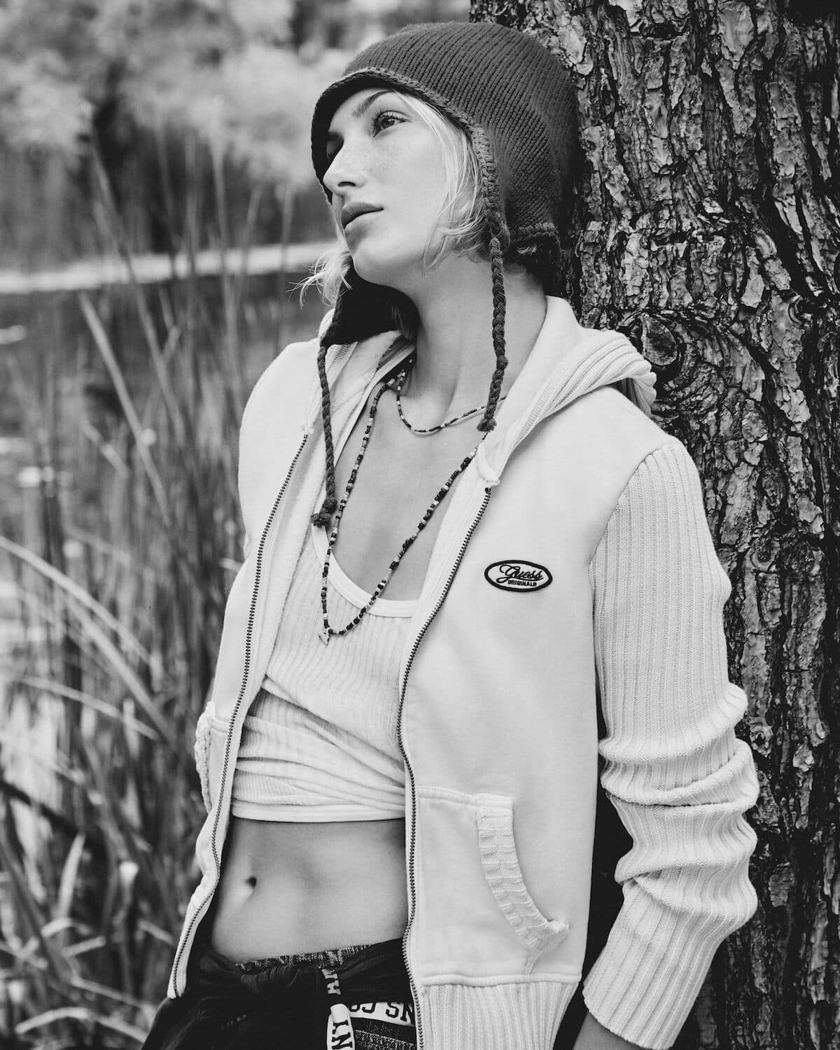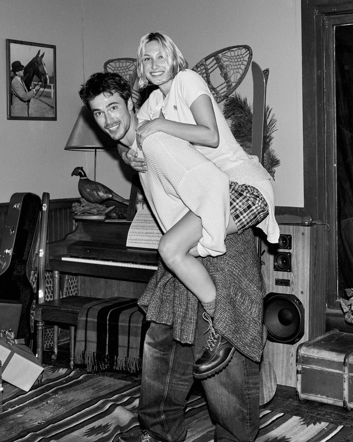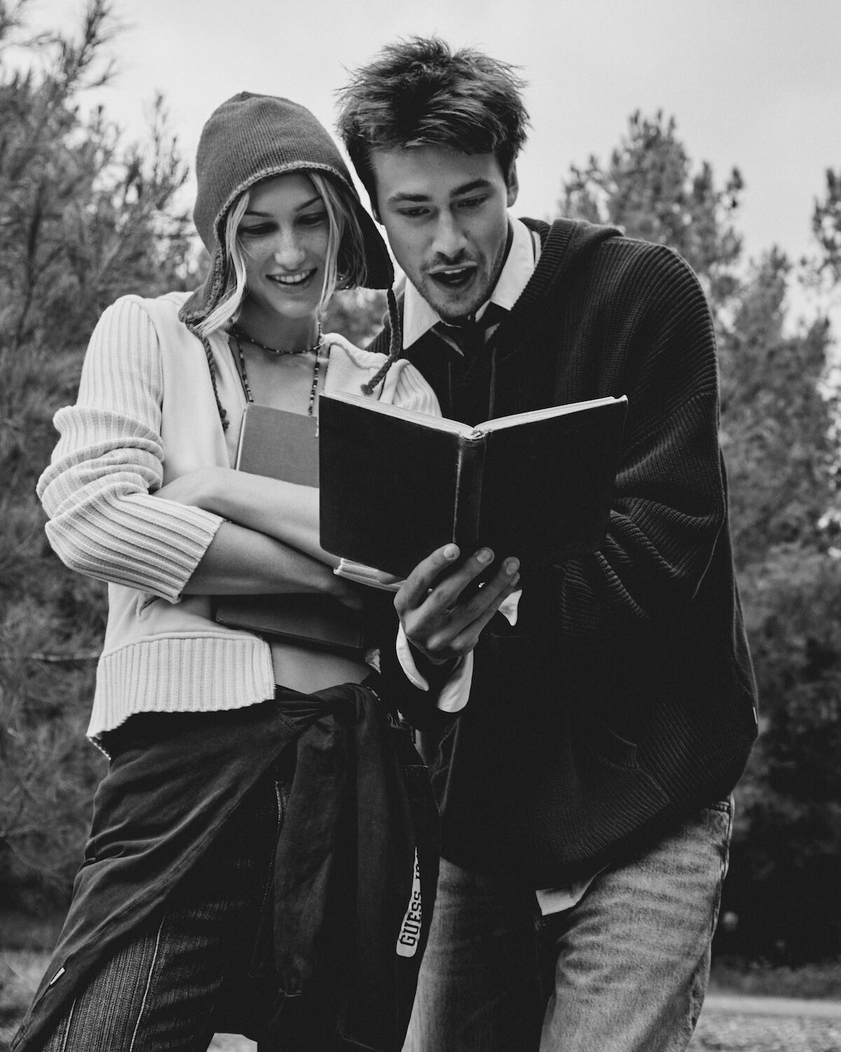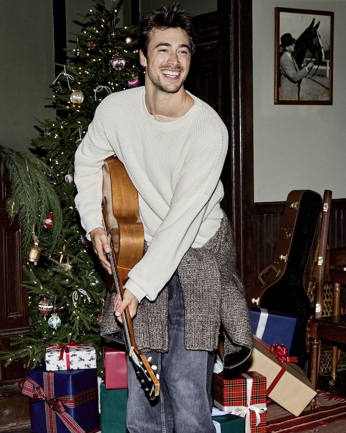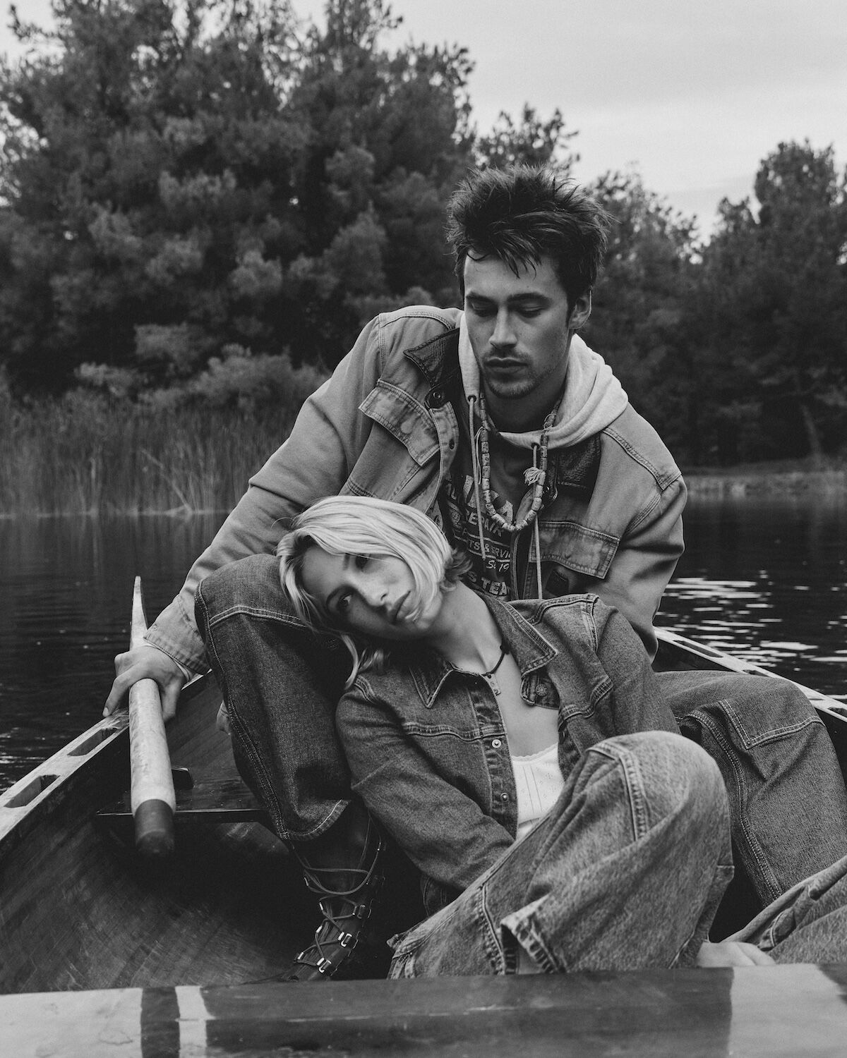 Bundle up in Guess Jeans everyday essentials this festive season, where holiday warmth gets a modern, slightly mischievous twist. Think guitars propped beside a riot of tartan-wrapped presents, knitwear that slouches just so and denim softened by the glow of a too-big Christmas tree. Friends sprawl across patterned rugs and piano benches like characters in a snow-day film – half-dressed for the outdoors, half-ready to stay in forever. Vintage snowshoes, scratched skis and old photographs set the scene: a lodge-core dream layered with texture, attitude and charm. Whether drifting lazily in a canoe or lounging fireside, Guess Jeans turns everyday essentials into festive, cinematic moments.