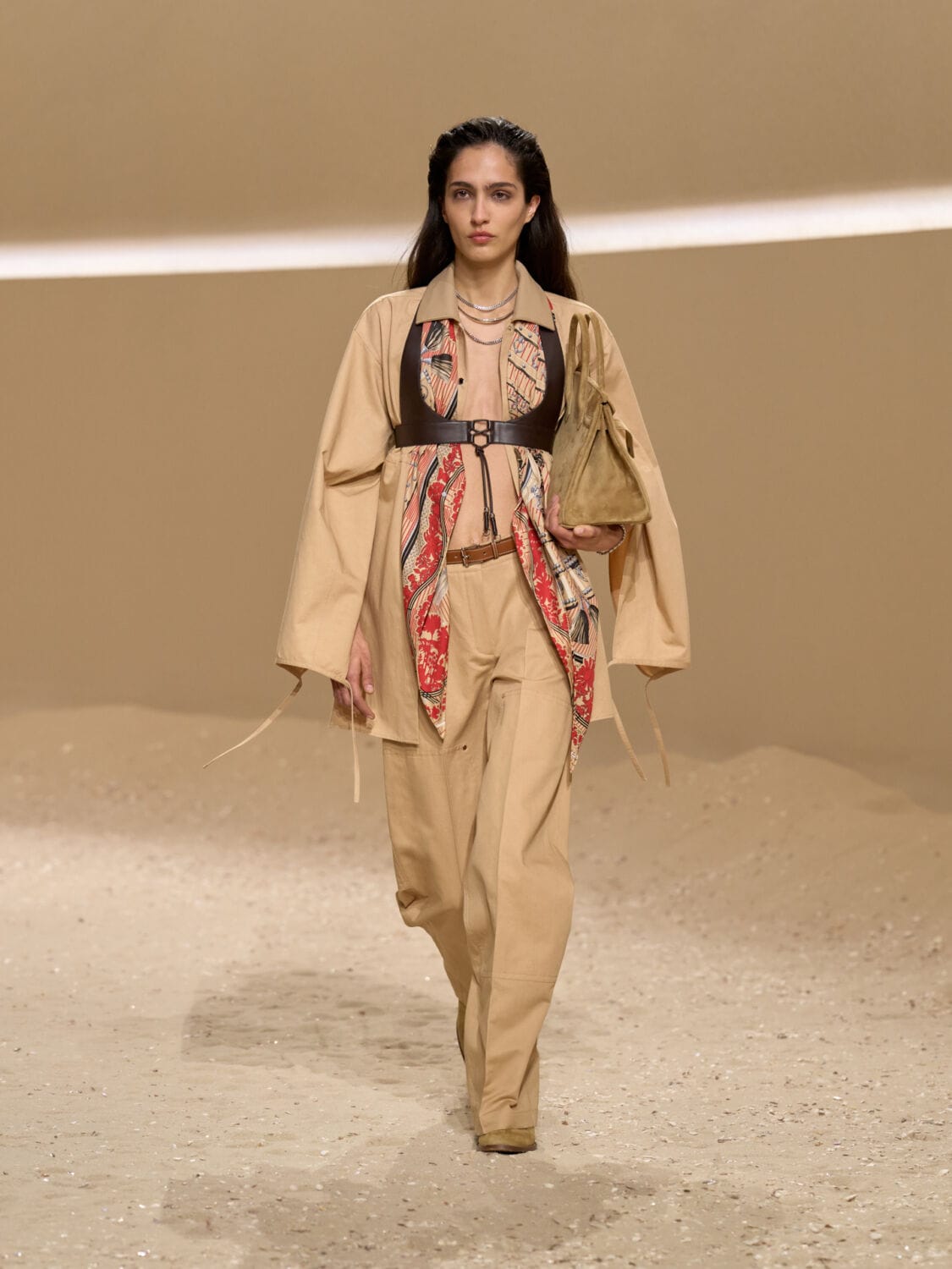 Inspired by France’s Camargue region – its wild nature, cowboy culture and white horses, Nadège Vanhée brought a freer, more bohemian feeling to the Hermès equestrian story. Describing the region as “a land of bohemians, gypsies – and freedom,” she said, “I wanted to bring this zest of freedom to equestrian style, which is often associated with the strict and the rational. I wanted to let go and give it a sense of spontaneity and fullness.”