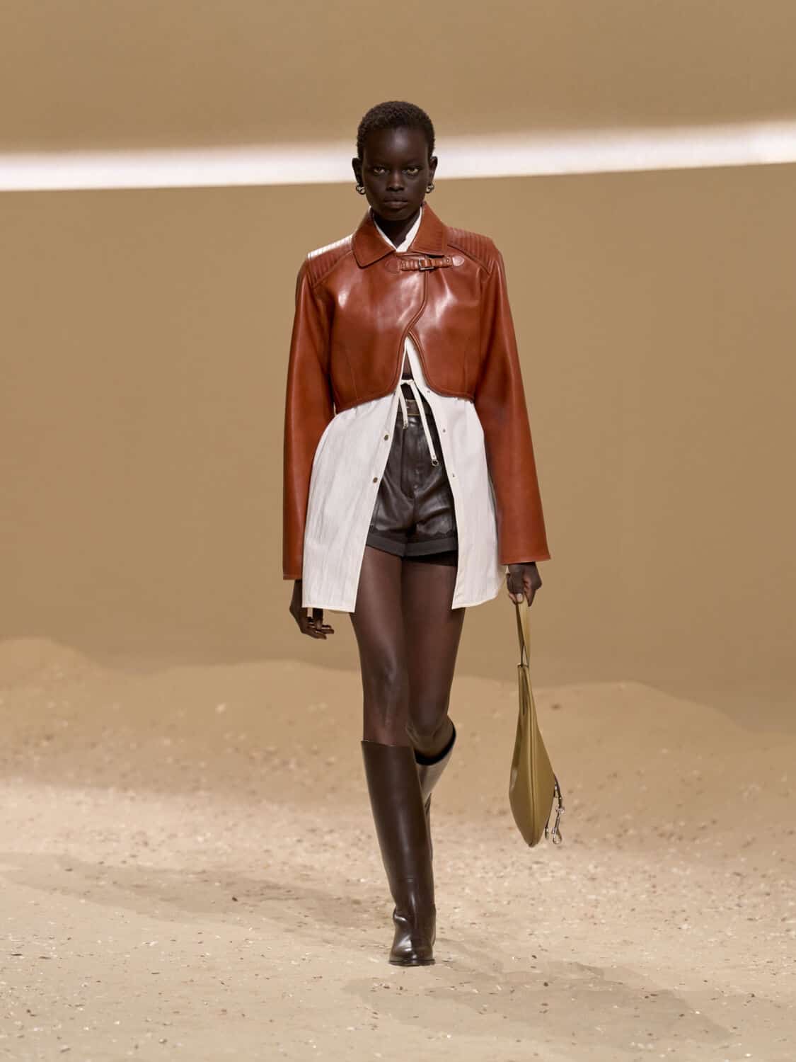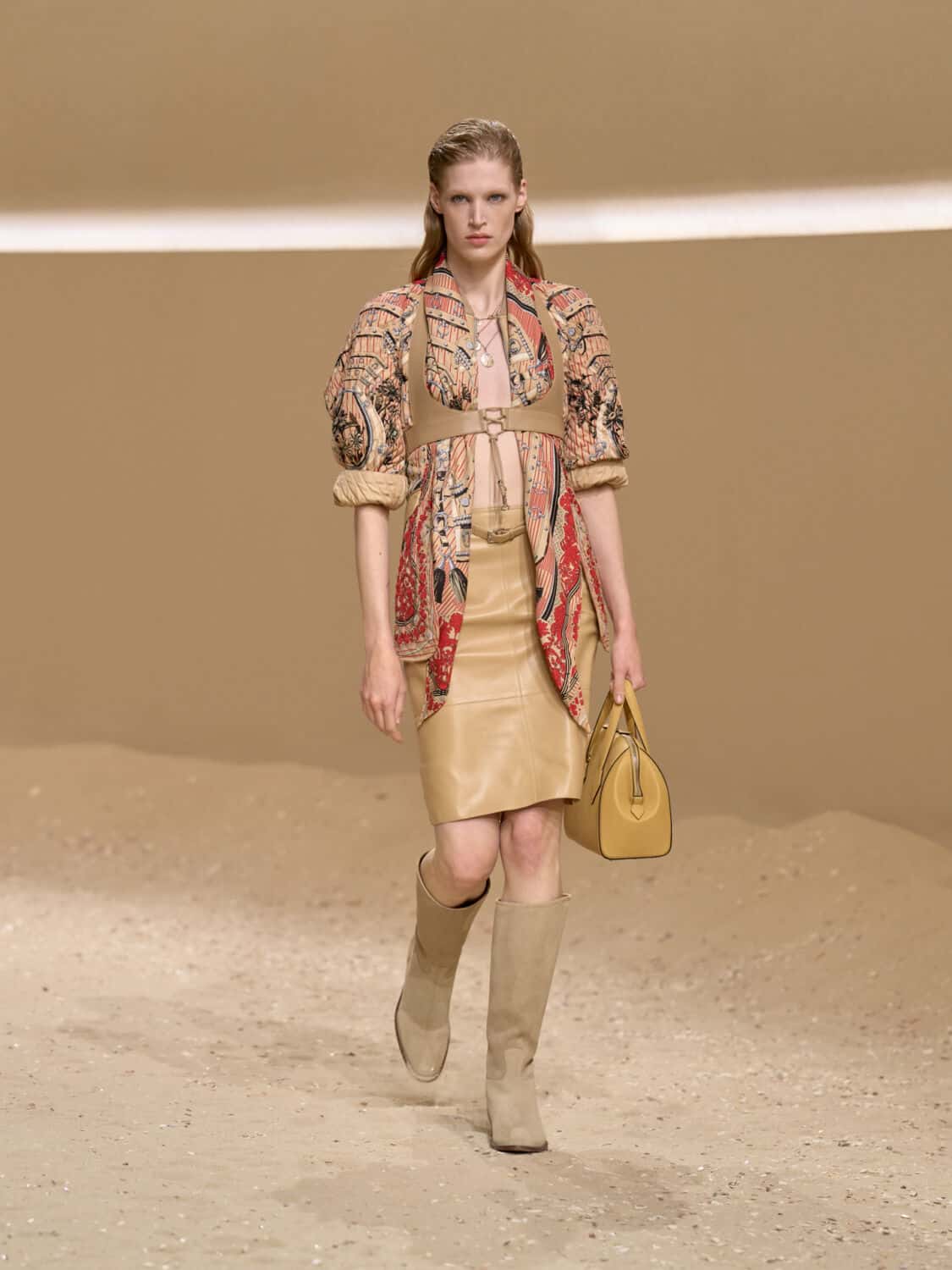 The designer took direct inspiration for the collection from a saddle in the Hermès archive made in the Carmargue style with a distinctive curving backrest. That curving detail was applied to coats and jackets, along with harness buckles and, lacing detail. Also inspired by the archive saddle, a few special pieces – a zip coat, bolero jacket and waistcoat – with the distinct patina of hand polished tan leather.