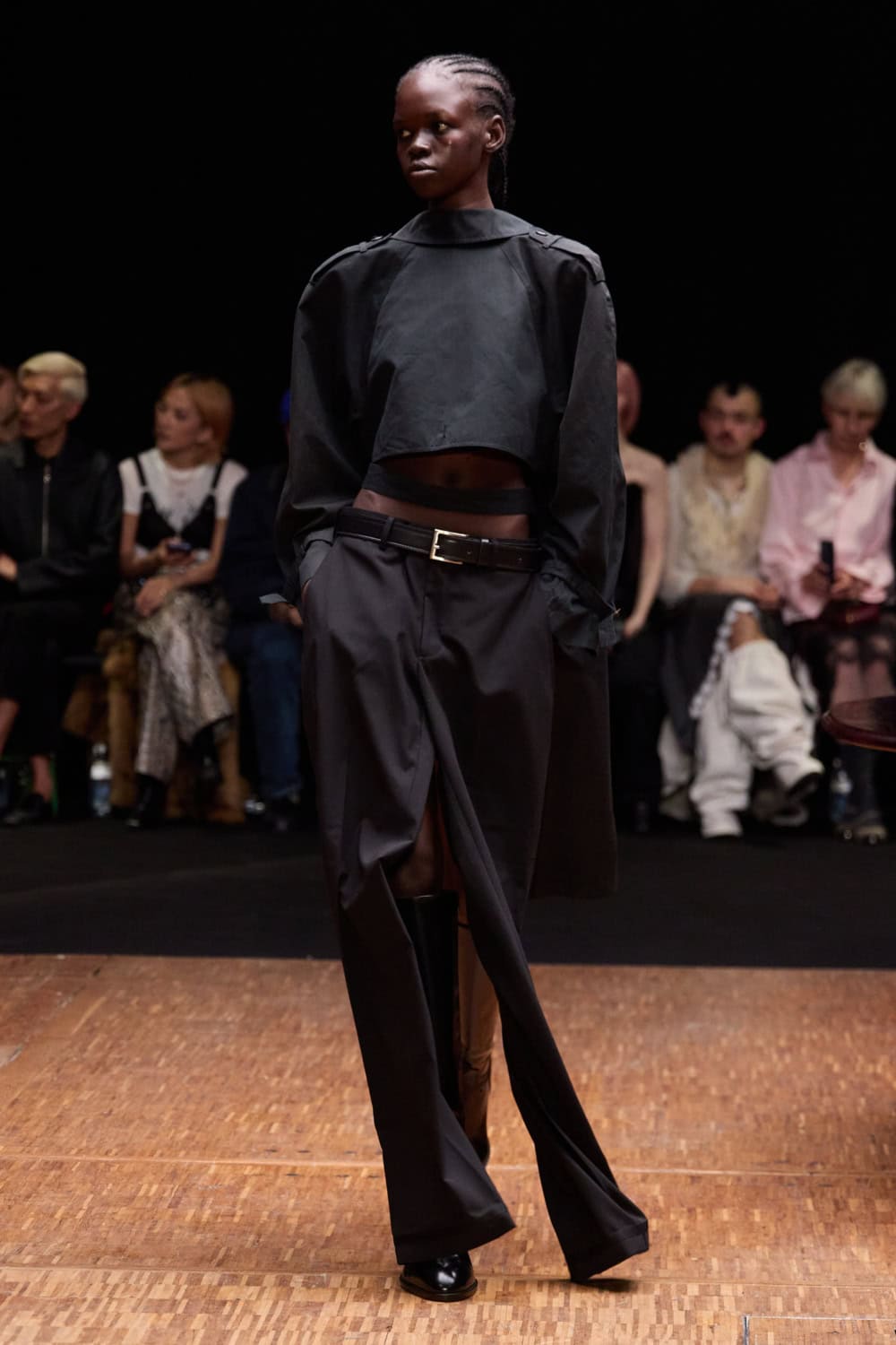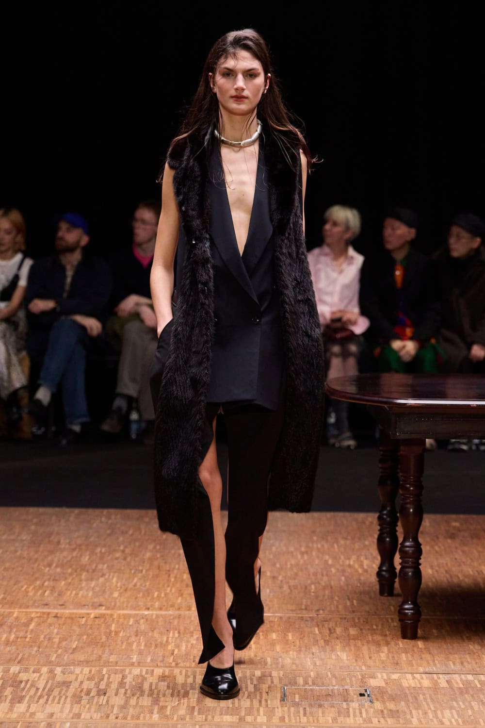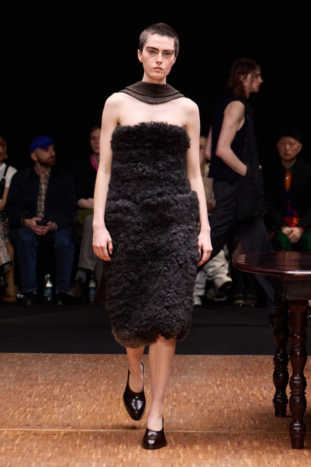 Silhouettes explored the tension between exposed and adorned. Front-facing coats and sleeveless blazers were sharply tailored, elongating the body, while backs were stripped away, baring torsos and hinting at vulnerability. Narrow trousers disciplined the stride, oversized shoulders and tightened hems gave structure, and layered panels of linen, tweed and upcycled textiles fell like extensions of the domestic set. Barefoot models wandered as if caught dressing alone; when shoes appeared, they nodded to tradition – wedge heels, riding boots, reworked menswear – grounding the pieces in lived experience.