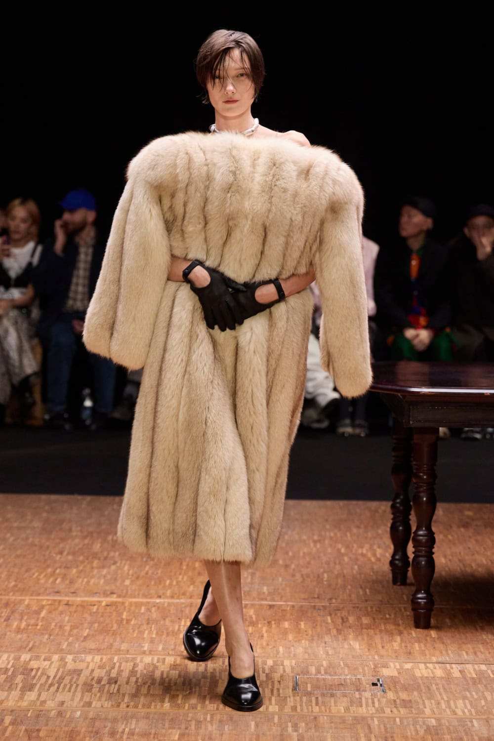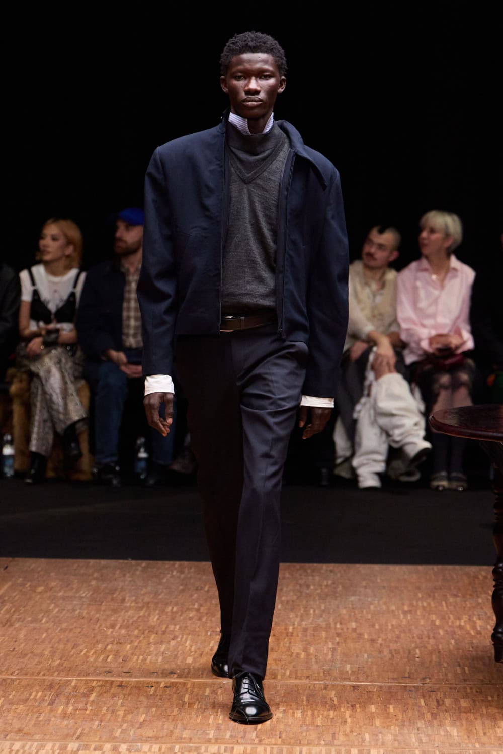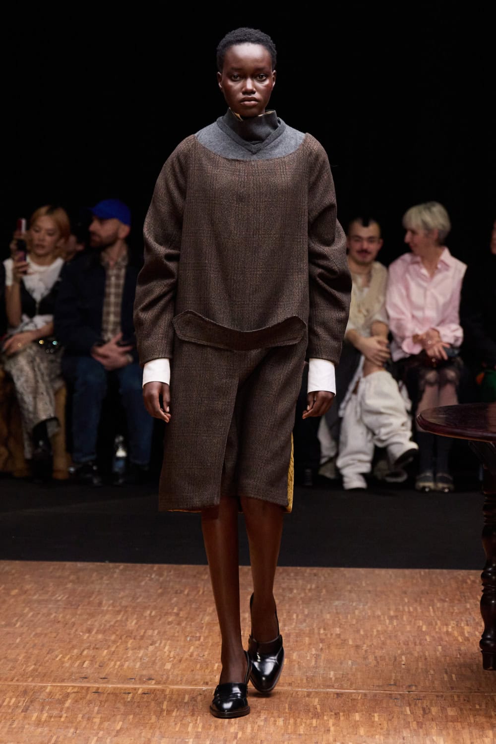 Silhouettes explored the tension between exposed and adorned. Front-facing coats and sleeveless blazers were sharply tailored, elongating the body, while backs were stripped away, baring torsos and hinting at vulnerability. Narrow trousers disciplined the stride, oversized shoulders and tightened hems gave structure, and layered panels of linen, tweed and upcycled textiles fell like extensions of the domestic set. Barefoot models wandered as if caught dressing alone; when shoes appeared, they nodded to tradition – wedge heels, riding boots, reworked menswear – grounding the pieces in lived experience.