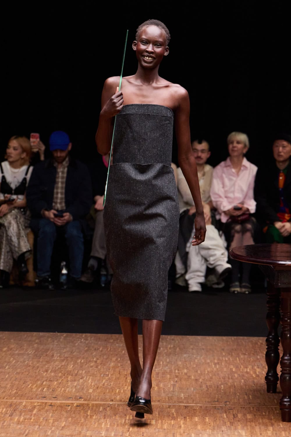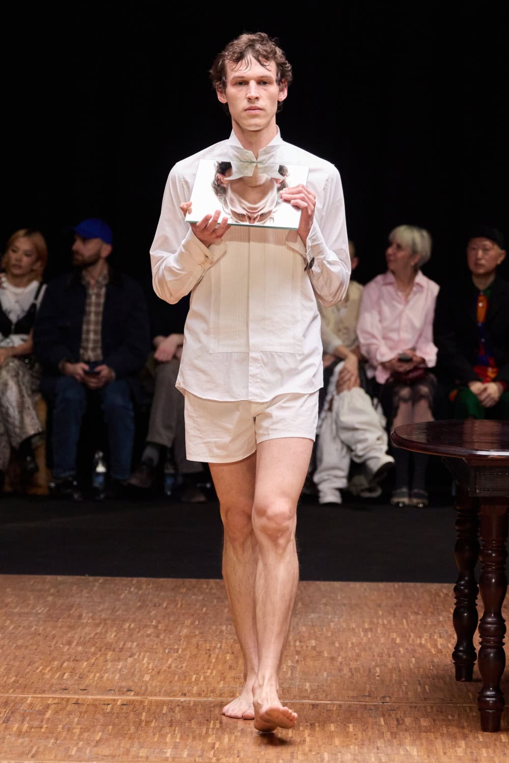 Unexpected materials threaded the collection together. Horsehair violin strings wound up the body, silver spoons became jewellery, and tea towels and chair parts were folded into skirts, dresses and tops, blending craft, humour and self-reflection. Mirrors and glass surfaces punctuated the room, doubling the imagery and the inner gaze.