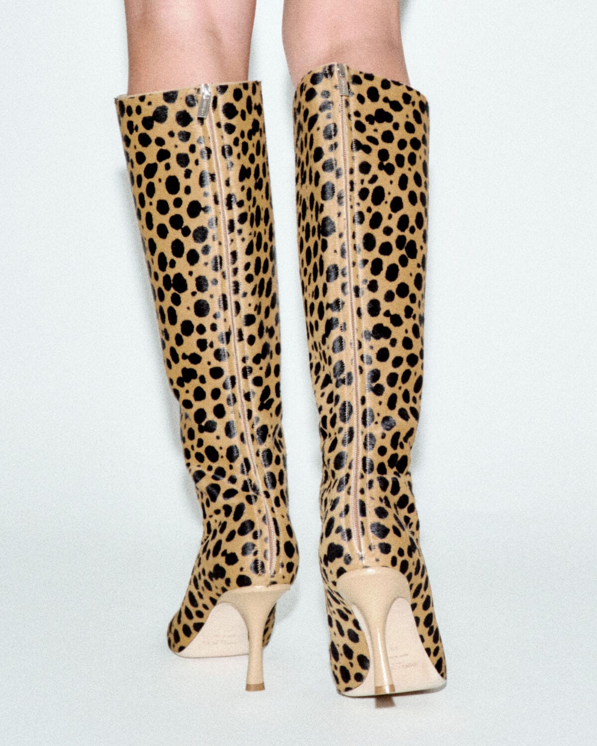 Welcome to the jungle. Jimmy Choo and Conner Ives have teamed up once again, this time on a capsule that roars with animal print and attitude. First spotted on Ives’ AW25 runway, the new drop takes two archival Choo icons – the Agathe boot and its mule cousin – and reimagines them as the Gloria Knee Boot 85 and Gloria Mule 85. The reference? Gloria Guinness, one of Truman Capote’s “Swans” and an all-round fashion siren.