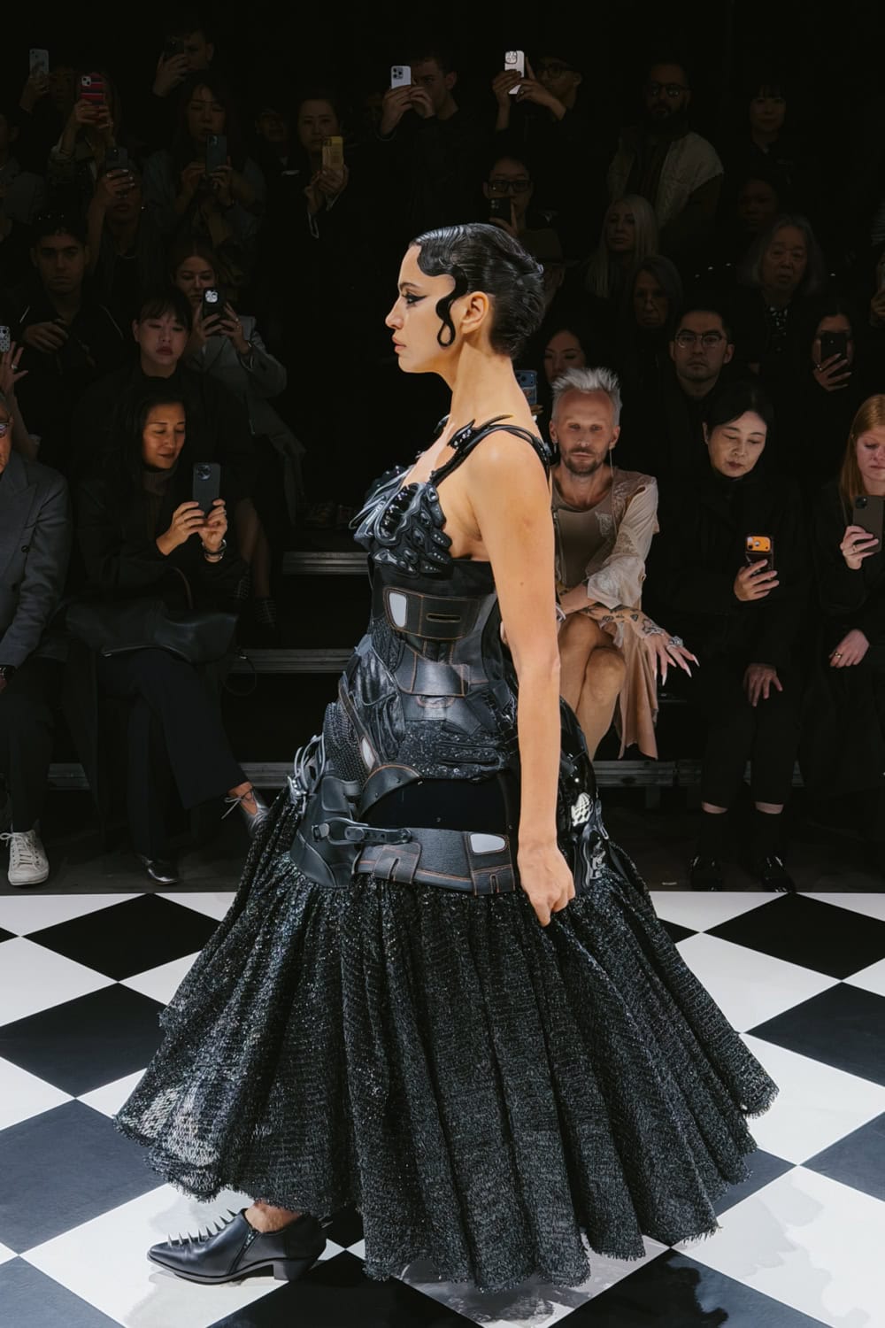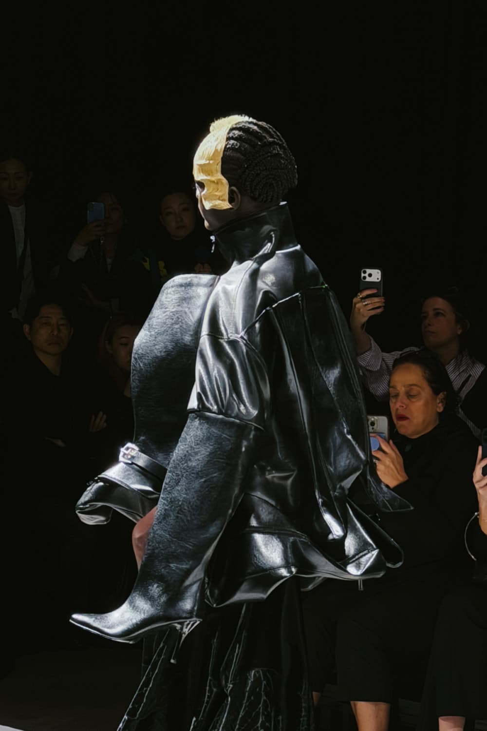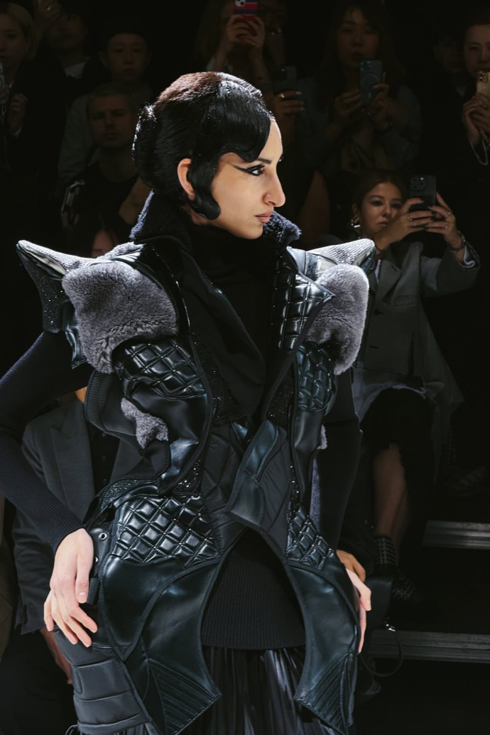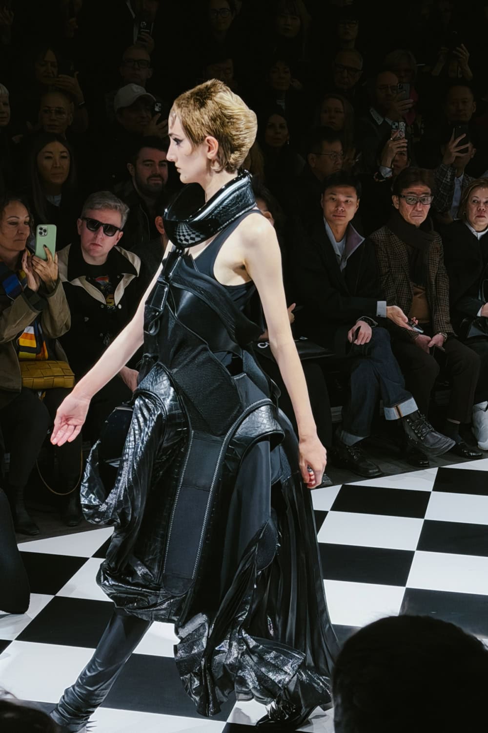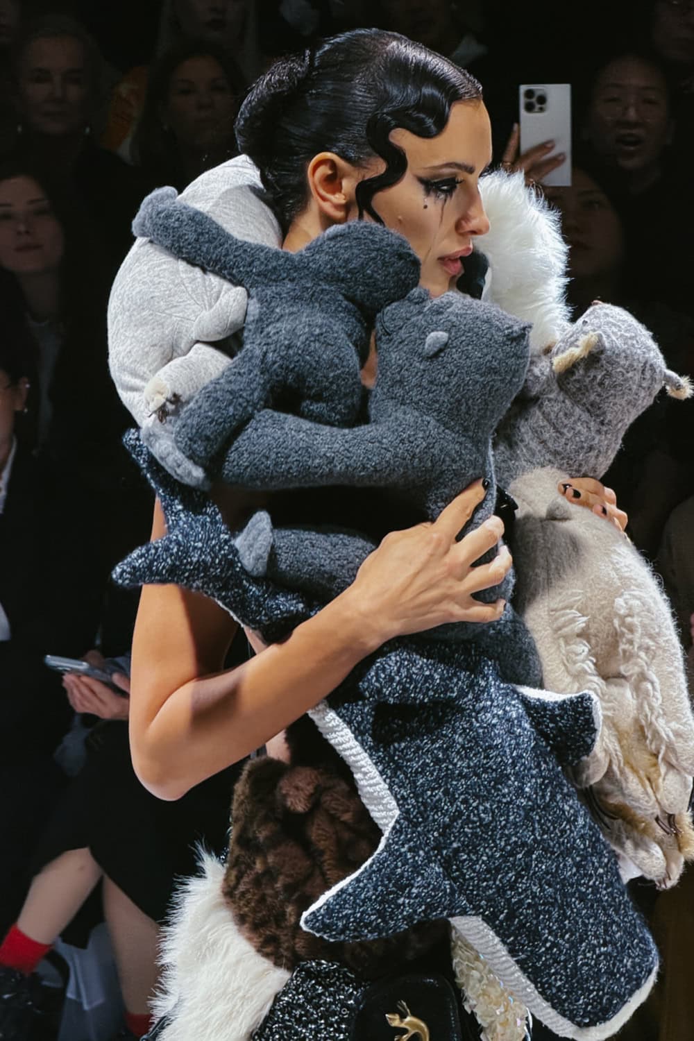 Watanabe presented it with a layer of theatre. Working with movement director Pat Boguslawski, he instructed his models, including Irina Shayk and couture favourite Maggie Maurer, to stalk the catwalk, vamping and throwing arch poses. With their hair gelled into retro kiss curls and Marcel waves, and their feline eyeliner running down their cheeks like tears, they looked like broken silent screen stars.