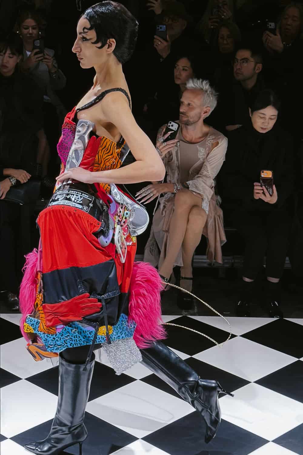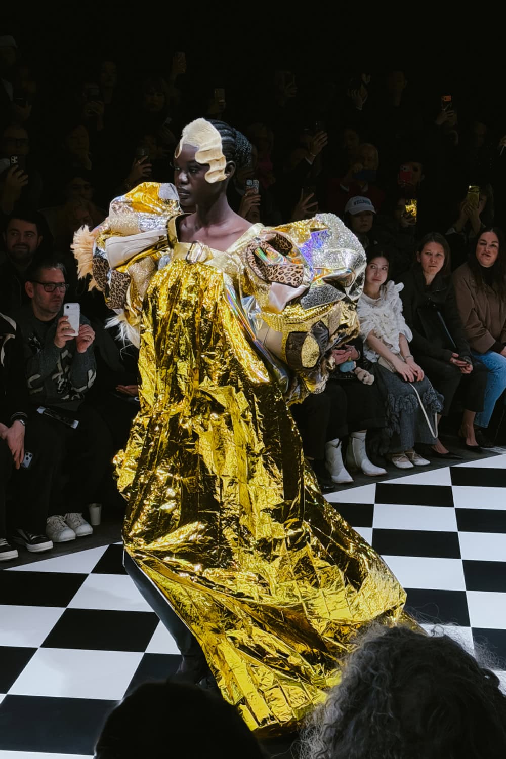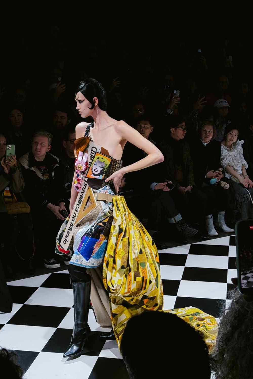 There were so many ingenious, I-can’t-believe-my-eyes moments. Was that really a gown made from the metallic foil blankets given to marathon runners at the finish line? Stiletto boots became the sleeves and back panel of a swing-jacket. One model wore a stole made from stuffed animal toys. A pair of printed 1950s curtains looked like they’d been whipped  off the window and attached to the back of one look to form a sweeping train. The front of that look had a bodice made from wooden set squares, a prize rosette and a glittery portrait of Marilyn Monroe. A strip of signage, worn across the body like a beauty queen’s sash read in Spanish: “May peace prevail in the world”.
