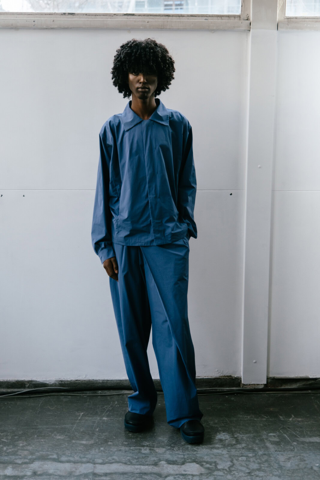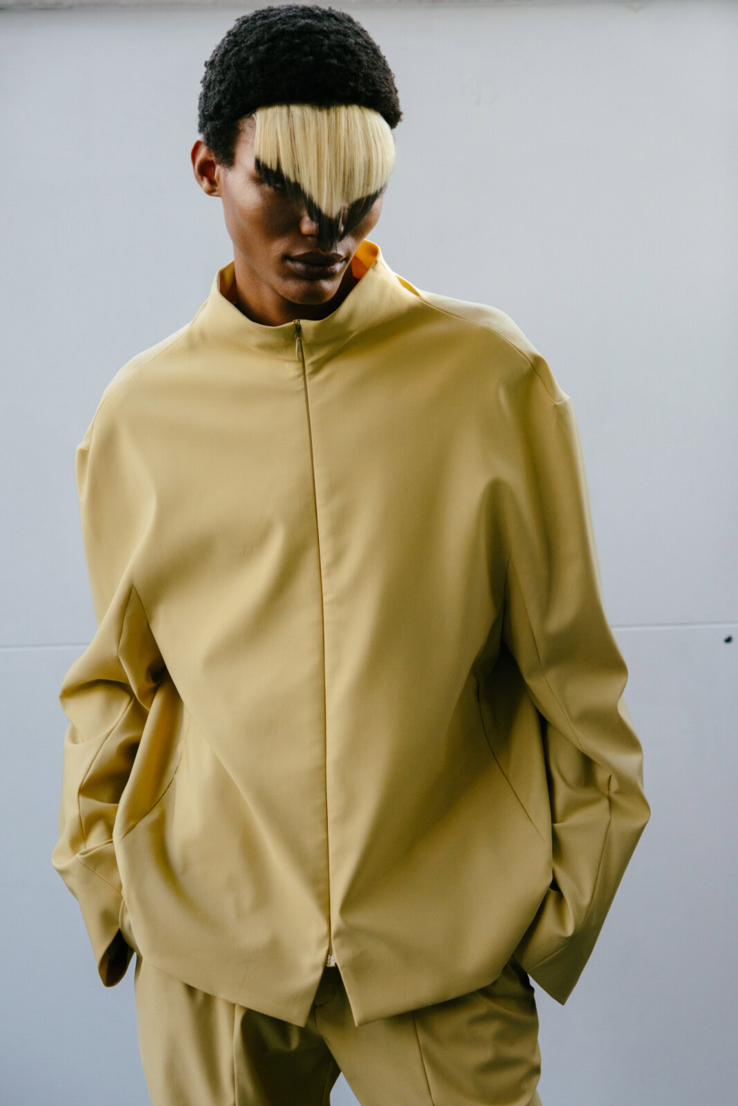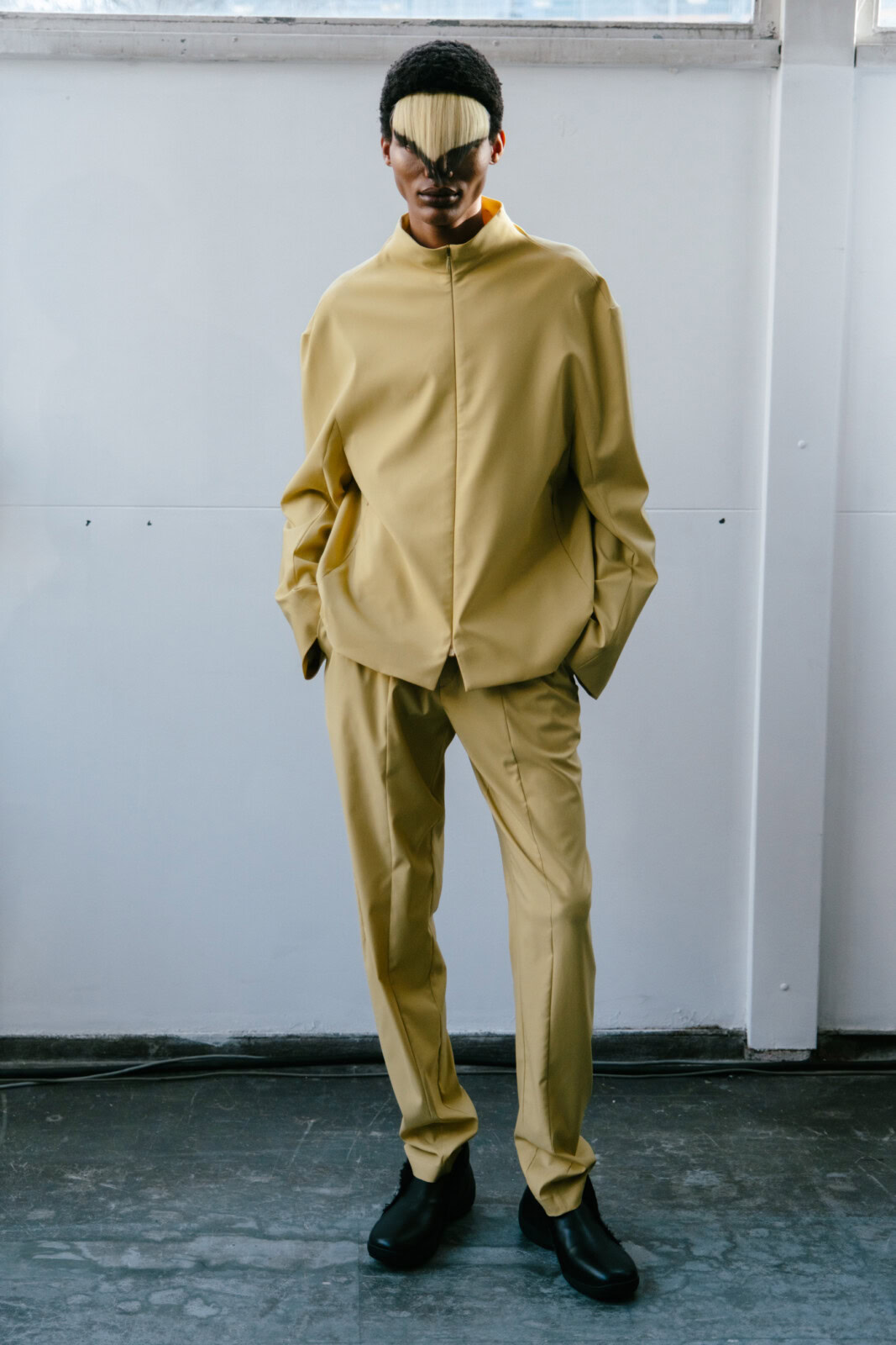 There was plenty to marvel at here. Tunic-style jackets came with origami folds. Silhouettes were fluid, from elongated suit jackets paired with slouchy trousers to swirling cotton dresses. As the collection progressed, blacks and muted blues transitioned into mustard yellows and crimson, where a series of all nylon looks that closed the show looked like jockey uniforms that were chopped and reconfigured. In stripping things back, you  could truly appreciate the technical brilliance of Kostadinov’s work. It was another solid outing from one of London’s finest.