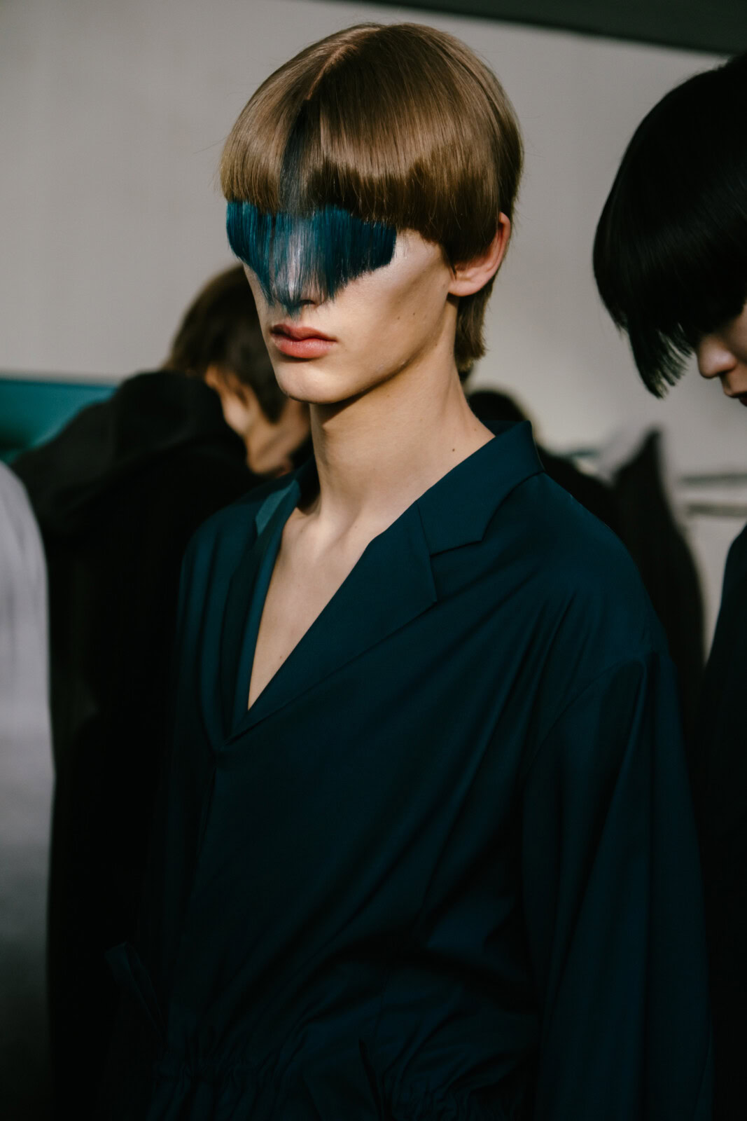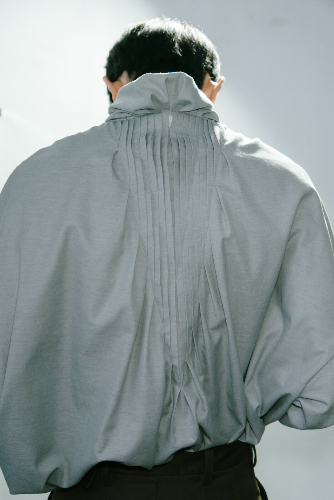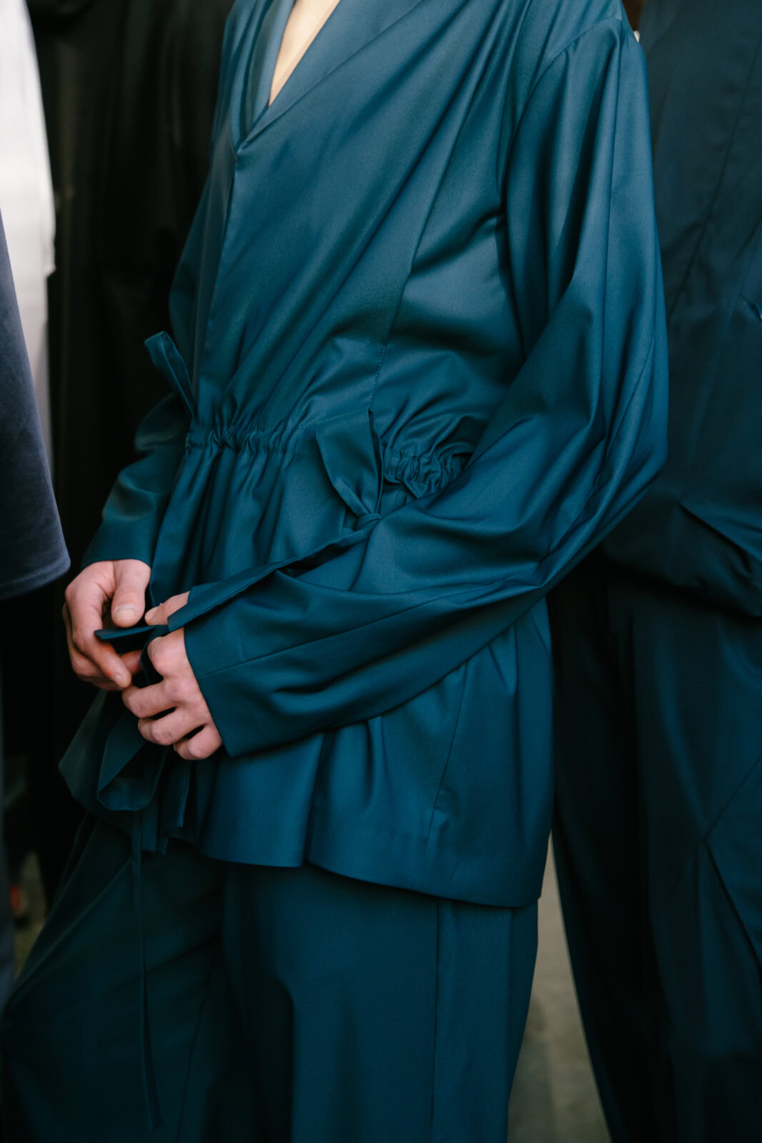 There was plenty to marvel at here. Tunic-style jackets came with origami folds. Silhouettes were fluid, from elongated suit jackets paired with slouchy trousers to swirling cotton dresses. As the collection progressed, blacks and muted blues transitioned into mustard yellows and crimson, where a series of all nylon looks that closed the show looked like jockey uniforms that were chopped and reconfigured. In stripping things back, you  could truly appreciate the technical brilliance of Kostadinov’s work. It was another solid outing from one of London’s finest.