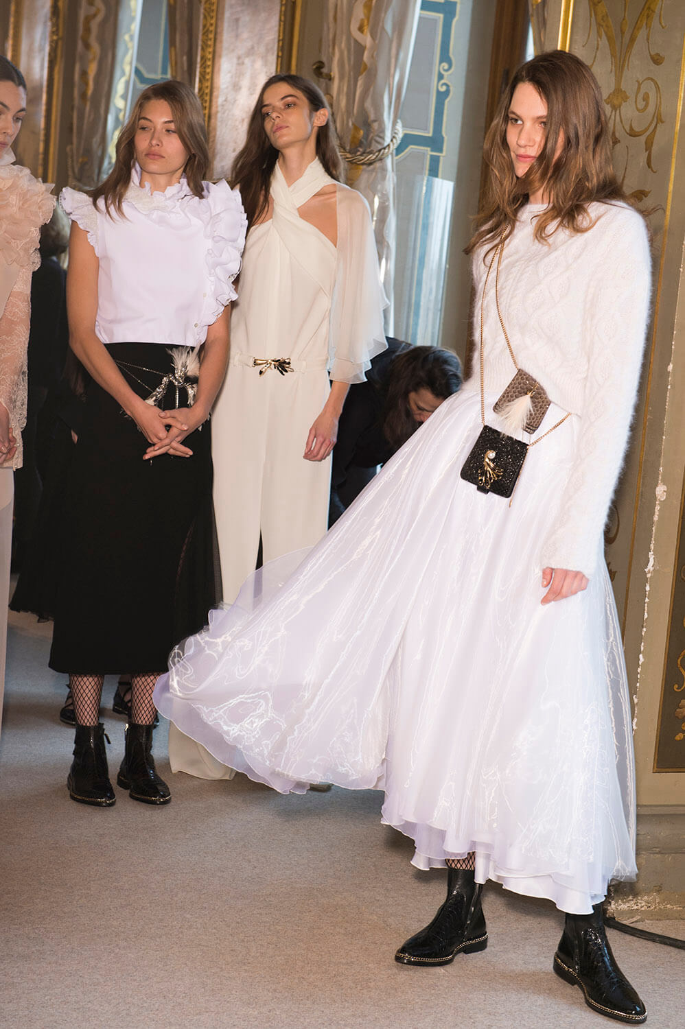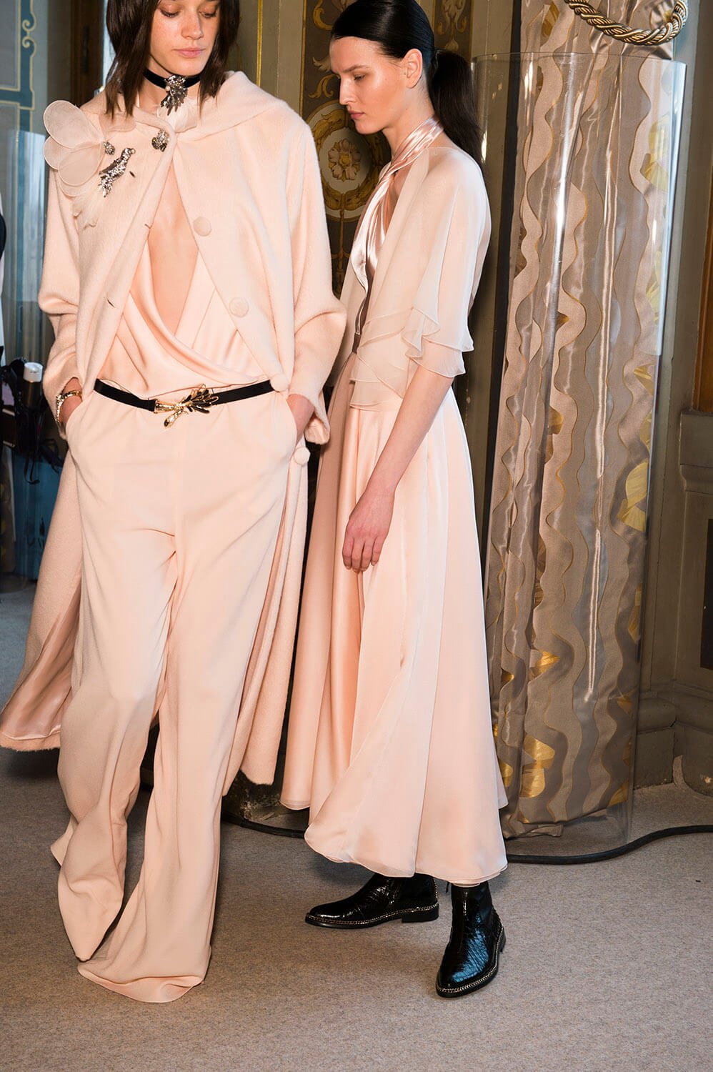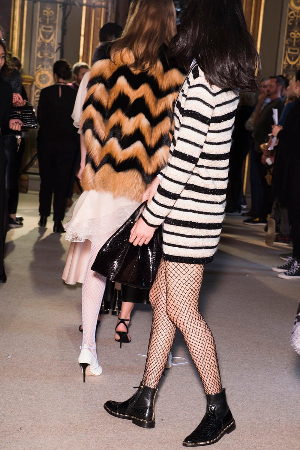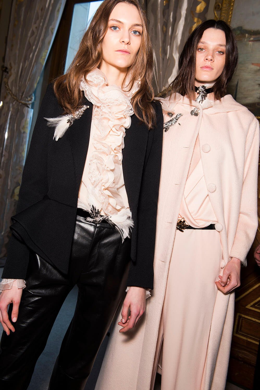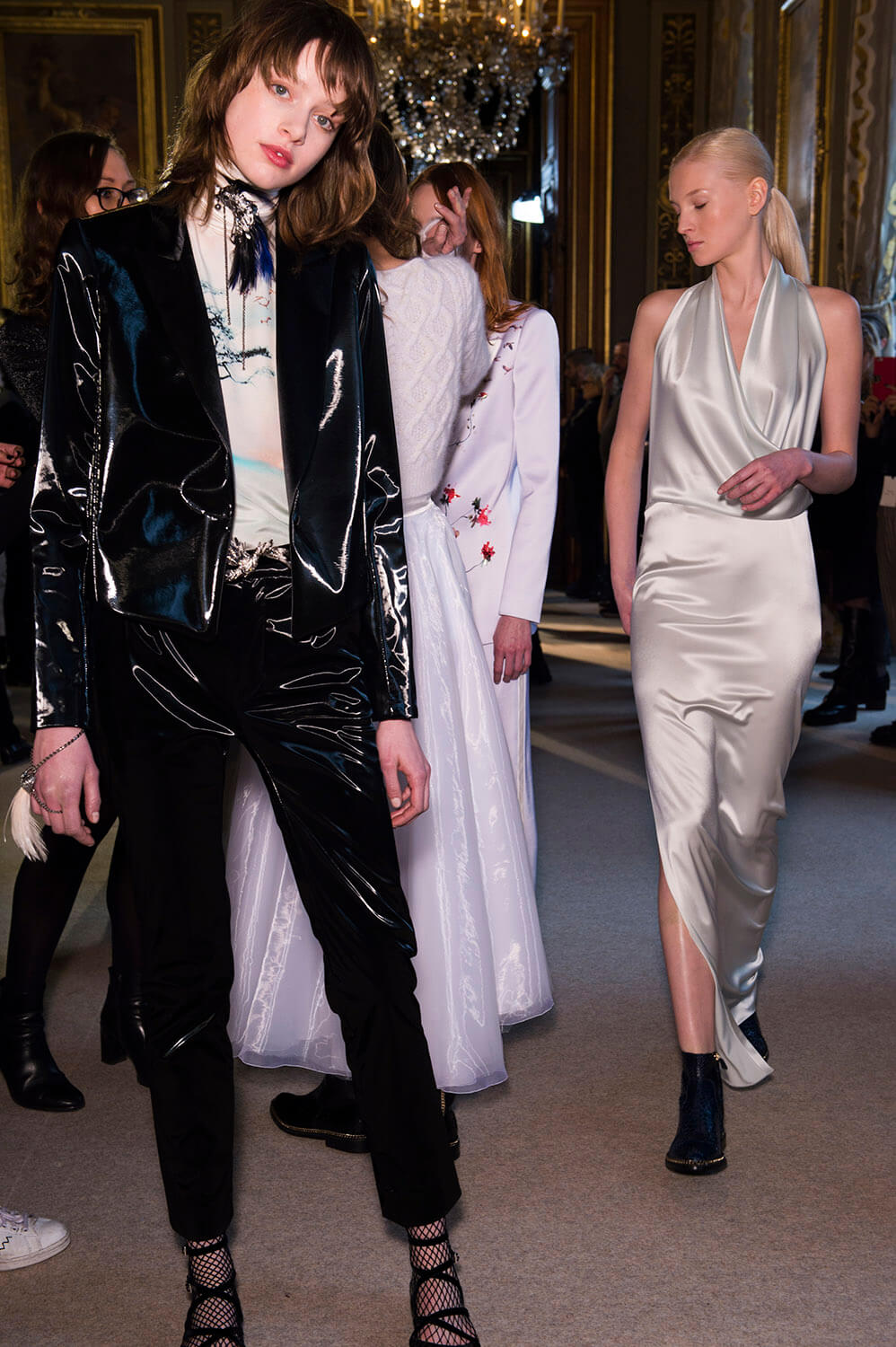 We begin, once again, with accessories. This time, we’re at Lanvin and we’re talking shoes. Obviously. We’re self-proclaimed shoe pigs. Here, they were flat. Which, being of the school of Sophia Neophitou, the higher the heels, the closer to God, would generally be a “cute for you, not for me” situation. BUT after an evening spent running, yes, running about Paris on spiky 6-inchers after numerous traffic-based incidents, those little hobnail booties were looking mighty tempting this morning. Tempting too was the rest of the collection. We’ll call it French fancy. Nothing Mr Kipling-based, more this idea of an insouciant kind of Frenchness – Parisian ladies bedecked in their fineries – silky draped dresses or those covered in ruffles, delicately sequinned tweed coats, lace and feathers. But a lady cannot survive on fancy alone – and here it was countered with a kind of boyish-ness – not only in those boots, but also this touch of masculine tailoring or the button up shirts, completed with a pussybow on the collar. All very lovely.