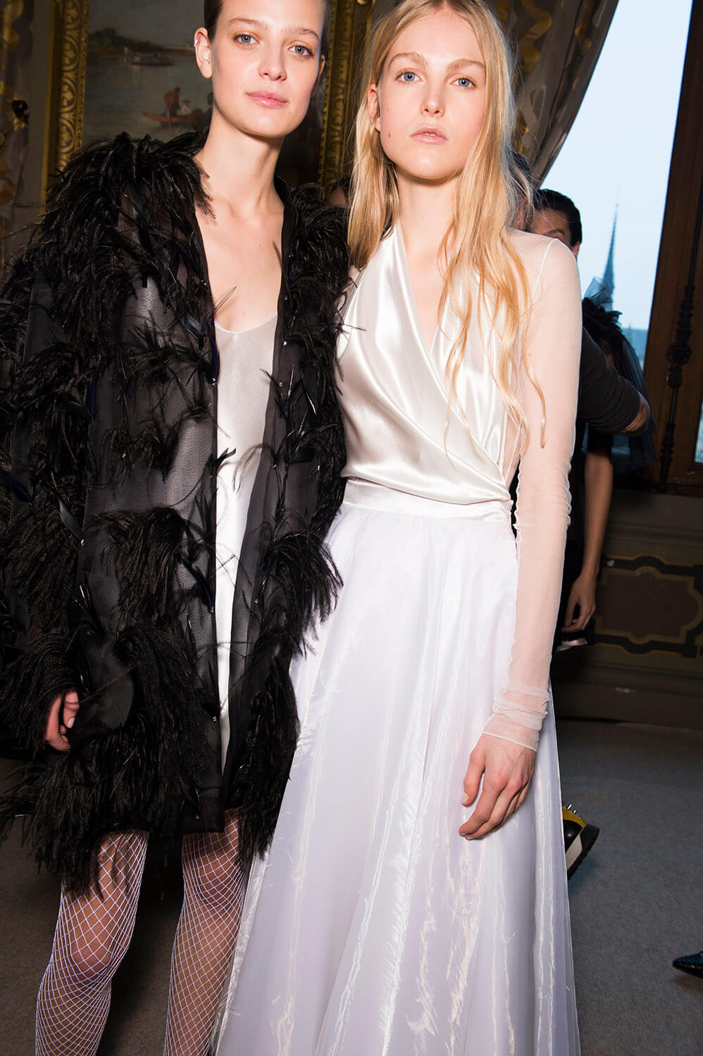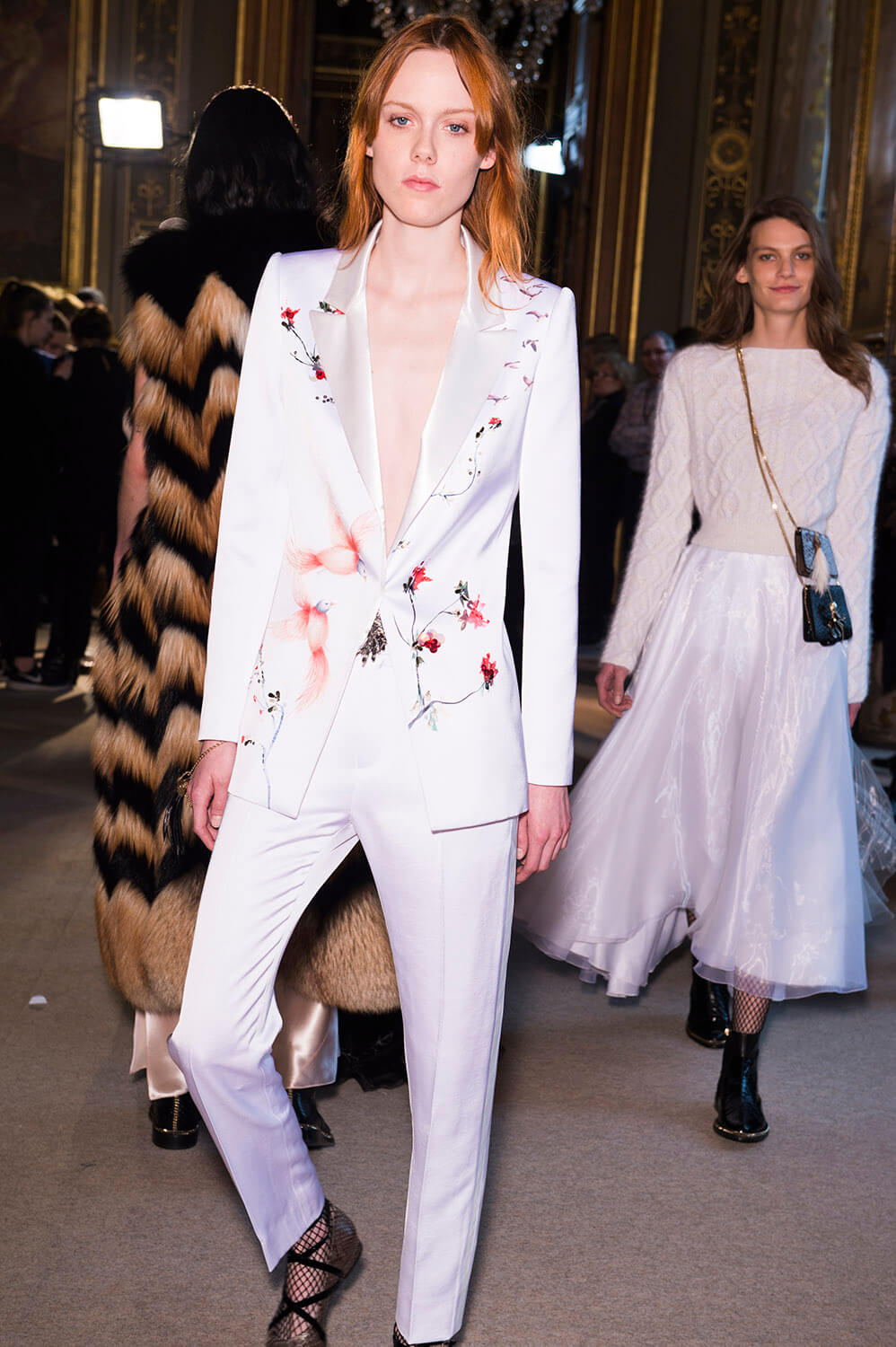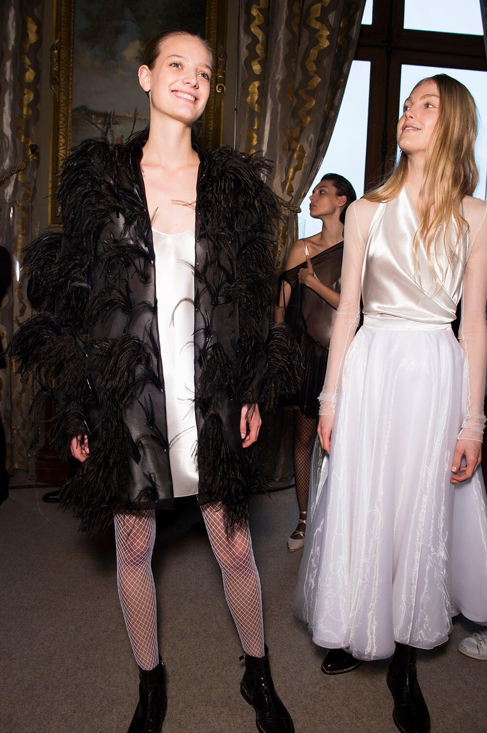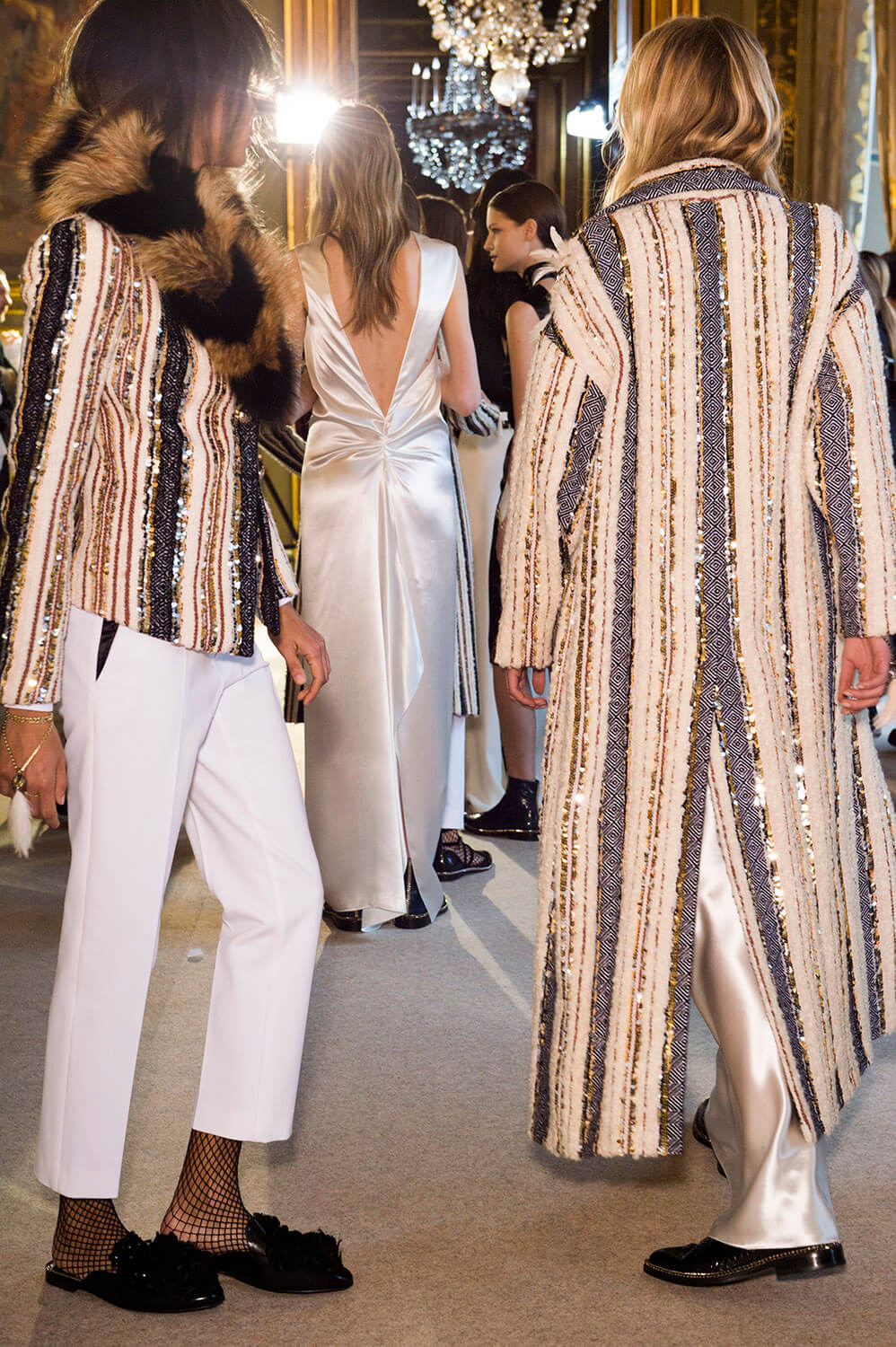 We begin, once again, with accessories. This time, we’re at Lanvin and we’re talking shoes. Obviously. We’re self-proclaimed shoe pigs. Here, they were flat. Which, being of the school of Sophia Neophitou, the higher the heels, the closer to God, would generally be a “cute for you, not for me” situation. BUT after an evening spent running, yes, running about Paris on spiky 6-inchers after numerous traffic-based incidents, those little hobnail booties were looking mighty tempting this morning. Tempting too was the rest of the collection. We’ll call it French fancy. Nothing Mr Kipling-based, more this idea of an insouciant kind of Frenchness – Parisian ladies bedecked in their fineries – silky draped dresses or those covered in ruffles, delicately sequinned tweed coats, lace and feathers. But a lady cannot survive on fancy alone – and here it was countered with a kind of boyish-ness – not only in those boots, but also this touch of masculine tailoring or the button up shirts, completed with a pussybow on the collar. All very lovely.