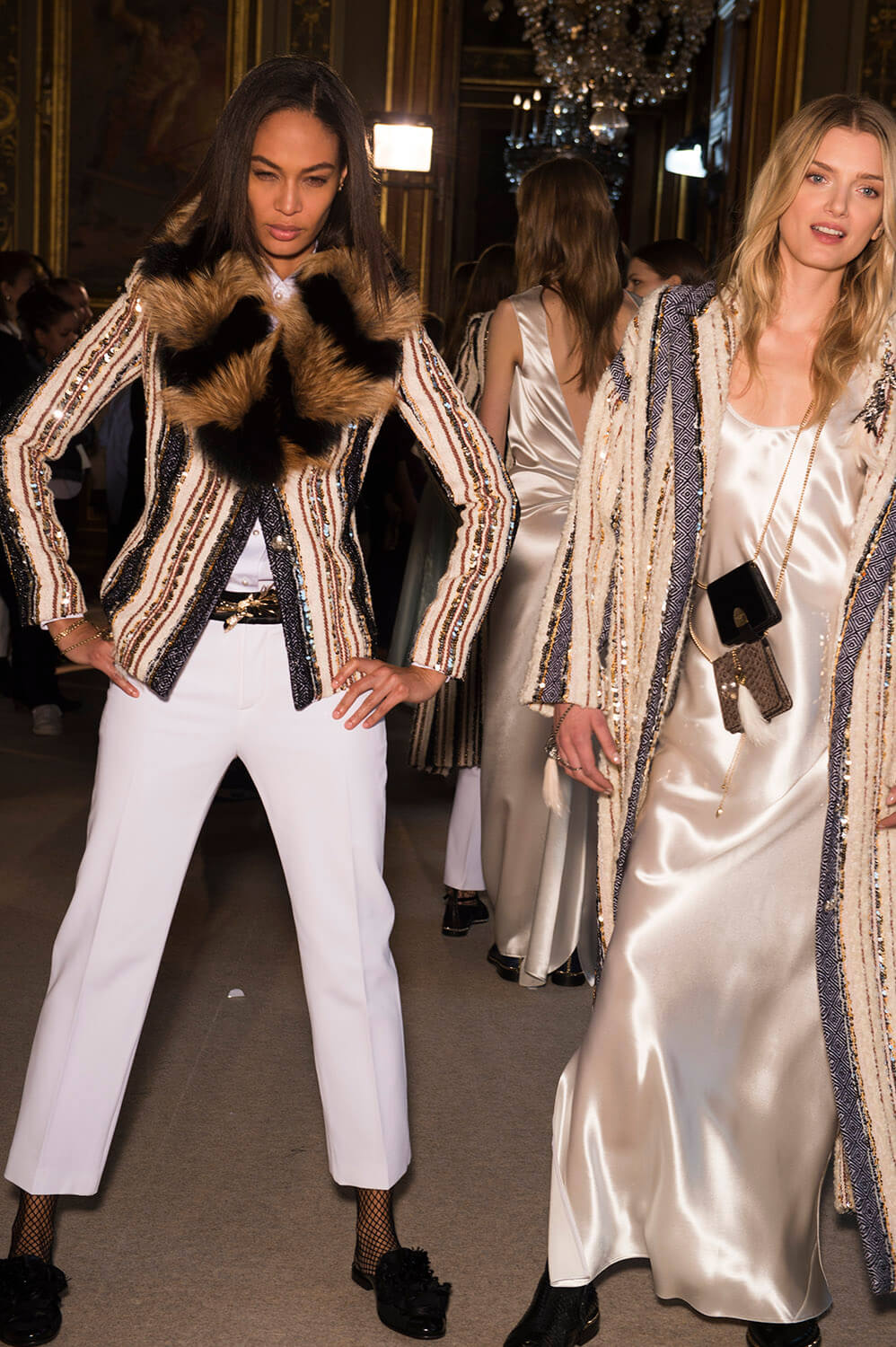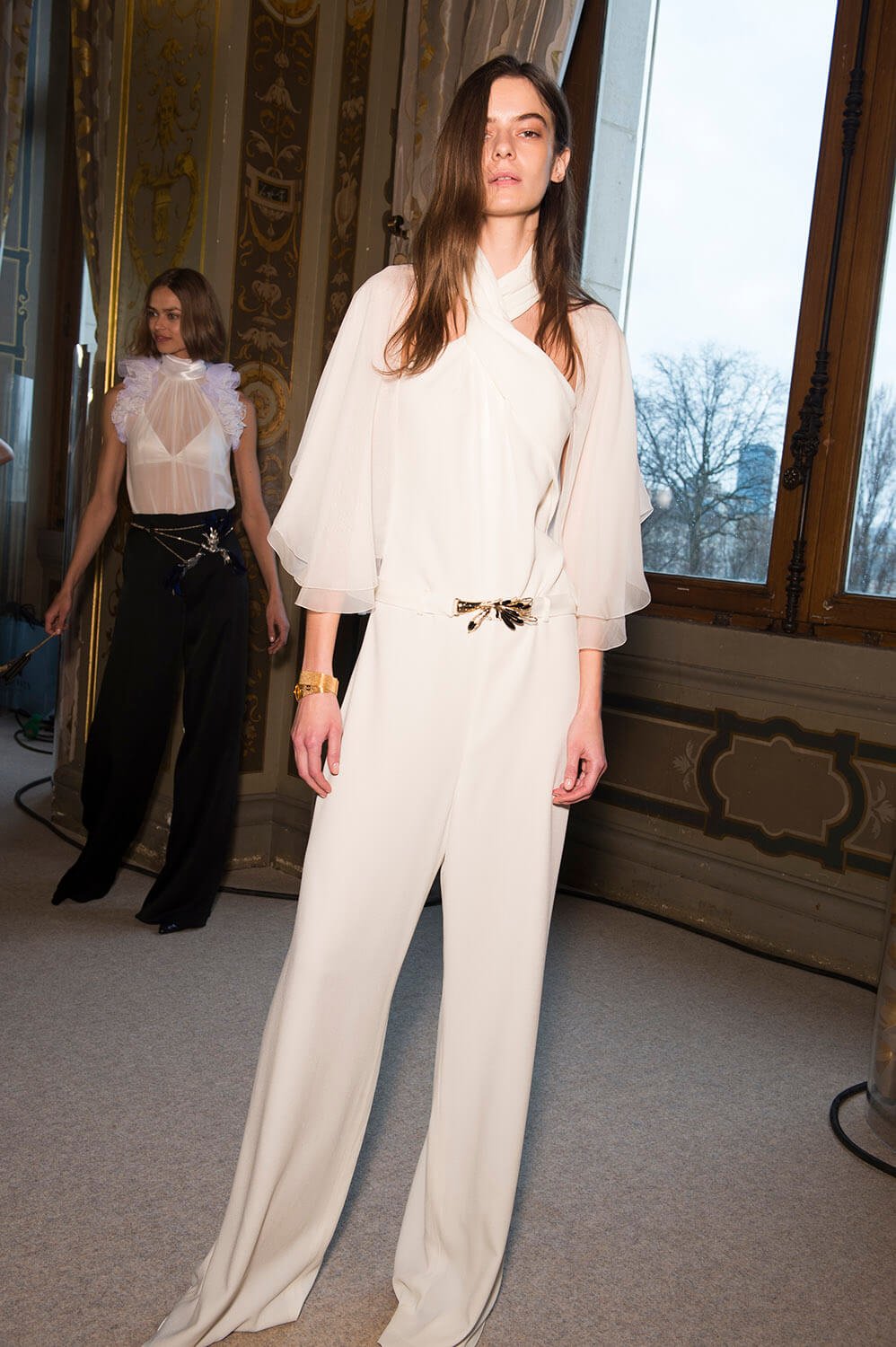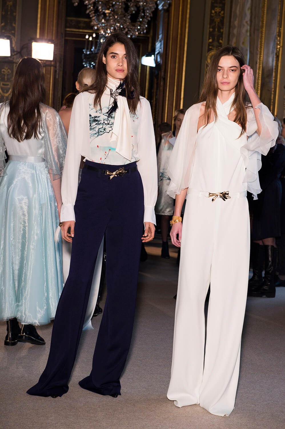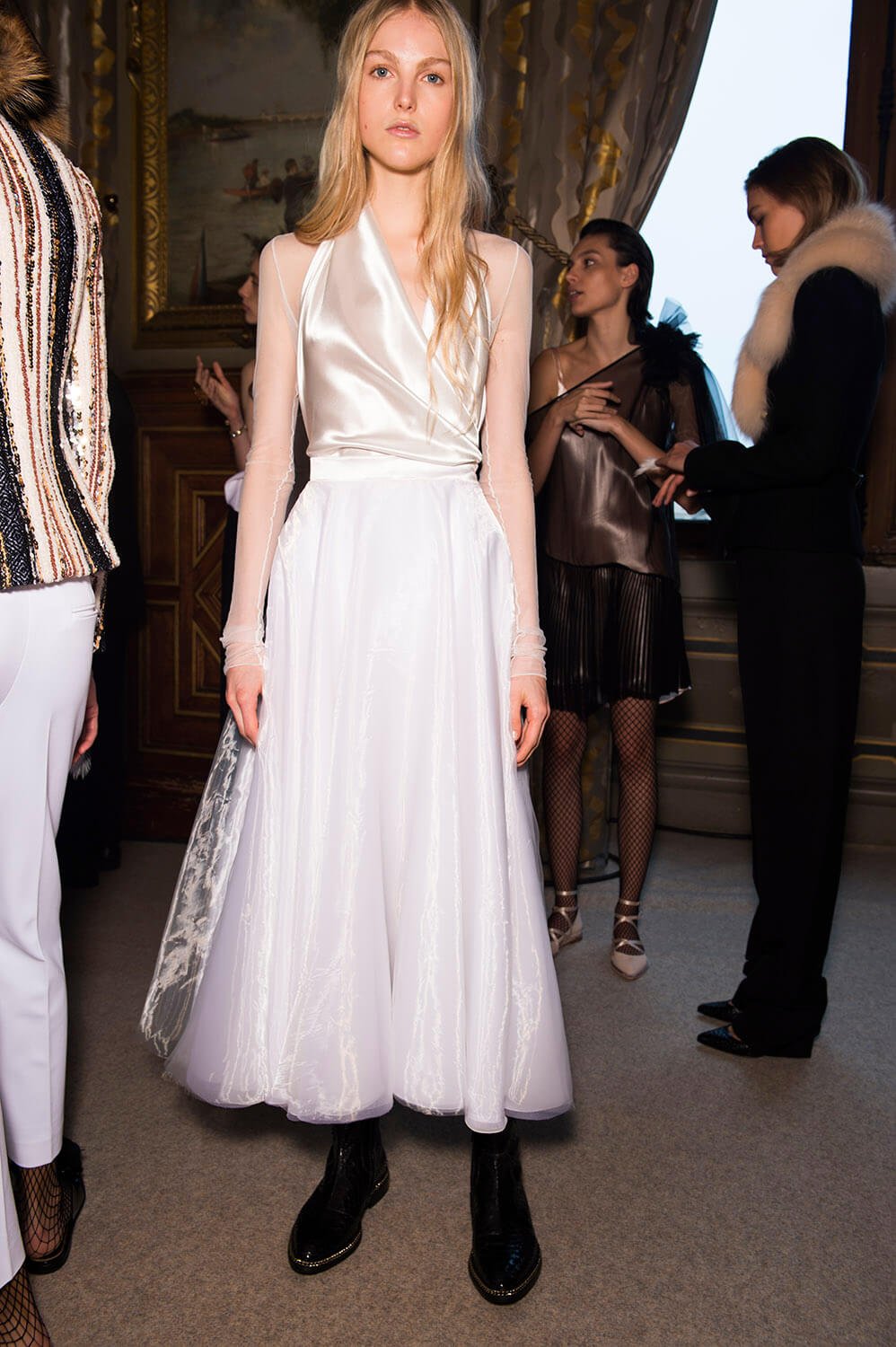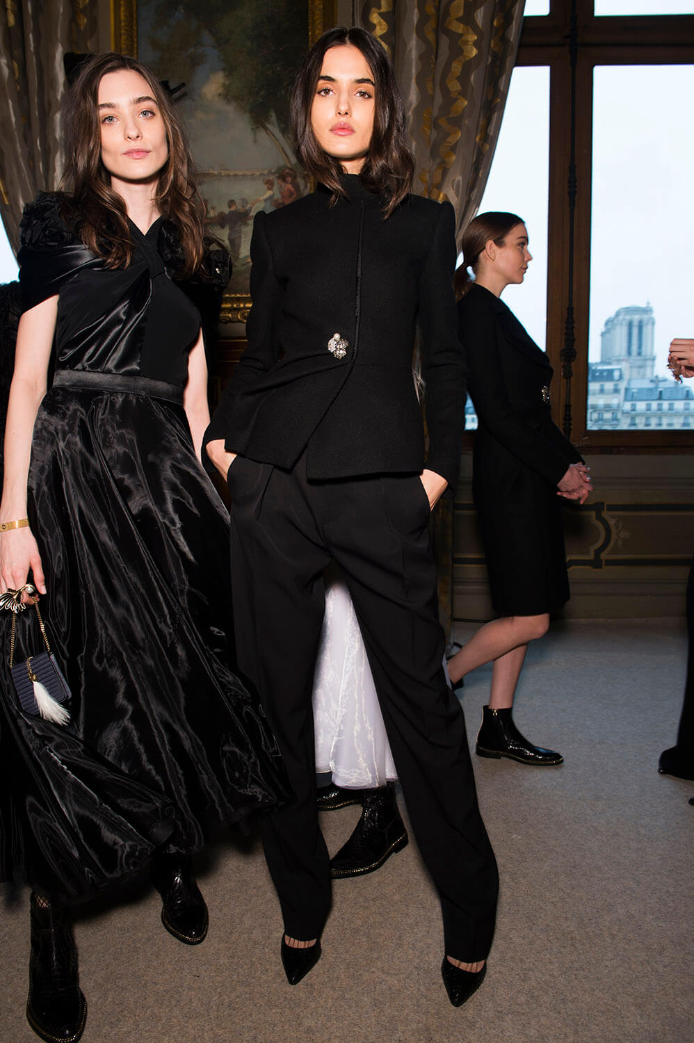We begin, once again, with accessories. This time, we’re at Lanvin and we’re talking shoes. Obviously. We’re self-proclaimed shoe pigs. Here, they were flat. Which, being of the school of Sophia Neophitou, the higher the heels, the closer to God, would generally be a “cute for you, not for me” situation. BUT after an evening spent running, yes, running about Paris on spiky 6-inchers after numerous traffic-based incidents, those little hobnail booties were looking mighty tempting this morning. Tempting too was the rest of the collection. We’ll call it French fancy. Nothing Mr Kipling-based, more this idea of an insouciant kind of Frenchness – Parisian ladies bedecked in their fineries – silky draped dresses or those covered in ruffles, delicately sequinned tweed coats, lace and feathers. But a lady cannot survive on fancy alone – and here it was countered with a kind of boyish-ness – not only in those boots, but also this touch of masculine tailoring or the button up shirts, completed with a pussybow on the collar. All very lovely.