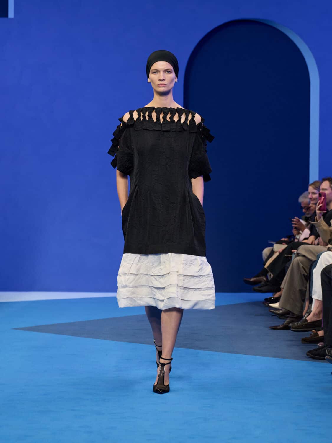 If his debut earlier this year was about grounding himself in Lanvin’s legacy, this outing felt like a loosening of the shoulders. Copping stepped confidently into exploration, reframing Jeanne Lanvin’s codes with a freshness that never tipped into fuss. There was a lightness at play, from chiffon-veiled cabochons that softened embellishment to linings flipped outwards on tailored jackets, exposing the construction process with a sense of ease rather than severity.