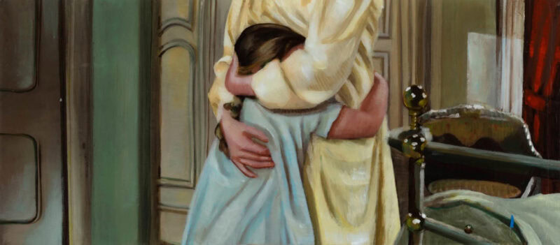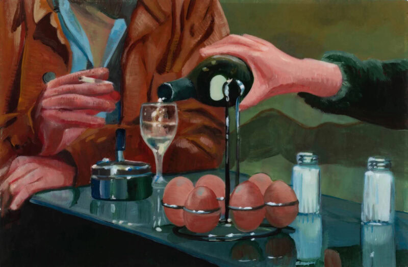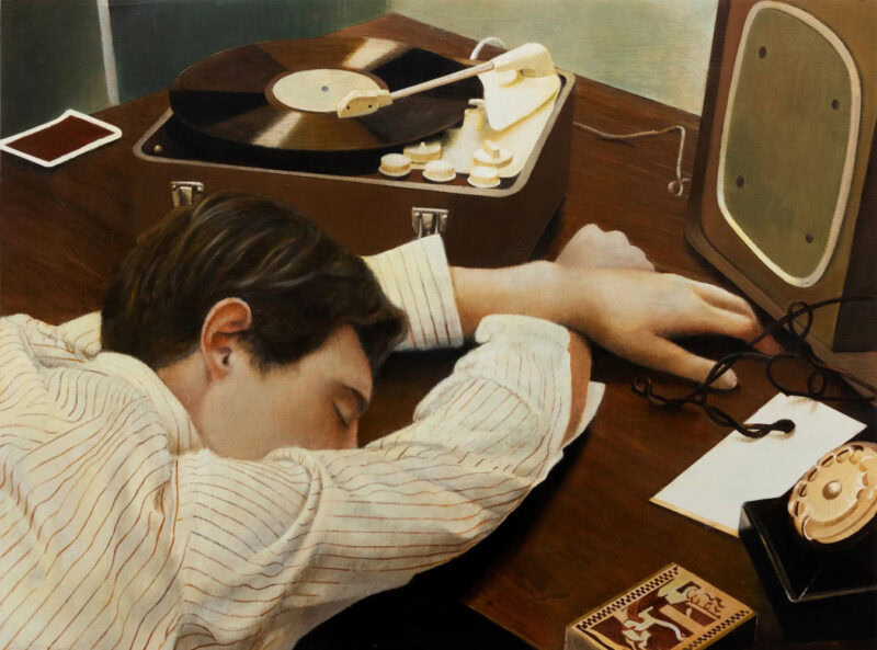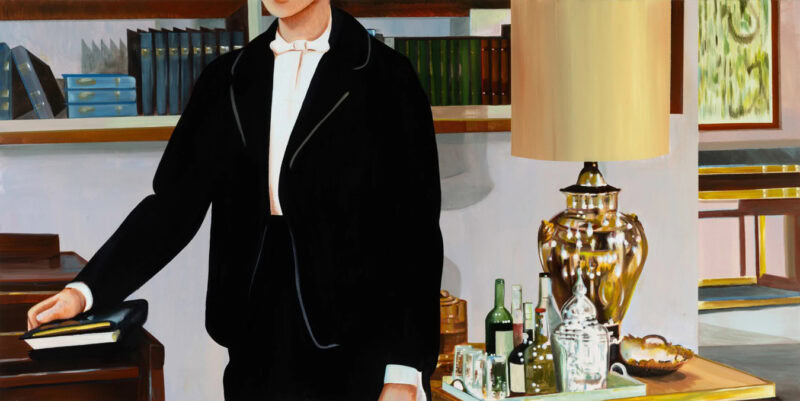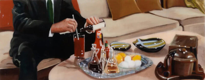 Indeed, I suggest that some of his works offer a childlike awe, an early fascination with the mysterious magic of adult objects in domestic environments: the elegant designs of labels in a bar cabinet; the ritual of laying place settings for a dinner party; glinting boxes of cosmetic products and shirts, ties, pearl necklaces and quilted handbags out of reach. “I’d say that my paintings come from a melodramatic, ‘baby’ perspective, like an adult person who can’t emotionally pull themselves together,” he muses.