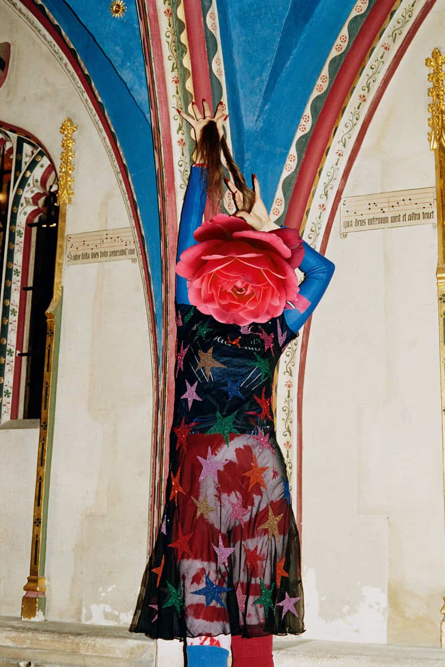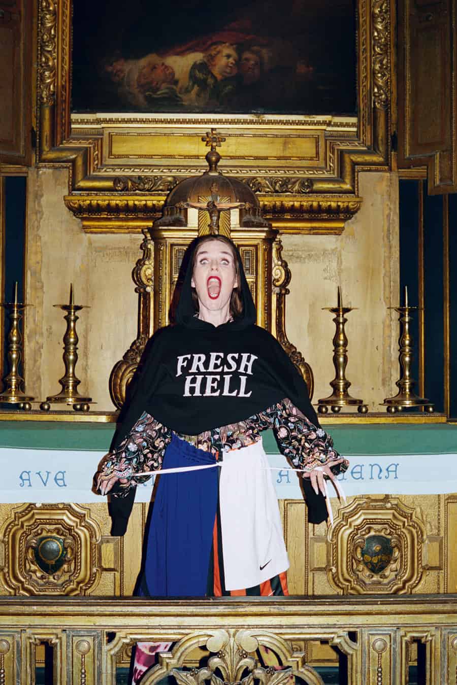 Linder says she isn’t happy in front of a camera, “although I know from working with photographic images how a human body sits within a rectangle of glass.” But she has been photographed by Paolo Roversi and Tim Walker, for example, so she’s experienced working with the medium’s most revered auteurs. For the shoot on these pages, with Linder wearing Ashish at St Mary Magdalene’s Church in Paddington, photographer Hazel Gaskin directed her subject to throw her head back, scream and laugh, break the silence of a space usually defined by contemplation and stillness. “In one of the shots I am wearing the top that says, ‘fresh hell’. It comes from the Dorothy Parker quote: ‘What fresh hell is this?’, which was her response to the phone or doorbell ringing,” she says. “The news cycle makes us feel like that the whole time now. Total anxiety. I’m 71 and this feels like the most fragile time for the planet I’ve experienced.”