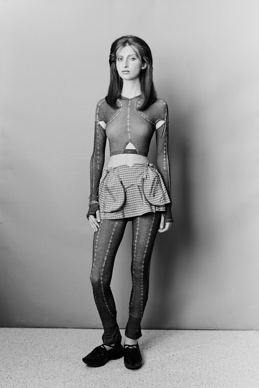 That clarity was on full display in their SS26 collection, which they presented in Milan alongside a Nike collaboration (the brand has also teamed up with Jean Paul Gaultier, Miss Sixty and G-Star). The aim was integration, not spectacle. “We didn’t want it to feel like product placement,” Knowles says. Instead, they created a unified vision of “lux athleisure” filtered through Knwls codes. Nike’s footwear echoed 16th-century court shoes with corseted lacing, while garments combined bonded seams, neoprene techniques and sculptural denim inspired by girdles and wetsuits. Past and future were pushed deliberately far apart – and held there.