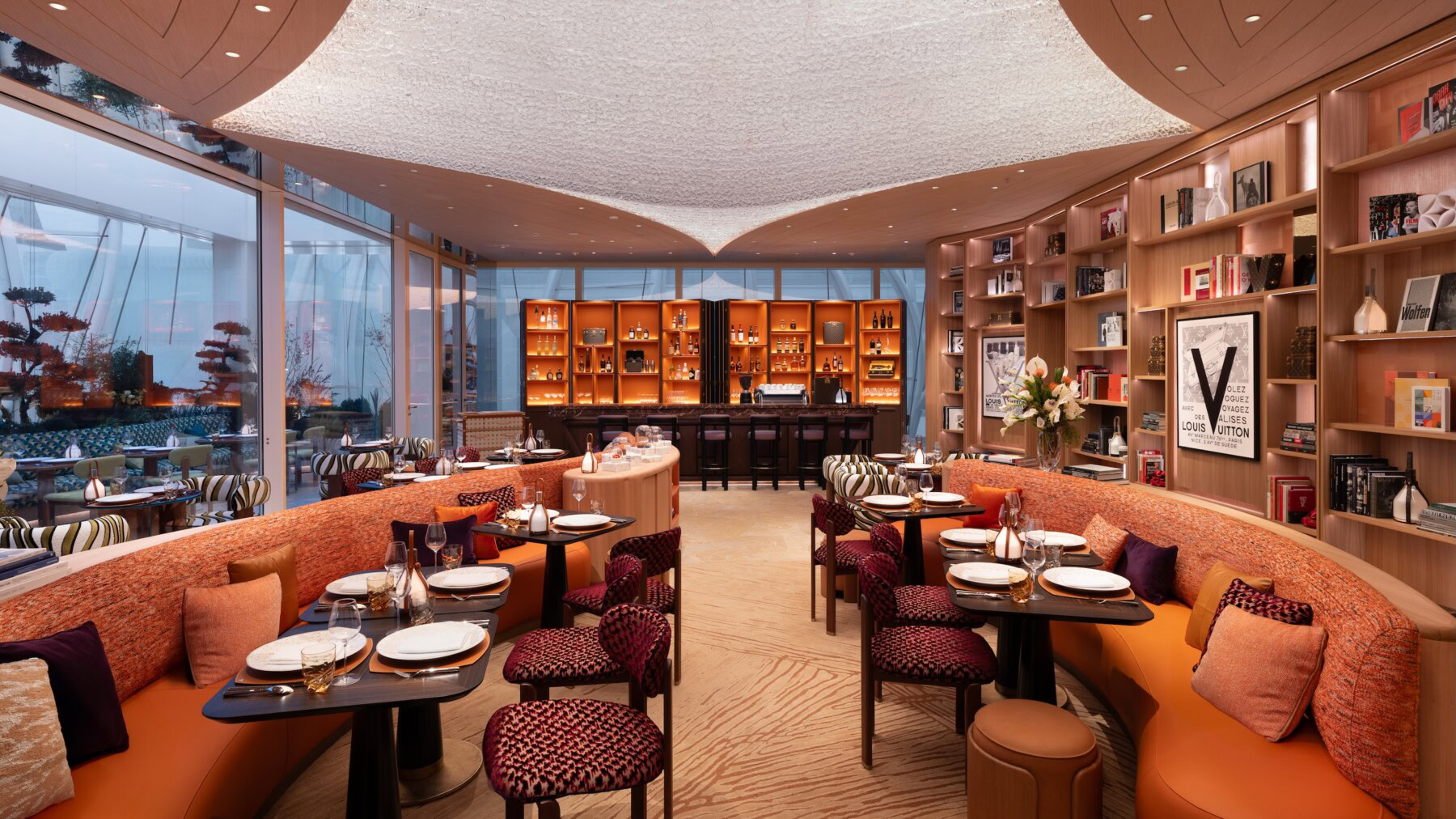 At the top, the mood changes again. A mirrored “infinite room” filled with books and objects acts as a transitional space before leading into the Louis Vuitton Café – the brand’s first in Beijing. Run by chef Leonardo Zambrino, the café offers lunch, afternoon tea and dinner, with a menu tailored to the city, and includes outdoor dining areas and a rooftop terrace scheduled to open seasonally. The eatery is available for booking on its WeChat Mini Program.
