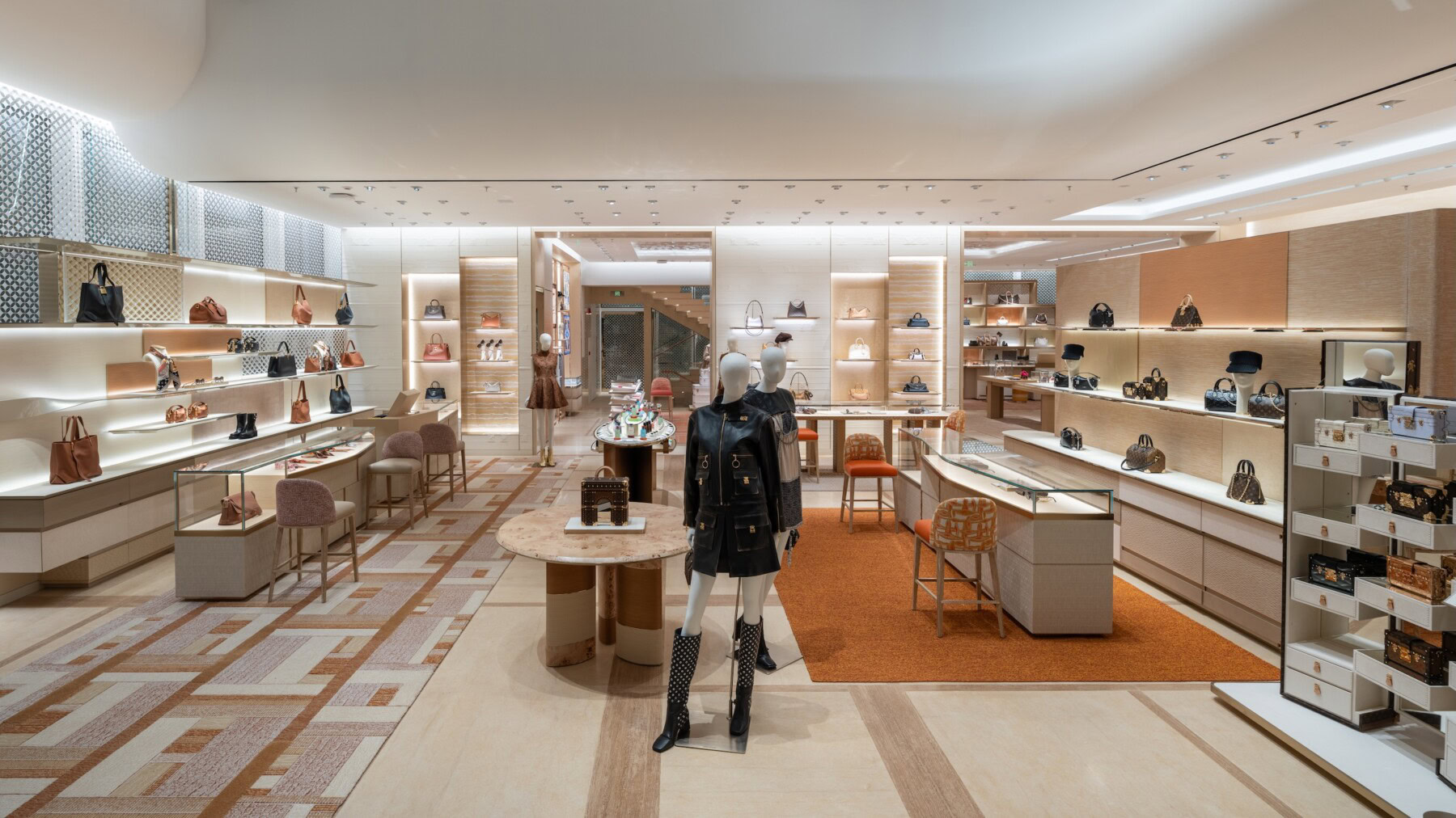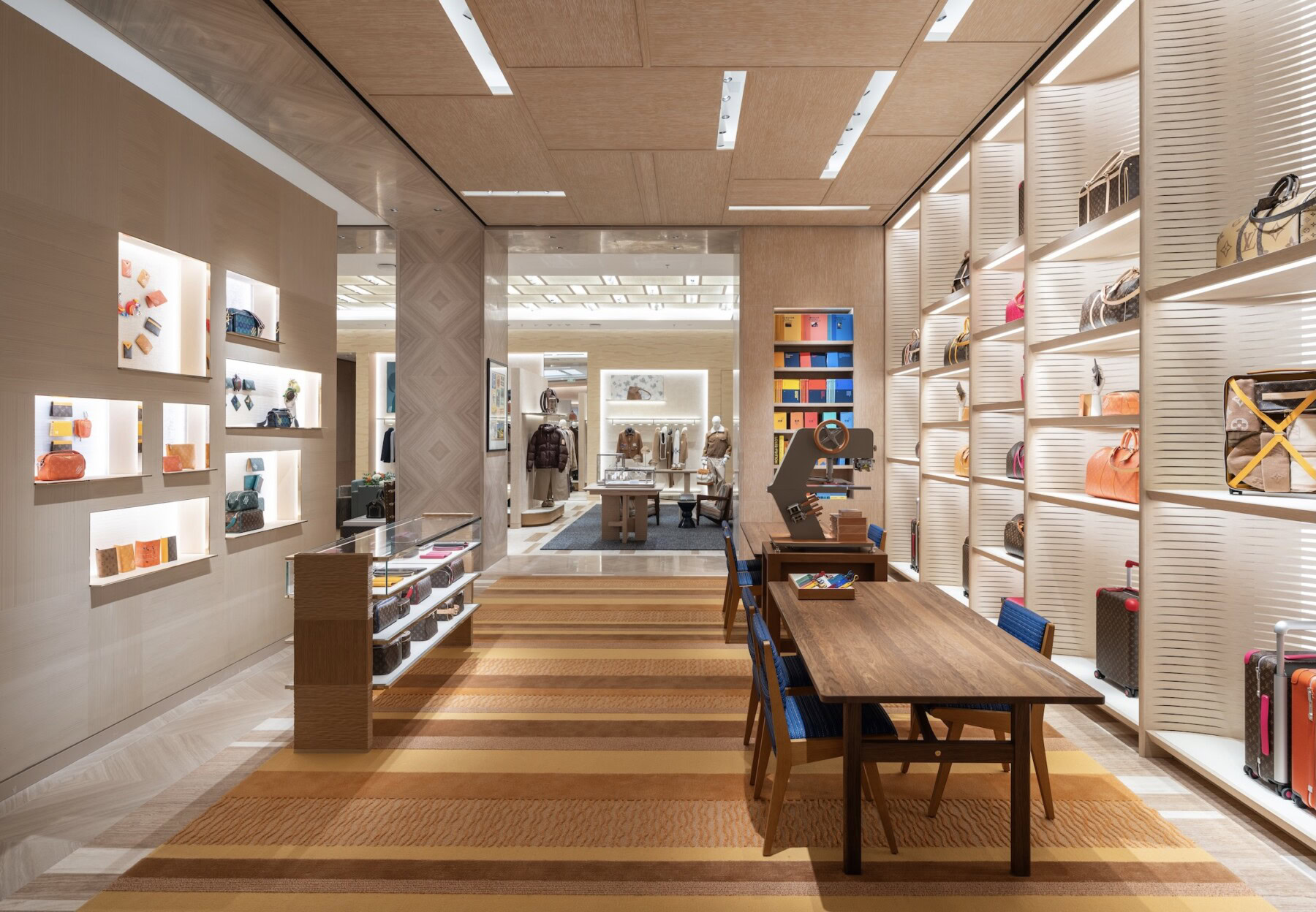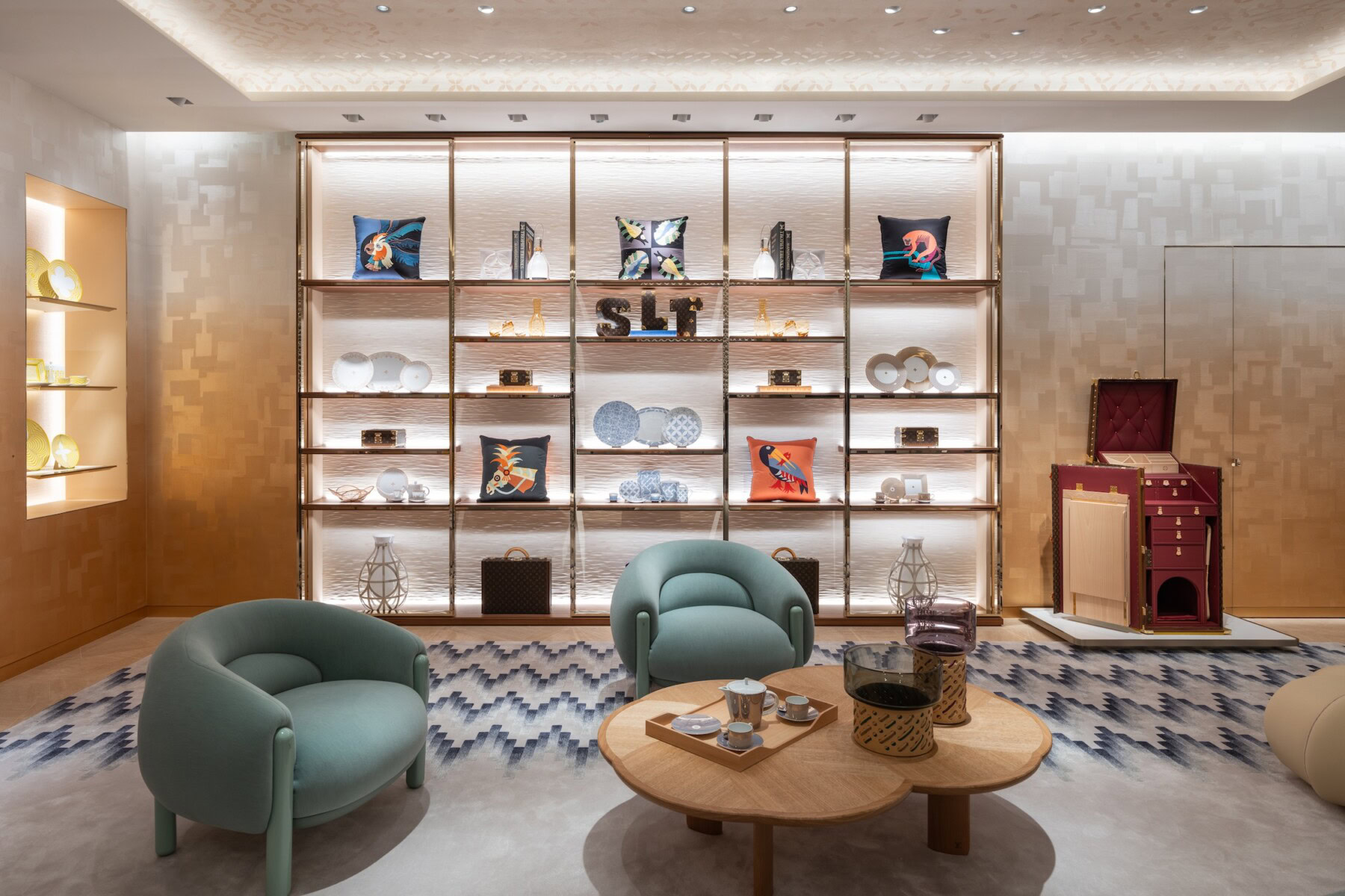 Inside, the store is organised as a continuous vertical sequence designed by Vuitton’s in-house architecture team. Womenswear and women’s leather goods and accessories dominate the first and second floors, sharing space with the Chinese launch of LV Ombres, which takes a prominent position on the ground level. The lower ground floor is given over to men’s collections, pet accessories and the brand’s hot-stamping service which remains a consistent draw for local clients.